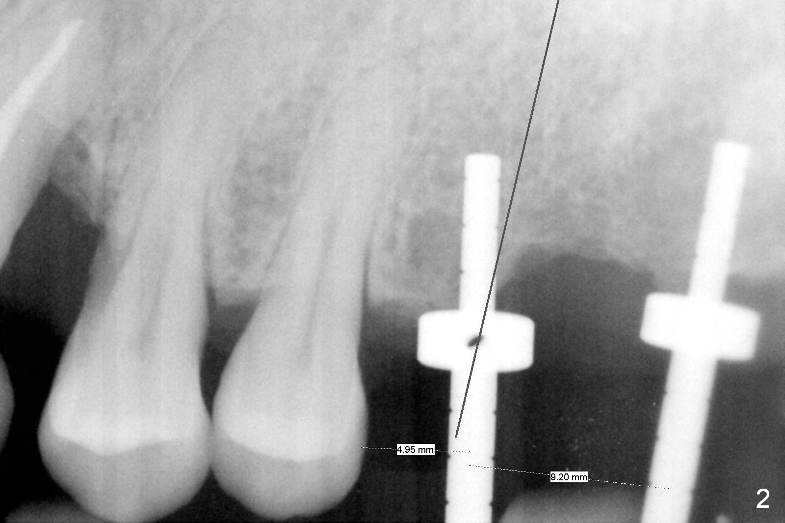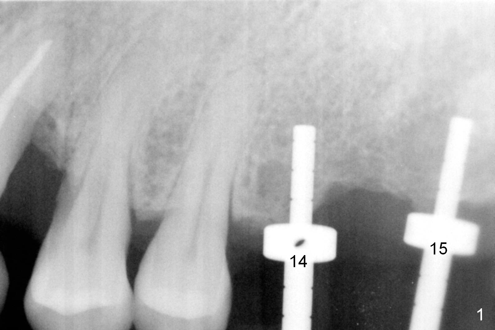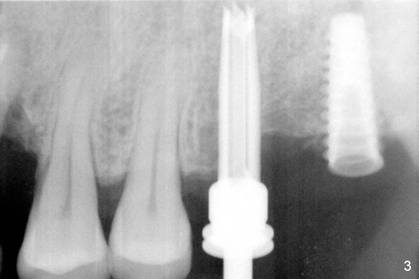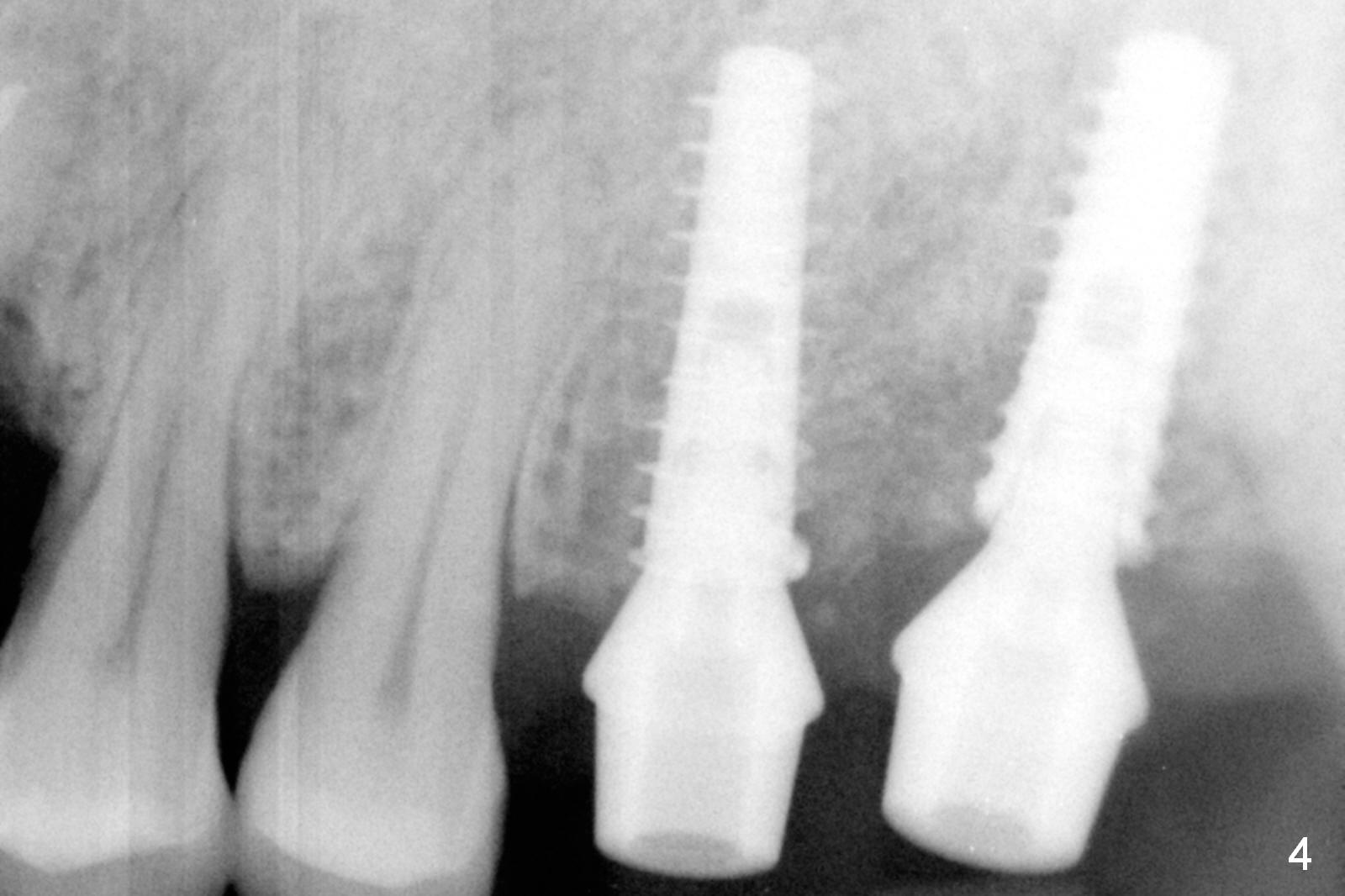 As shown by CT, the ridge at #14 is narrower than that of #15 (confirmed after incision), whereas the density at #14 is higher than that of #15. The osteotomies are established by combination of magic osteotomes and drills after change in trajectory (Fig.1-3). Following placement of 4.5x13 and 5x13 mm IBS implants and 6x4(3) and 6.5x4(3) mm pair abutments at #14 and 15 (Fig.4), flaps are sutured for hemostasis. Since the patient does not tolerate the surgery too well (unstable hypertension and oozing), immediate provisional is delayed. Periodontal dressing is applied instead. While the implants are healing, porcelain chips at the upper anterior bridge. There appears no bone resorption 6 months postop (Fig.5). Impression is taken following changing abutment to 5x4(2) mm at #14 and Diode gingivectomy. A panoramic film is taken 1 year 2 months post cementation. CT taken 2 years post cementation shows relatively good trajectory of these 2 implants (Fig.6,7).