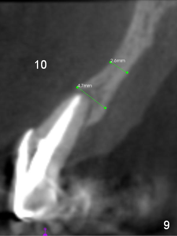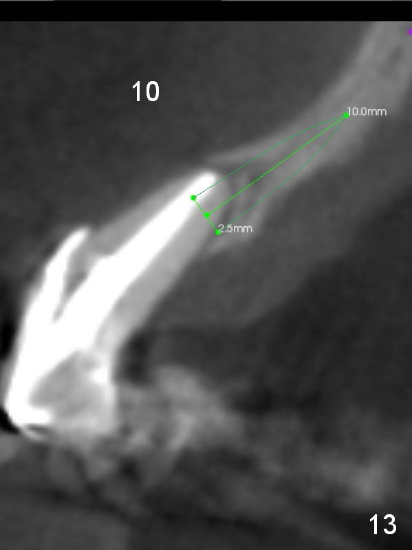 The ridge at #10 is narrow in spite of the fact that the tooth is present (Fig.9). The 2.0 or 2.5 mm implant at #10 should be placed (Fig.13).