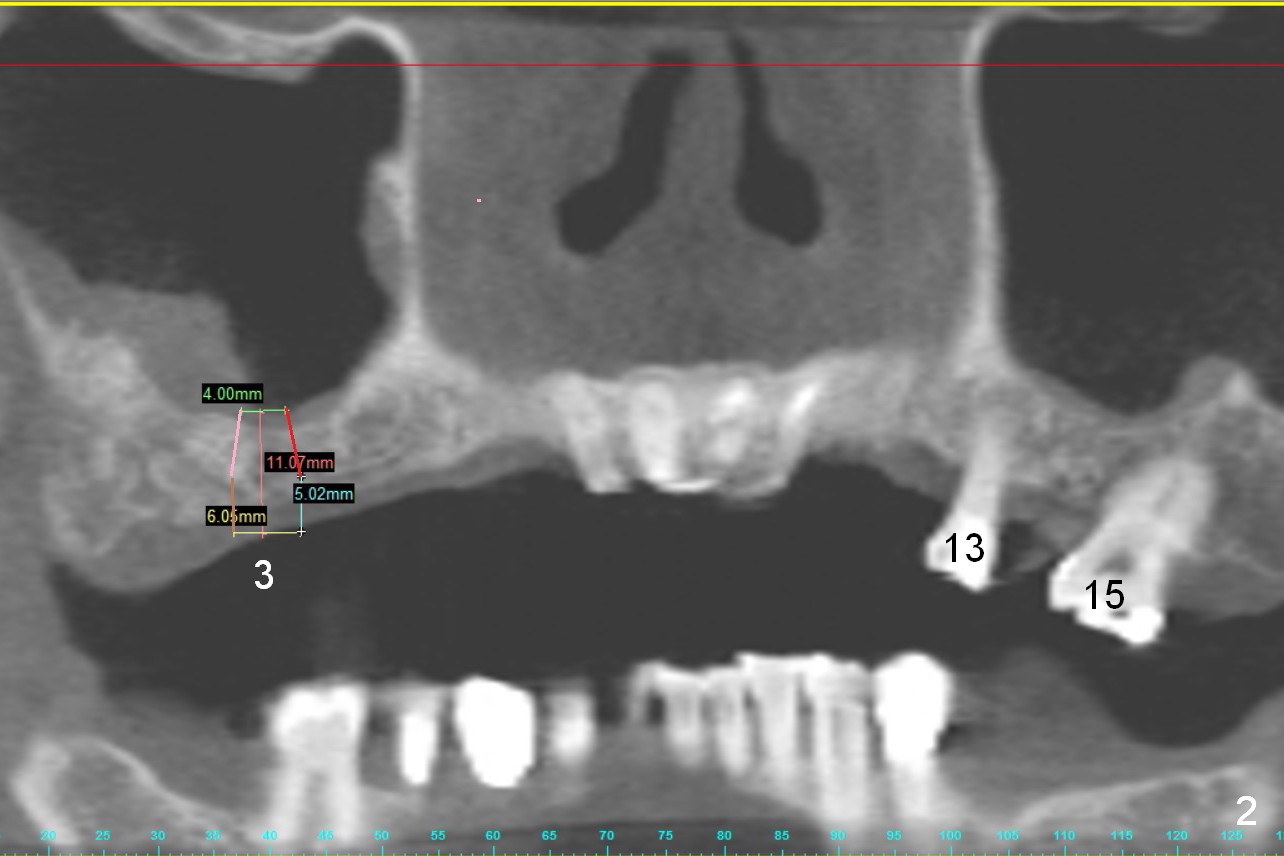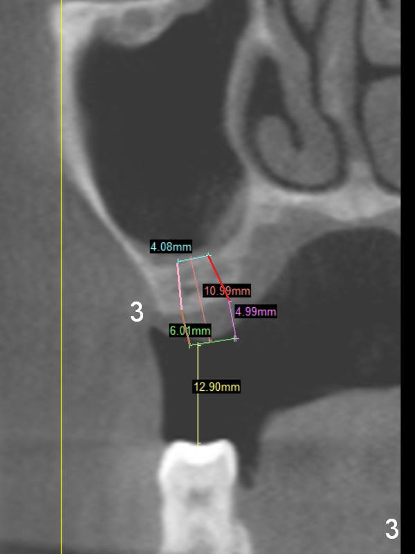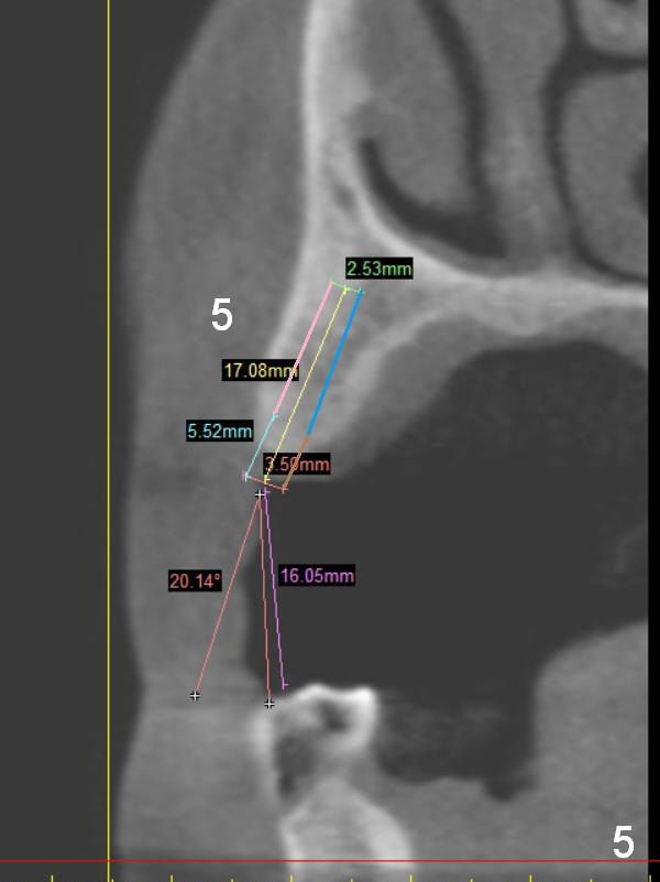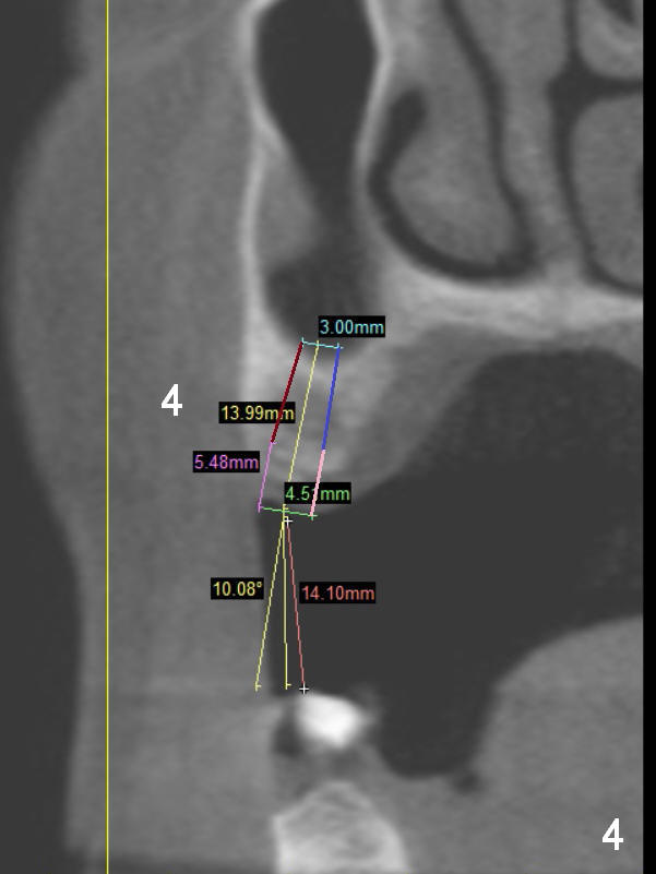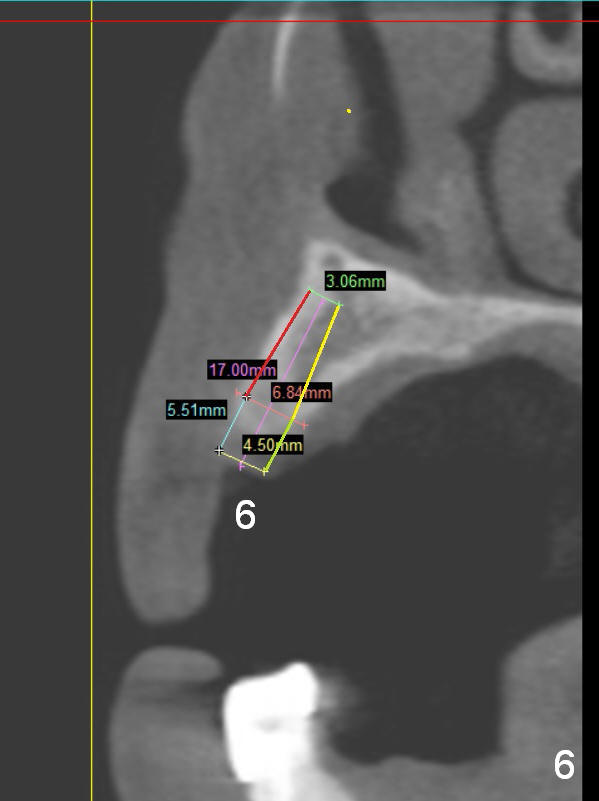 A 68-year-old lady has several missing teeth (Fig.1,2). She has agreed to have an implant at the site of #3 (Fig.3) to stabilize an upper removable partial denture (RPD). The latter will be more stable if an extra implant is placed at #6 (Fig.1,2,6). There is enough bone to place implants at #4,5 (Fig.4,5). Bone density at these sites is low. Osteotomy should be underprep with bone condensation. Edentulous space is high so long abutments are required (9 mm instead of 3 or 5 mm (regularly used)). Angled abutments should be prepared.