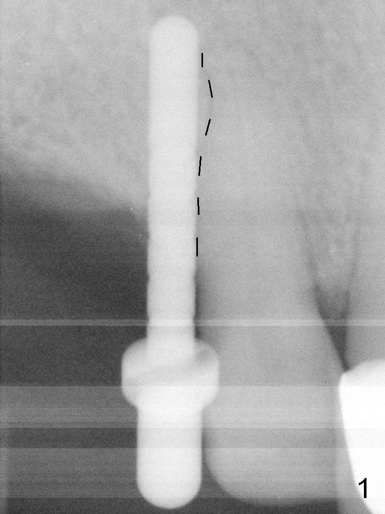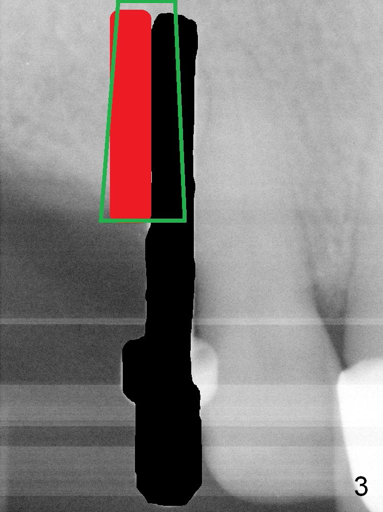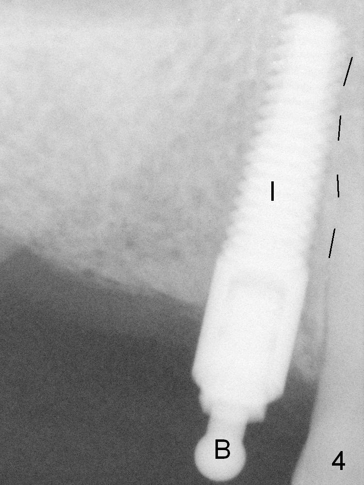 After initial osteotomy at the site of #6 with a 2 mm pilot drill at 11 mm, a parallel pin is inserted (Fig.1). It appears close to the neighboring root (dashed line), although it does not look so close clinically. When the parallel pin is removed (Fig.2 black area), the osteotomy is moved distally (red area) with a Lindamann bur. Then the osteotomy is deepened and enlarged (Fig.3 green area). When a 4x17 mm tissue-level implant is placed (Fig.4 I), a ball abutment (A) is inserted without enough clearance. The clearance with a ball abutment at the site of #3 is also not sufficient. It appears that crowns have to be fabricated prior to fabrication of the upper removable partial denture.