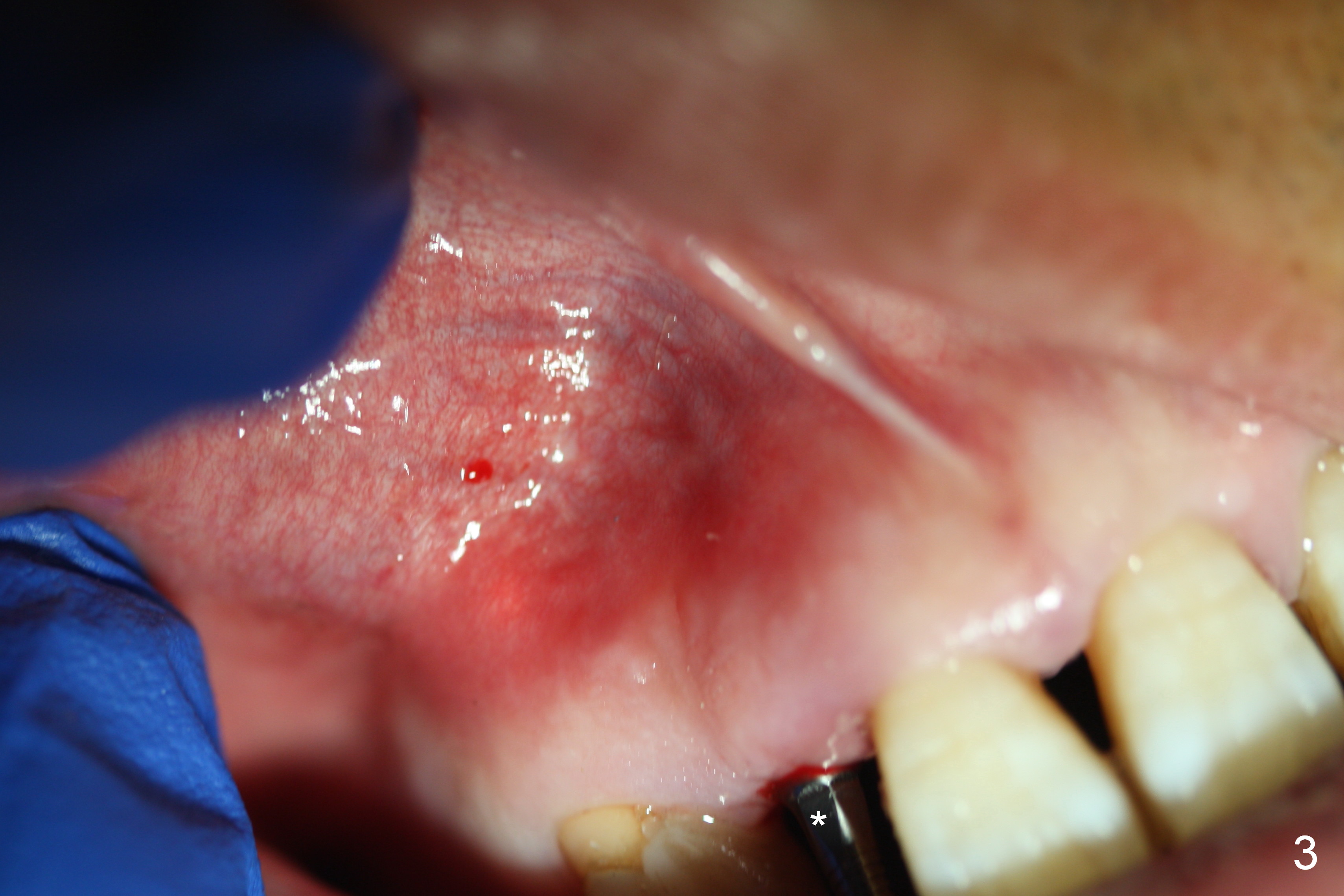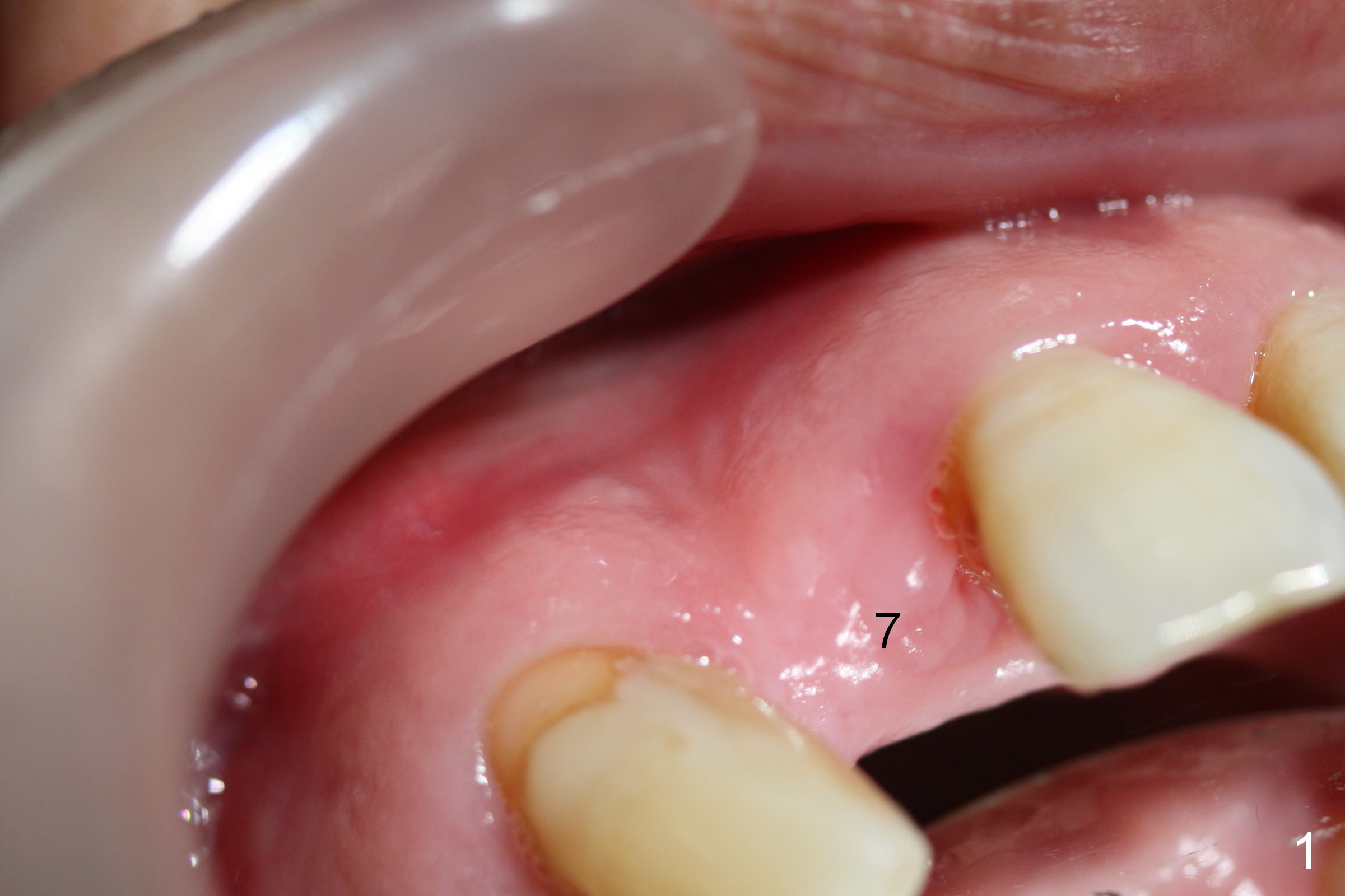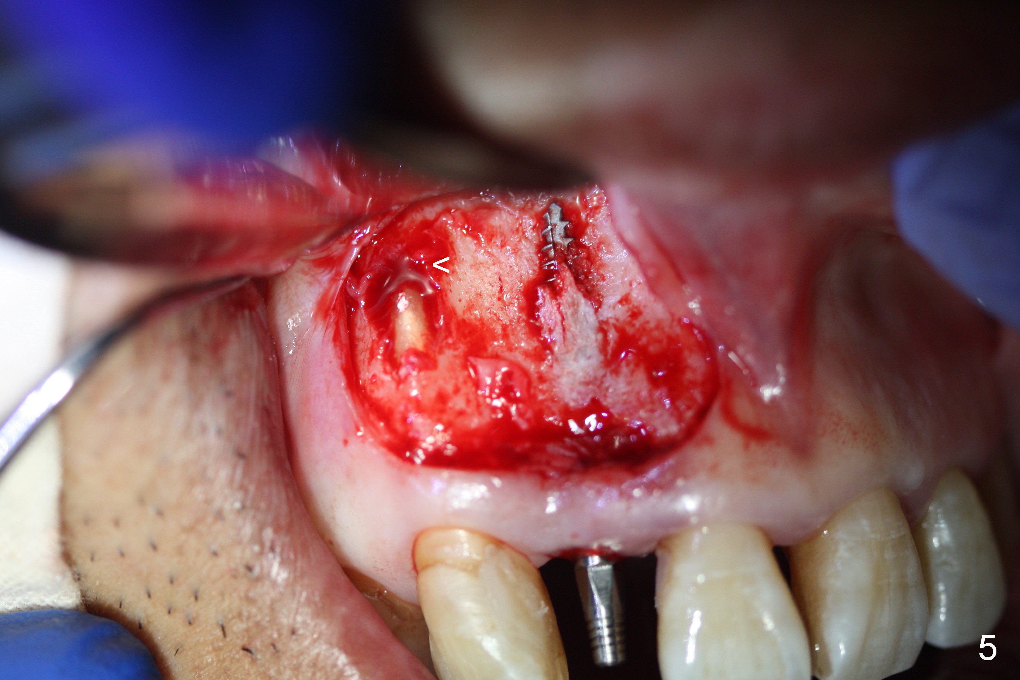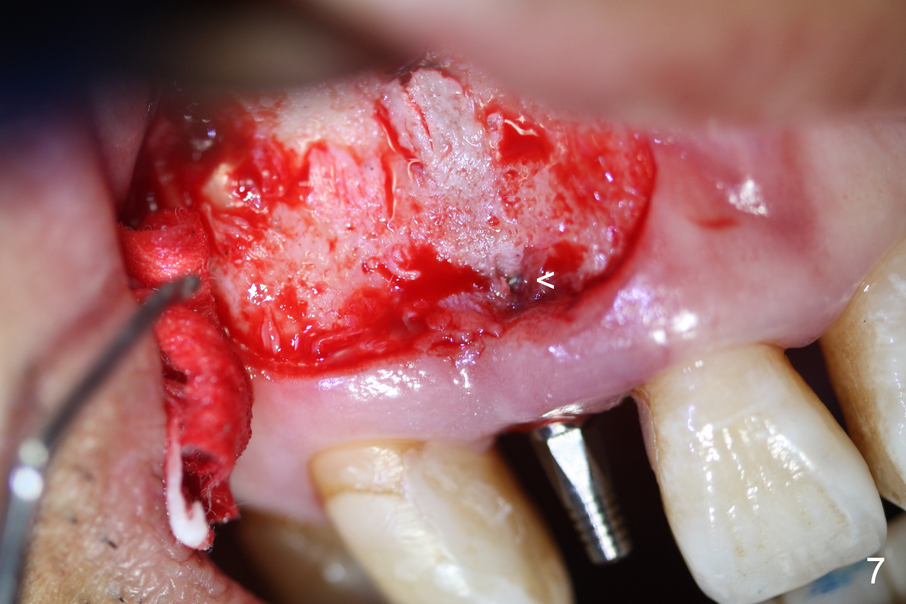 Preop exam shows the apparent wide ridge at #7 (Fig.1). What is ignored preop is the concavity in the apical buccal region (Fig.2 *). When a 3x16(4) mm 1-piece implant is being placed (Fig.3 *, flapless), the apical buccal plate vibration is felt. The biggest mistake is that initial osteotomy is ~ 6 mm shy of the implant length, partially because of 6 mm gingival height. Since the tooth #6 is symptomatic after RCT with paste overfill (Fig.4 >), apicoectomy is contemplated at #6 with exploration of the buccal plate at #7 (Fig.5). Since the implant appears to be long enough, implant apical resection is performed (Fig.6). Since there is coronal thread exposure due to previous periodontitis (Fig.7 <), bone graft is placed in these 3 defective areas after decortication.
