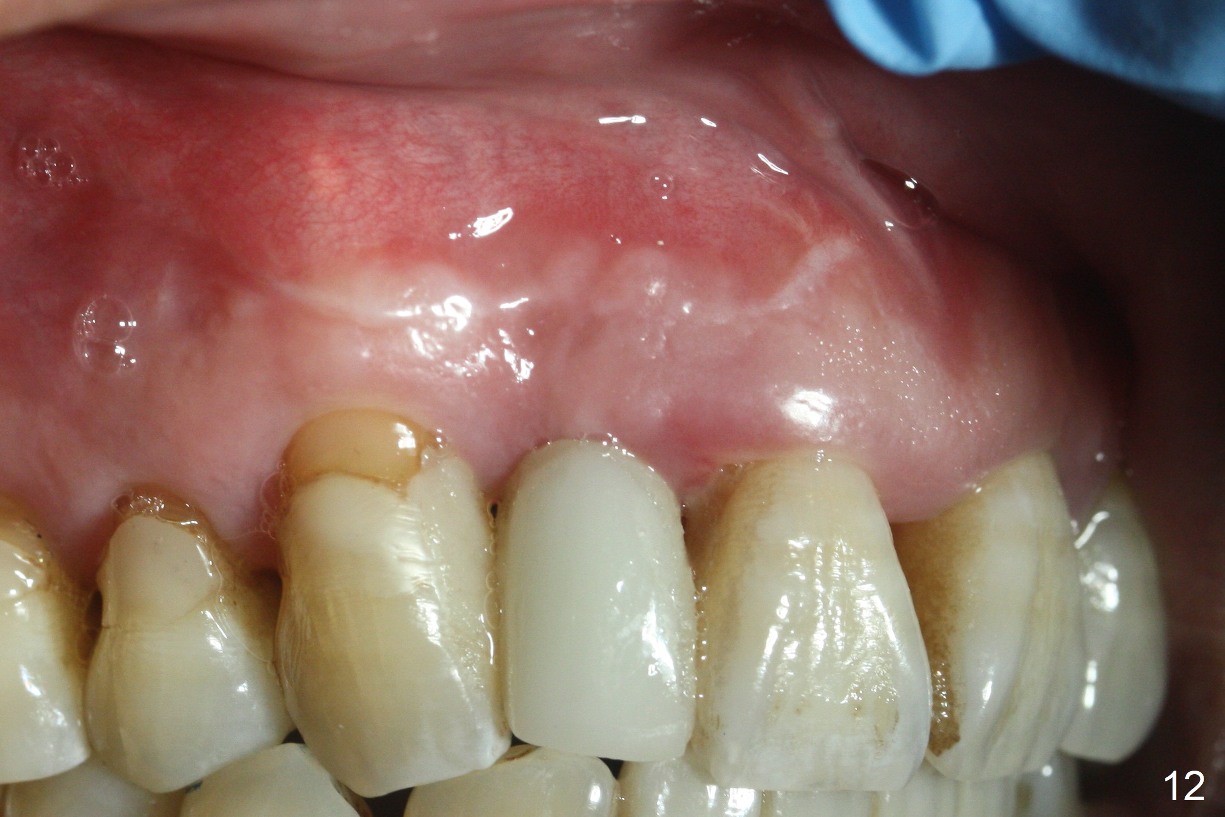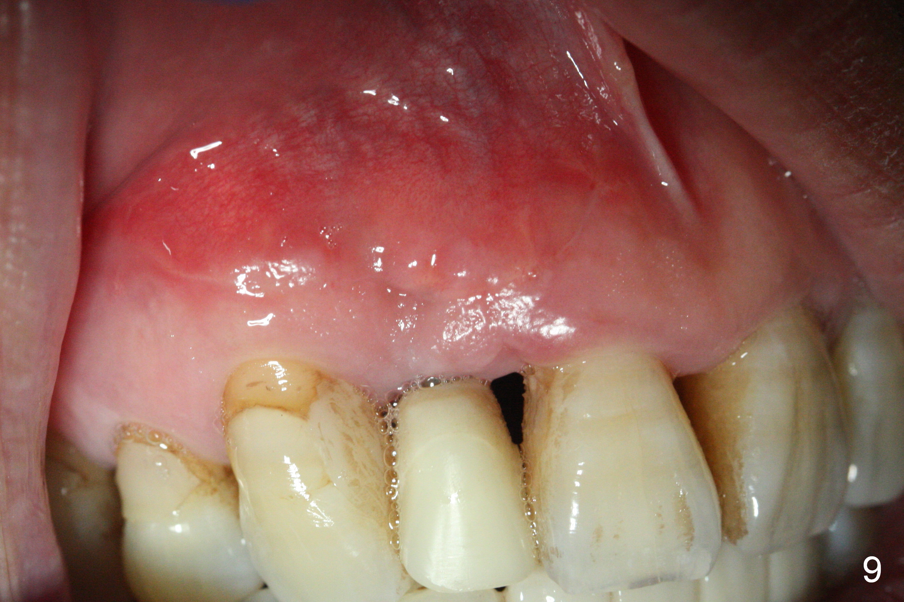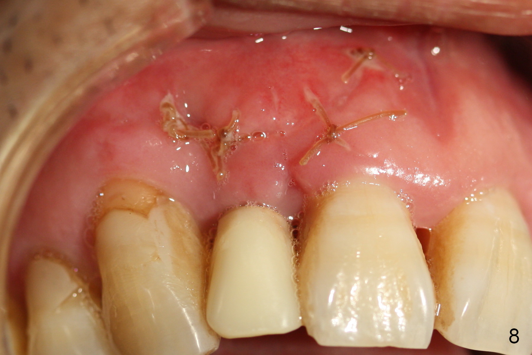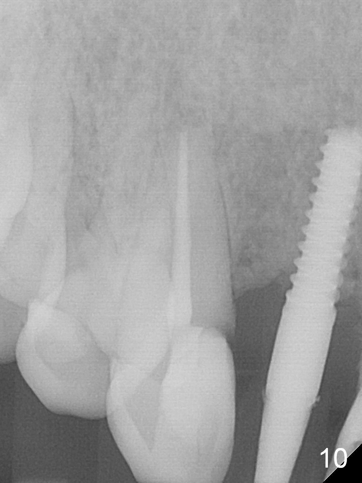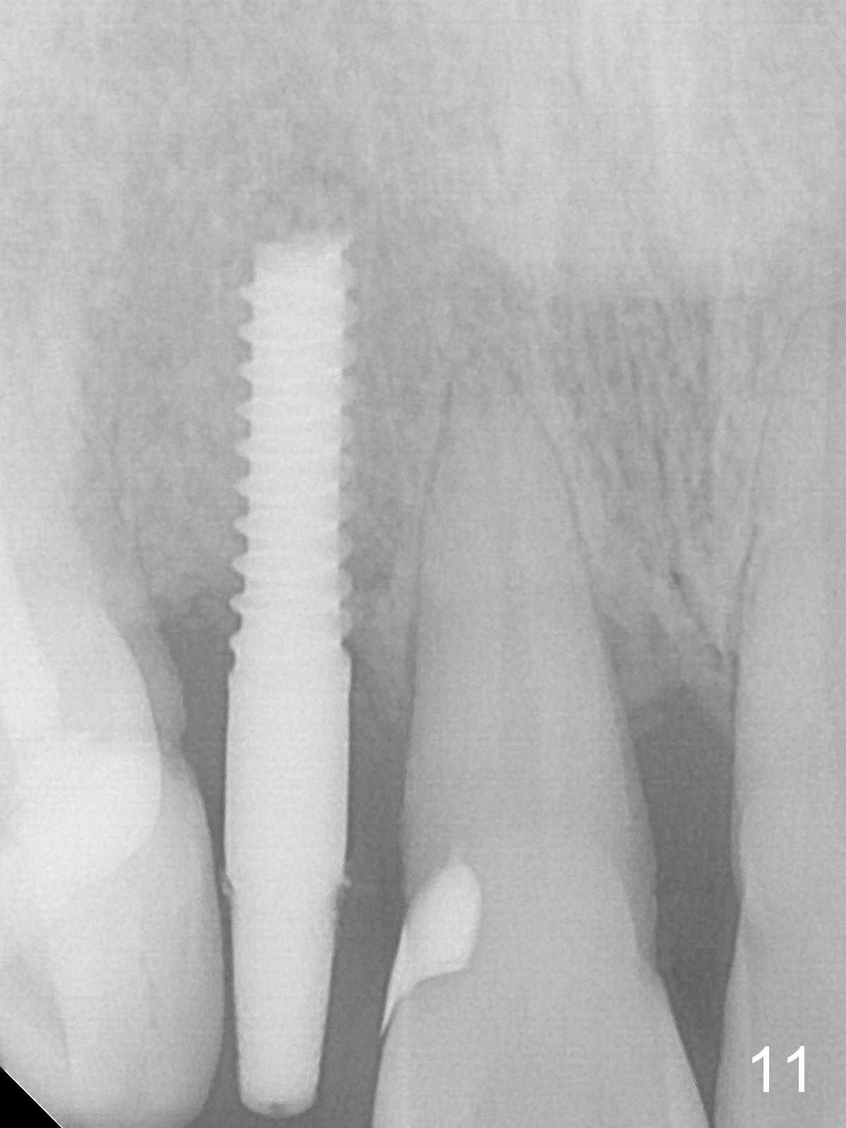 Extending the initial osteotomy to the full length of the implant is critical. If perforation is detected early, the trajectory can be changed. Incision should be made if there is no CBCT study. The incision heals 1 and 4 weeks postop (Fig.8,9). The patient returns for final restoration 6 months postop. Apical defects appear to have healed at #6 and 7 (Fig.10,11). Fig.12 is taken 11 months postop and 5 months post cementation. The patient has an accident 9 months post cementation. In fact the implant is alright, while the tooth #6 fractures and #8 subluxates.