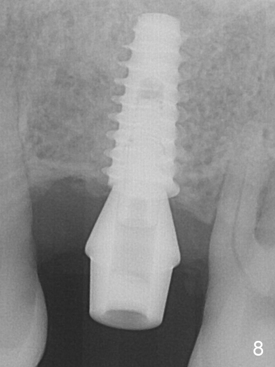 Magic split is designed to test bone density after incision (Fig.1). Since it is sharp and blade-shaped (Fig.2), it is used as a scalpel to penetrate the mucosa at the crest of #14 and tapped in for ~ 7 mm from the gingival margin. The bone density is moderate. Osteotomy is initiated with 1.6 mm pilot drill for 13 mm (Fig.3,4 (red line: the lower border of the sinus floor) and increased by Magic Expanders (ME) and Magic Drills until 4.5x13 mm. A 5x11 mm dummy implant is placed (Fig.5). After reusing ME 3.8 mm for 13 mm at the palatal gingival margin (which is more apical than the buccal one by ~2 mm), a definitive IBS implant (5x11 mm) is placed (Fig.6). Later the implant is turned 4 more times. Without an incision, there is no hemorrhage when a 6x4(4) mm Hexa abutment is placed (Fig.7 (palatal view) A). As a routine, an immediate provisional is fabricated with occlusal clearance. The implant/crown ratio is less favorable. Restore more than 4 months. In fact, the patient returns for crown 4 months postop. The implant appears to have osteointegrated (Fig.8).