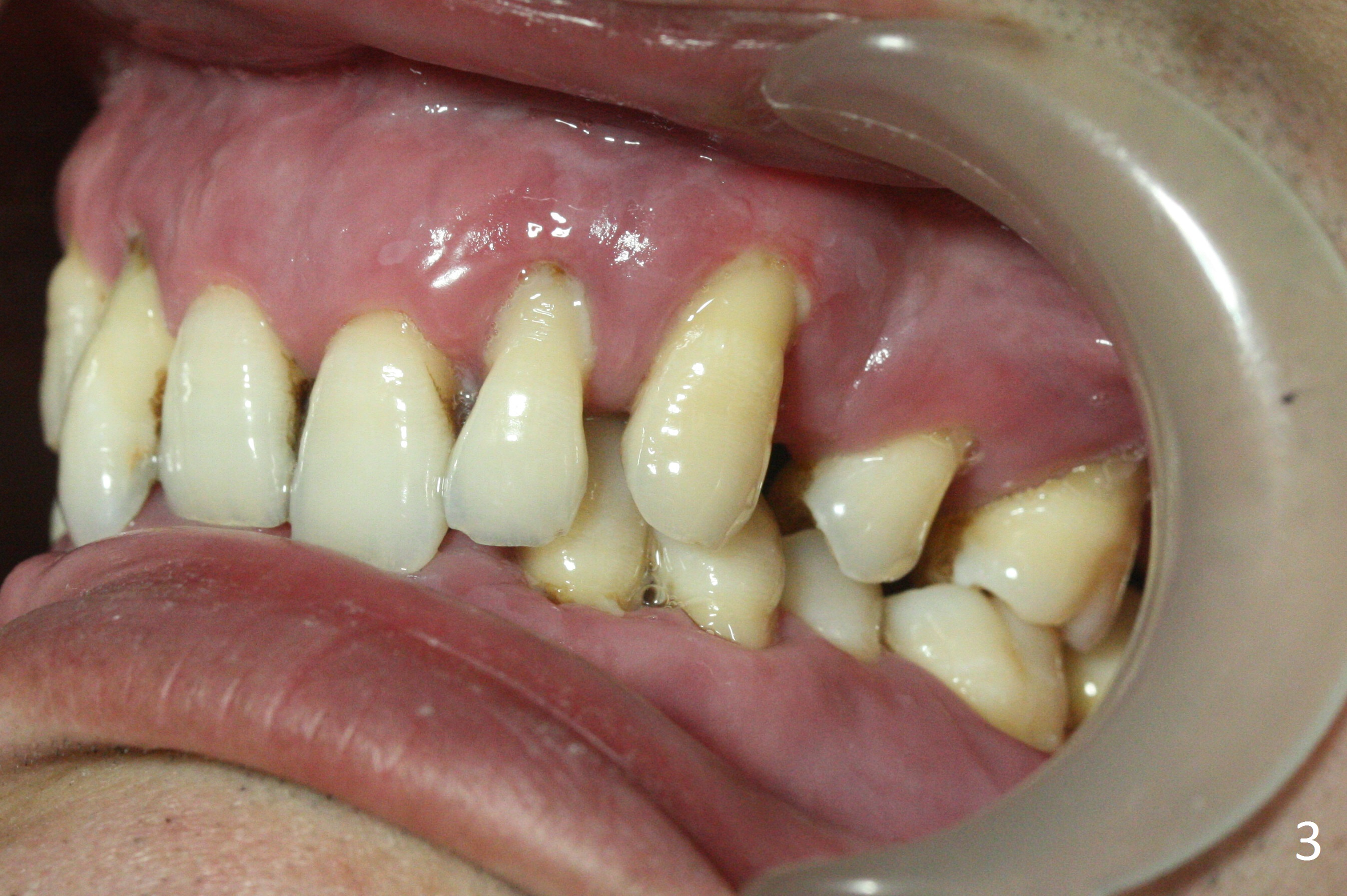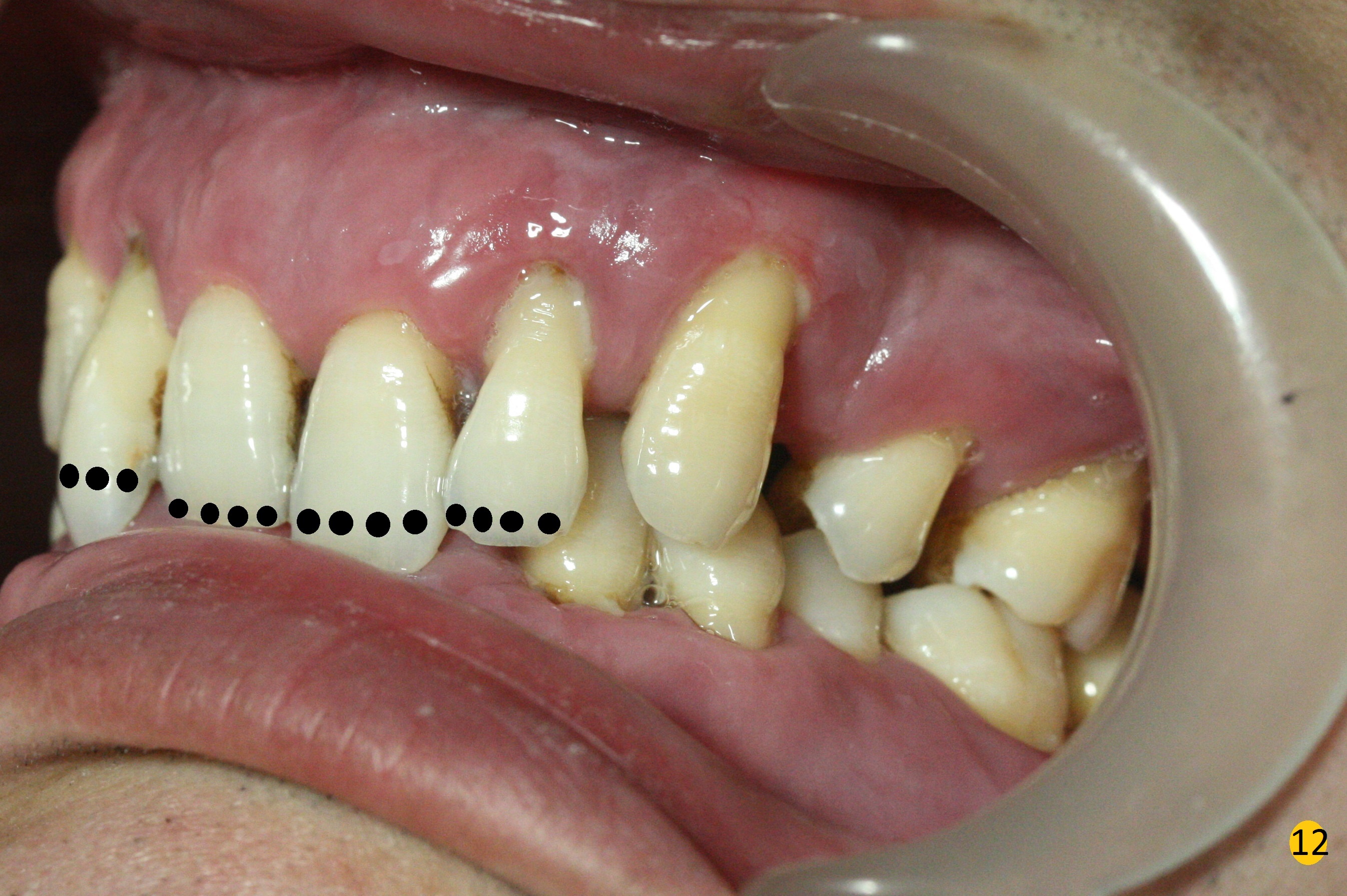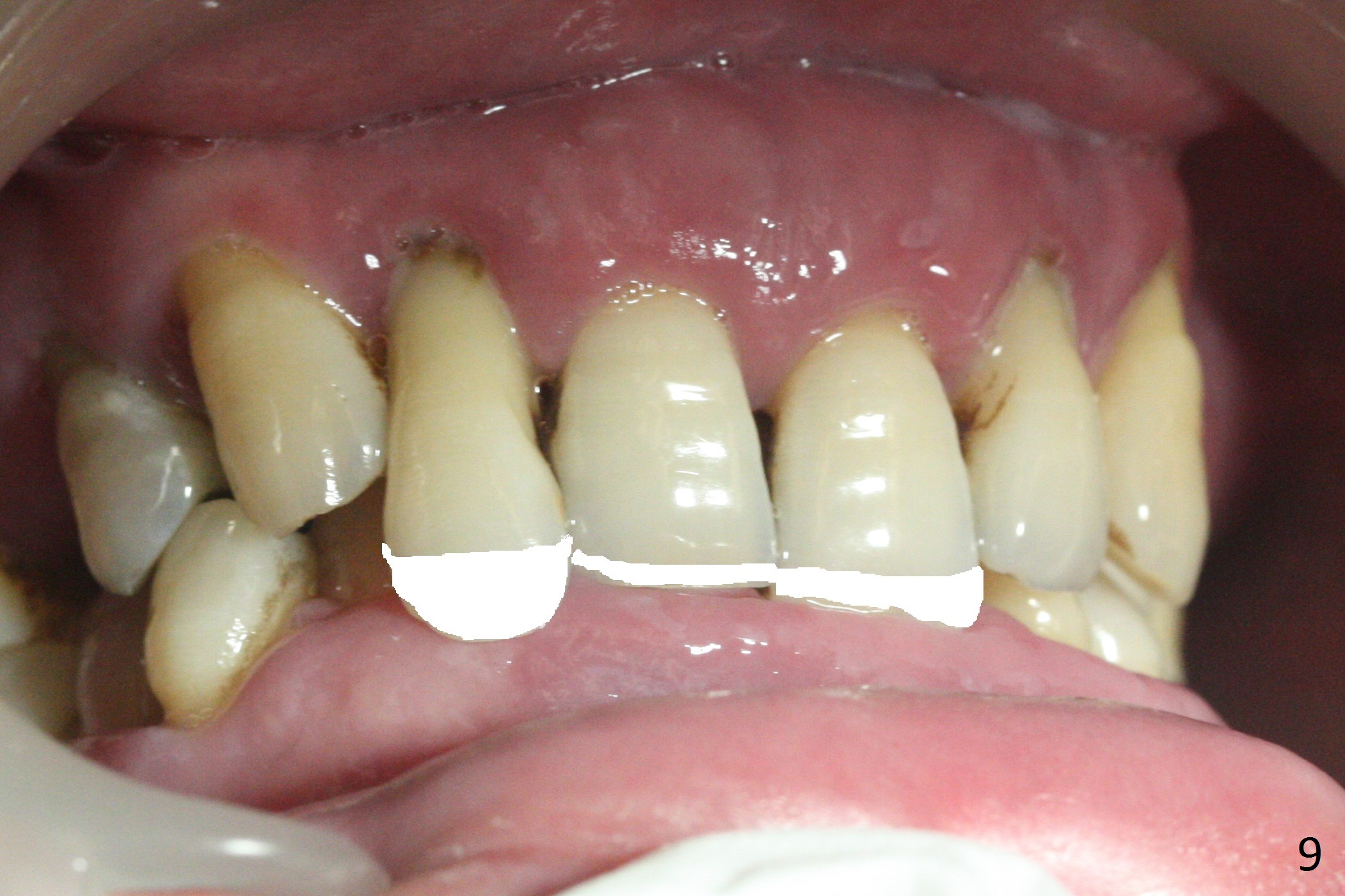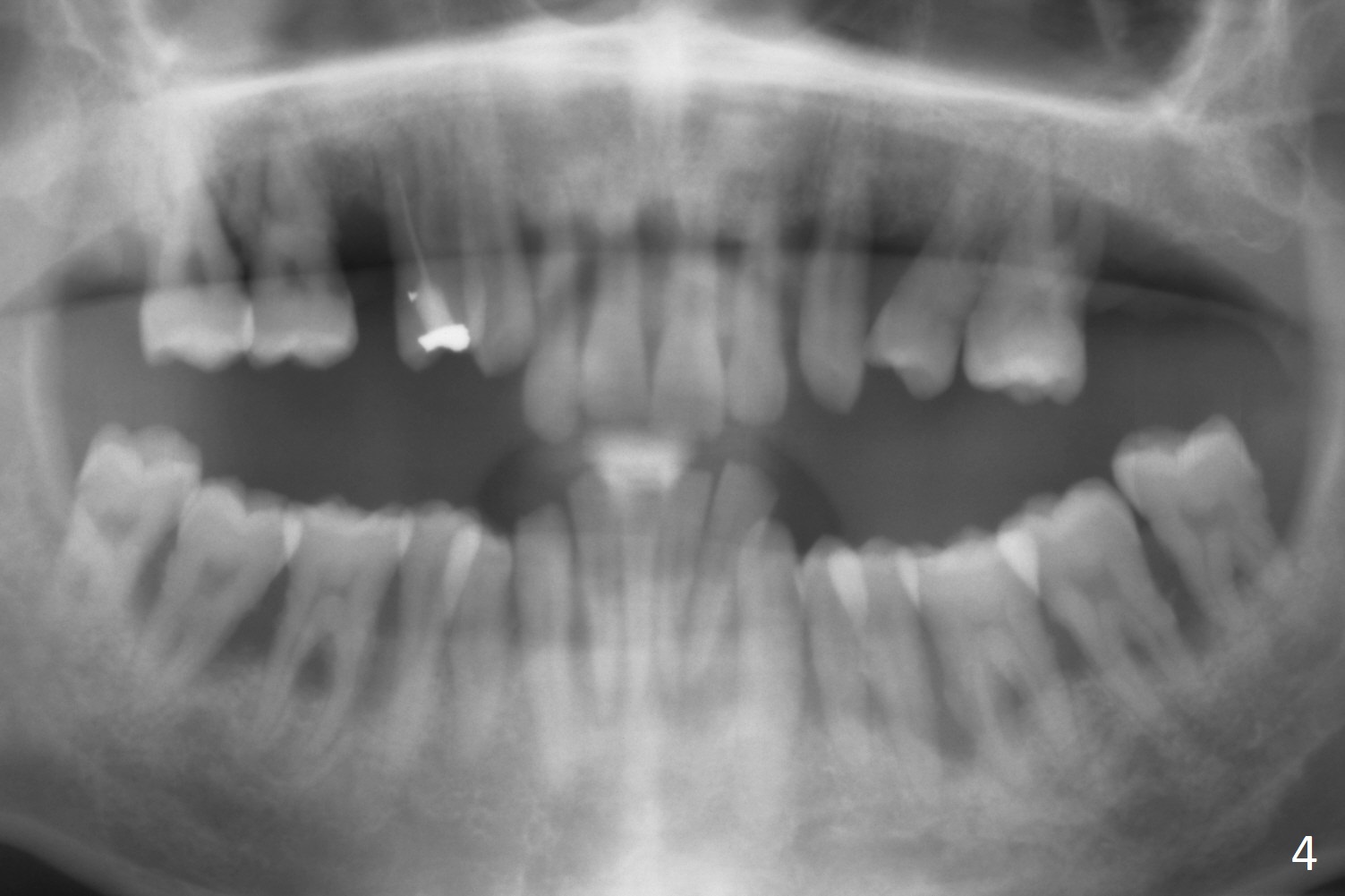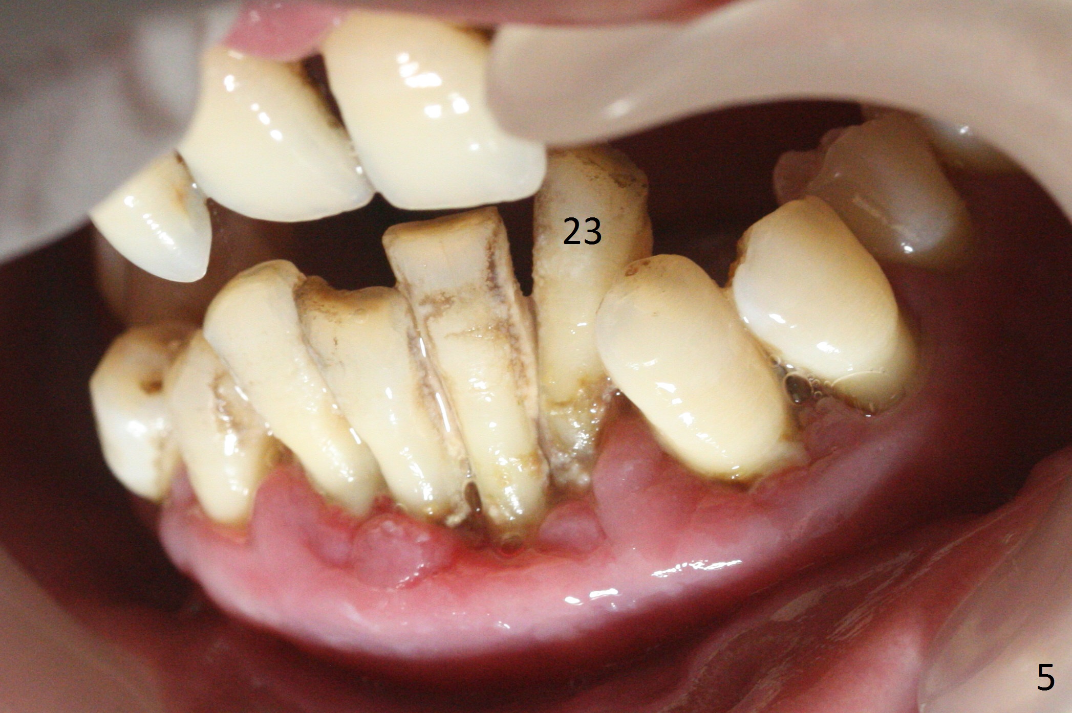 A 36-year-old man (ex-smoker) has advanced chronic periodontitis (Fig.1-5). His chief complaint is "I cannot chew on the right side now because of pain (Fig.1: #3 abscess <) and the bottom front teeth are loose (Fig.2,5: #23-26)". He has not masticated on the left side because of the mobile teeth. Due to finance, implants will be placed at #3,4 (Fig.12), 23 and 26 at the appointments of scaling & root planing.