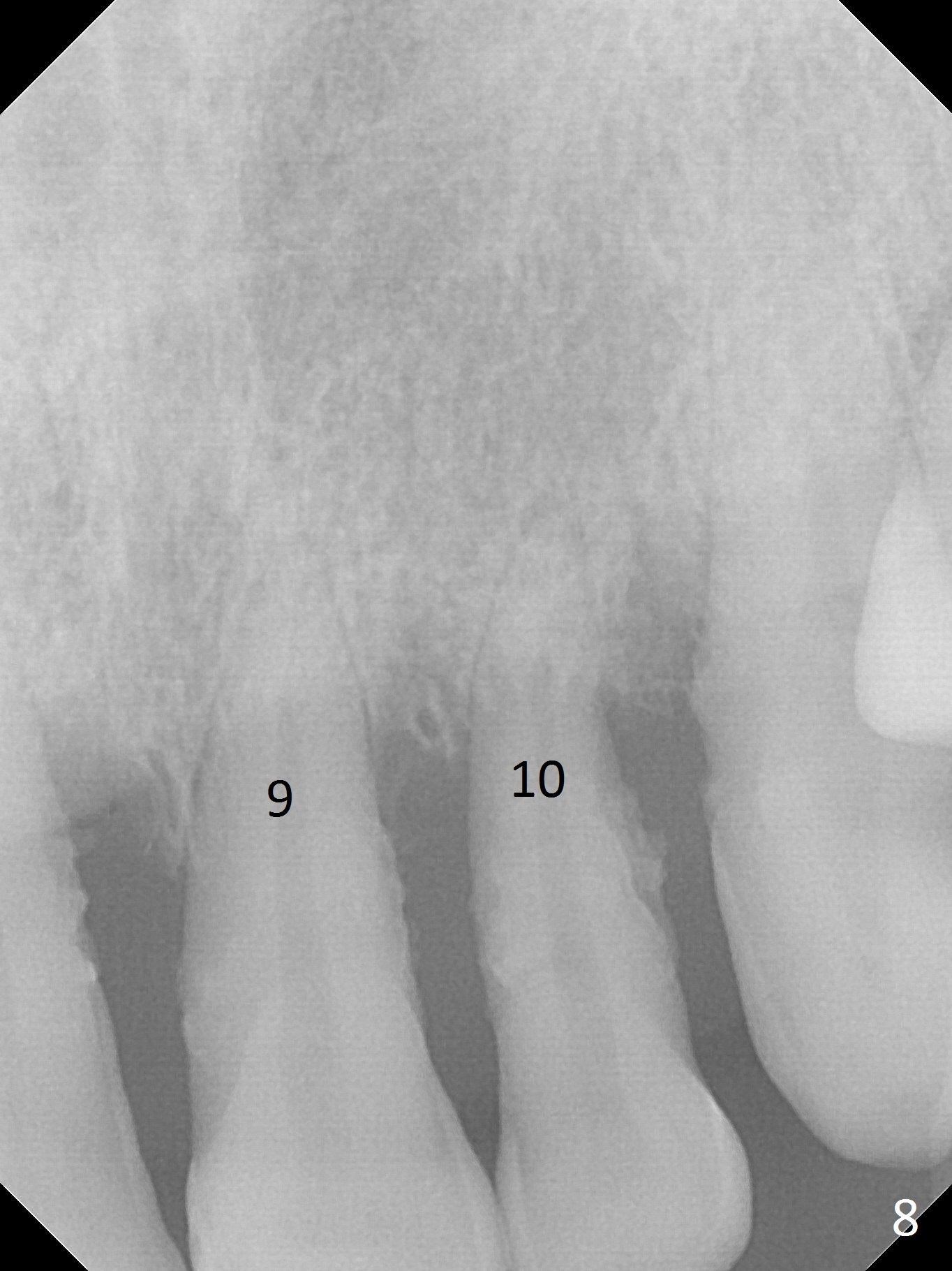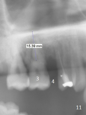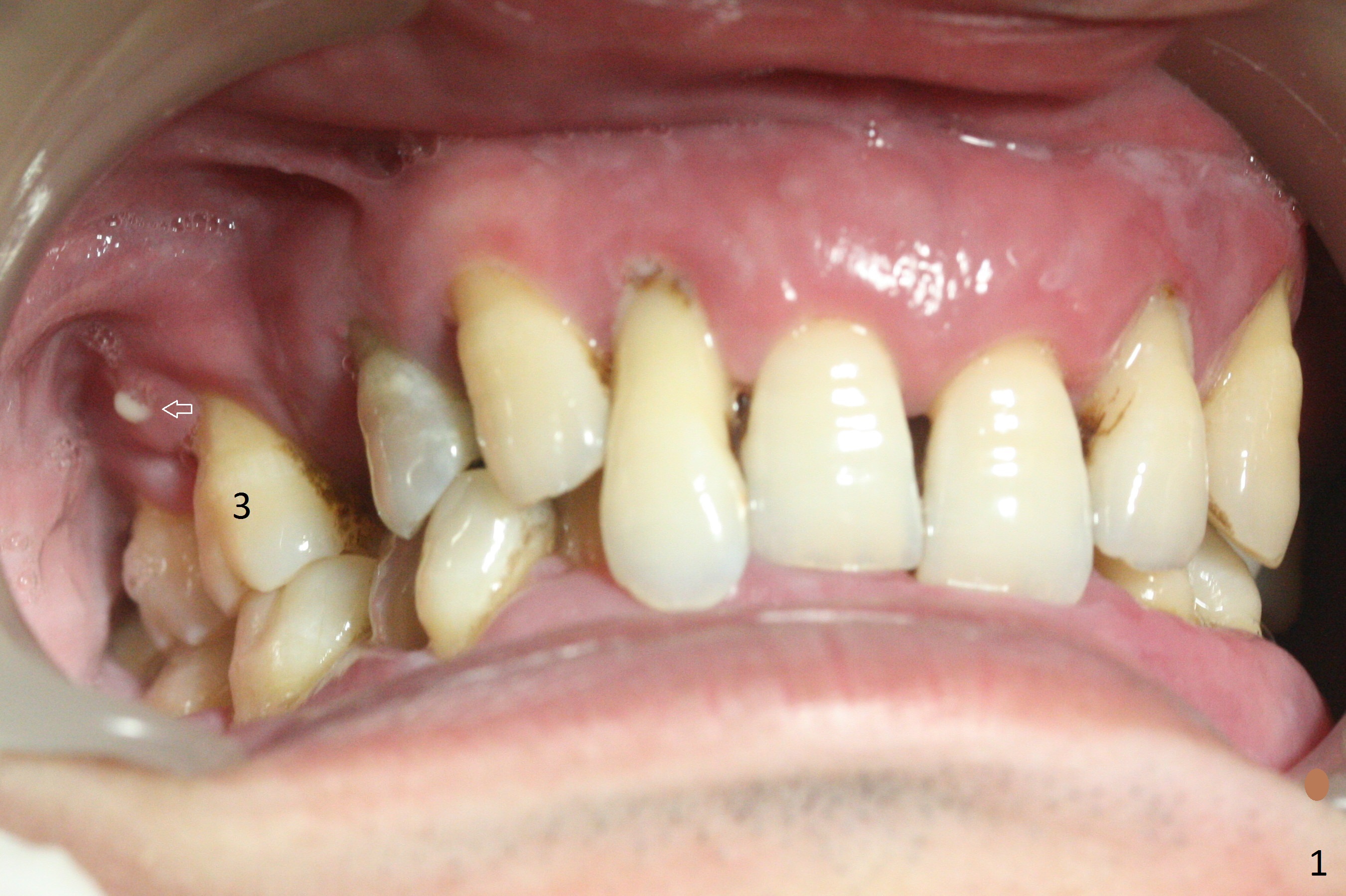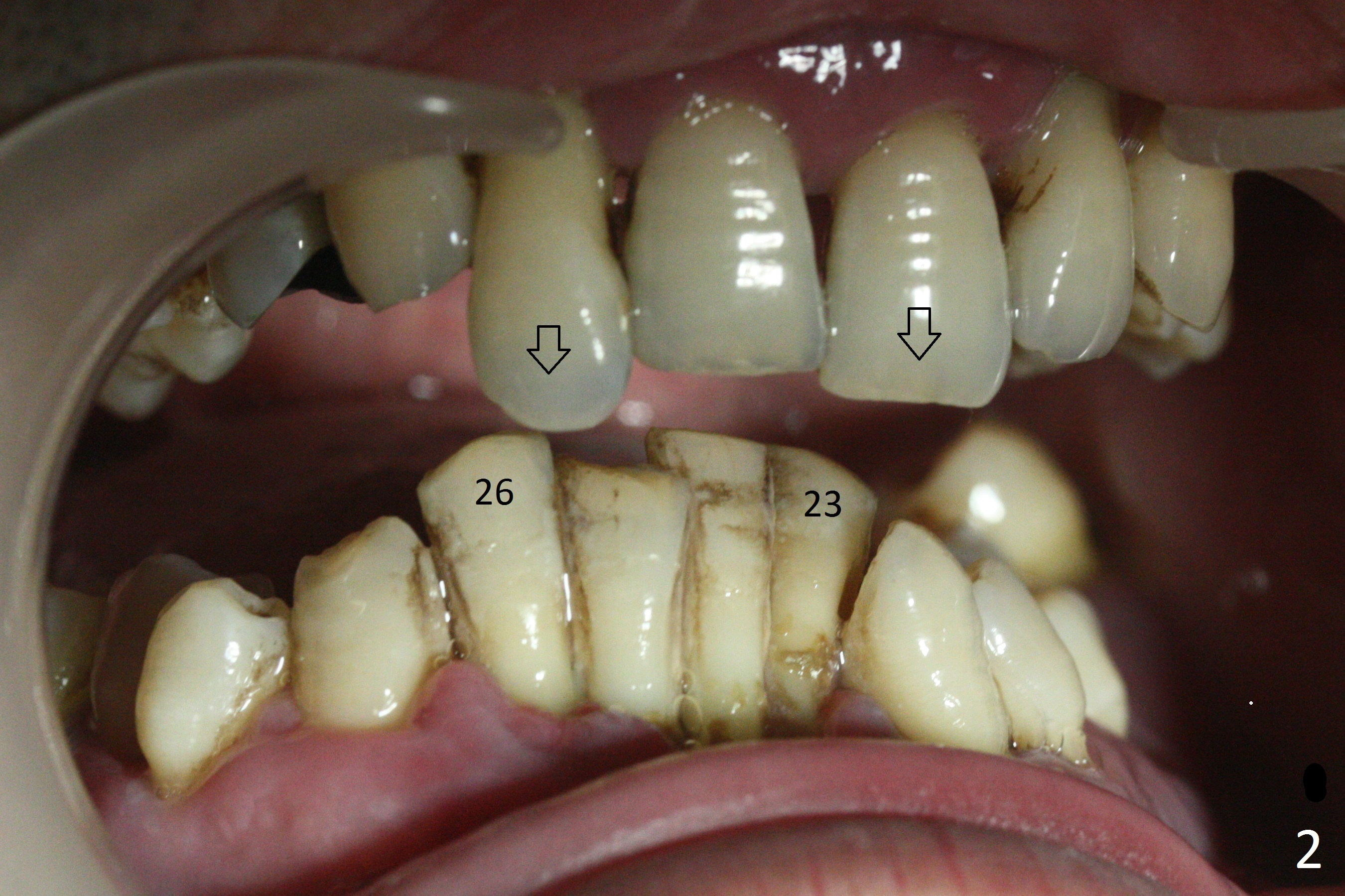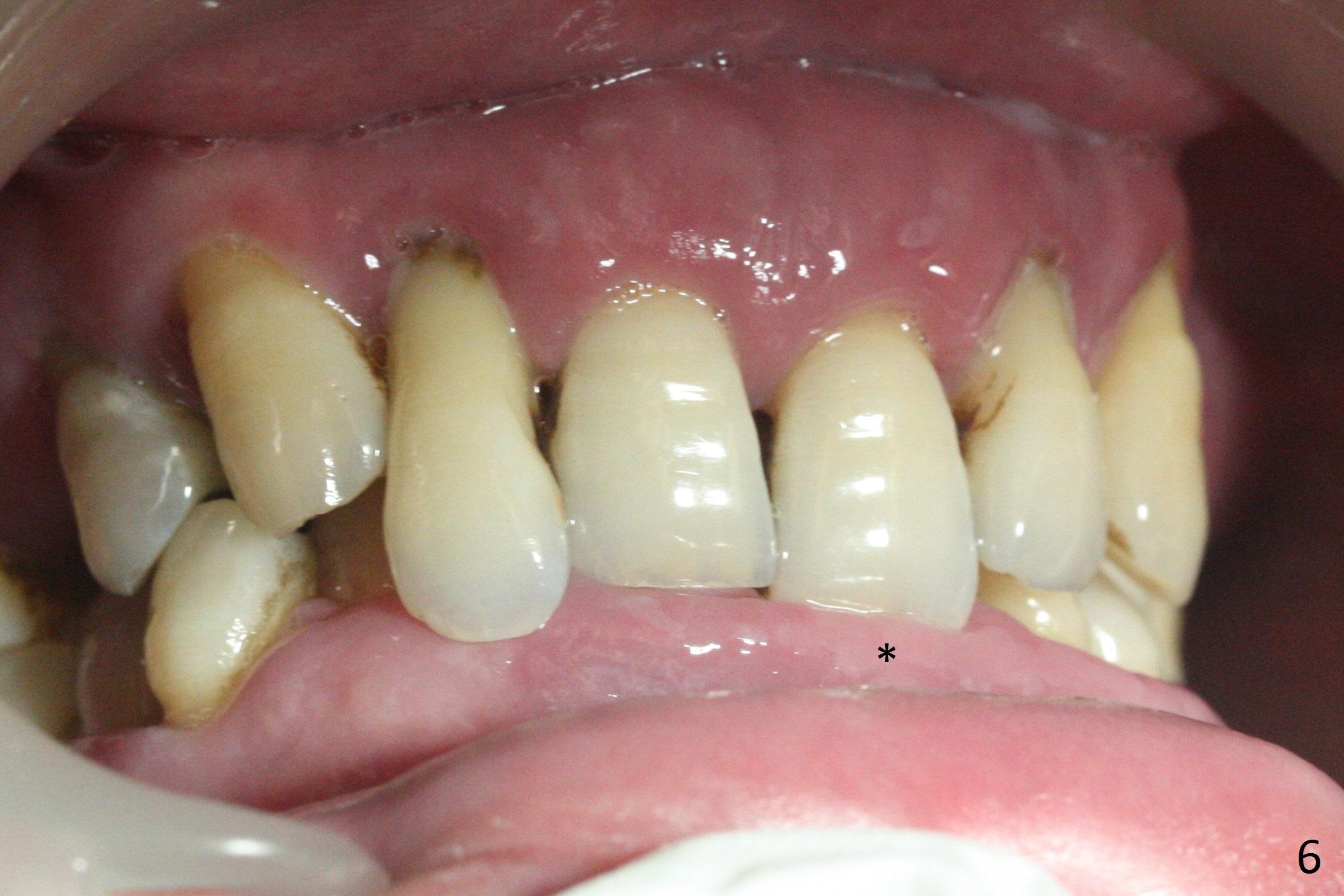 A 36-year-old man (ex-smoker) has advanced chronic periodontitis (Fig.1-5). His chief complaint is "I cannot chew on the right side now because of pain (Fig.1: #3 abscess <) and the bottom front teeth are loose (Fig.2,5: #23-26)". He has not masticated on the left side because of the mobile teeth. Due to finance, implants will be placed at #3,4 (Fig.12), 23 and 26 at the appointments of scaling & root planing.