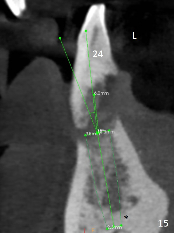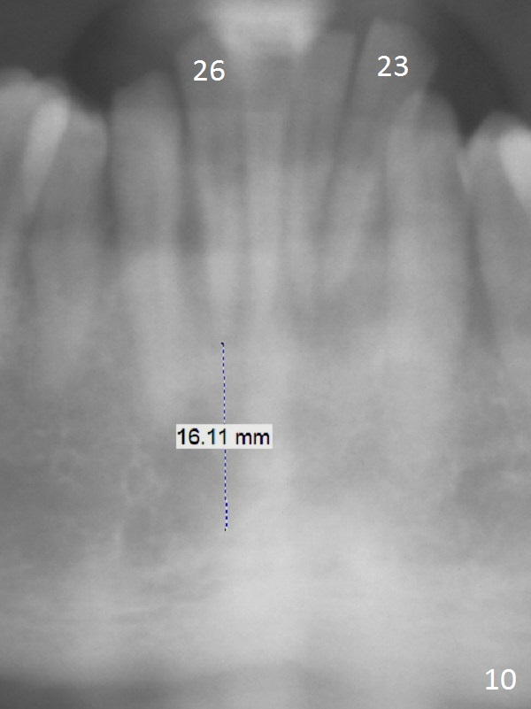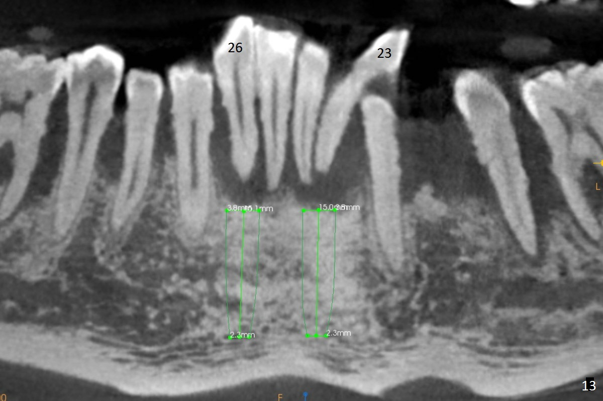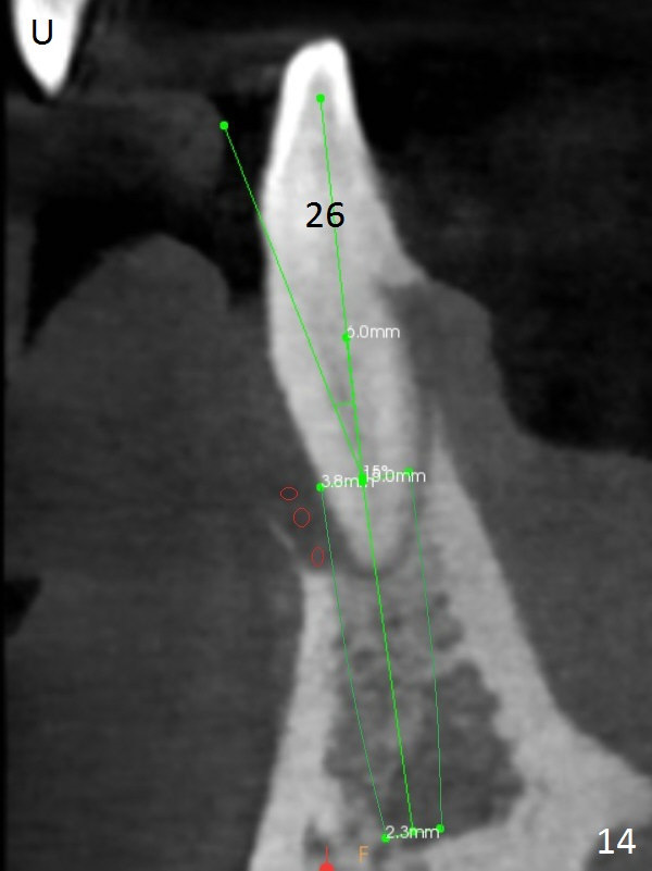 Class II Division II malocclusion (Fig.2,6) will make it difficult to restore #23-26 implant-supported FPD. Although the teeth #7-10 may need to be replaced later (Fig.7,8), enameloplasty will be conducted for #7-10 (Fig.9 white area; Fig.12 black circles (gross reduction)) prior to #23-26 extraction and implant placement (Fig.10). To be flexible in restoration (angulation) and possible future hybrid denture, 2-piece narrow implants will be placed (3.0 or 3.3 mm) instead of 1-piece ones. In fact CBCT shows that the narrowest regular implant (3.8 mm) can be placed in the lower anterior region (Fig.13-15).