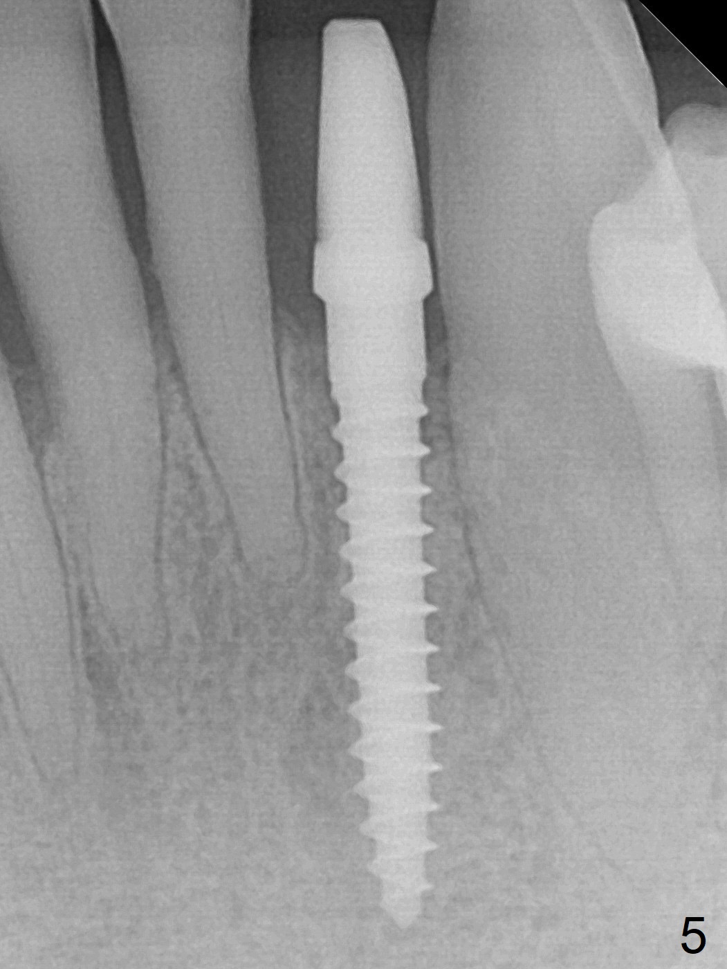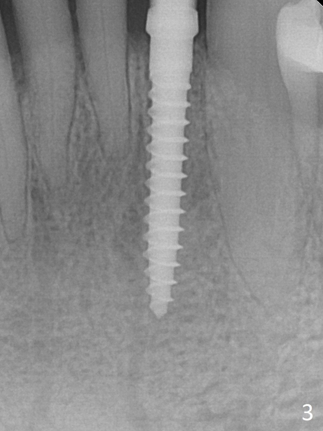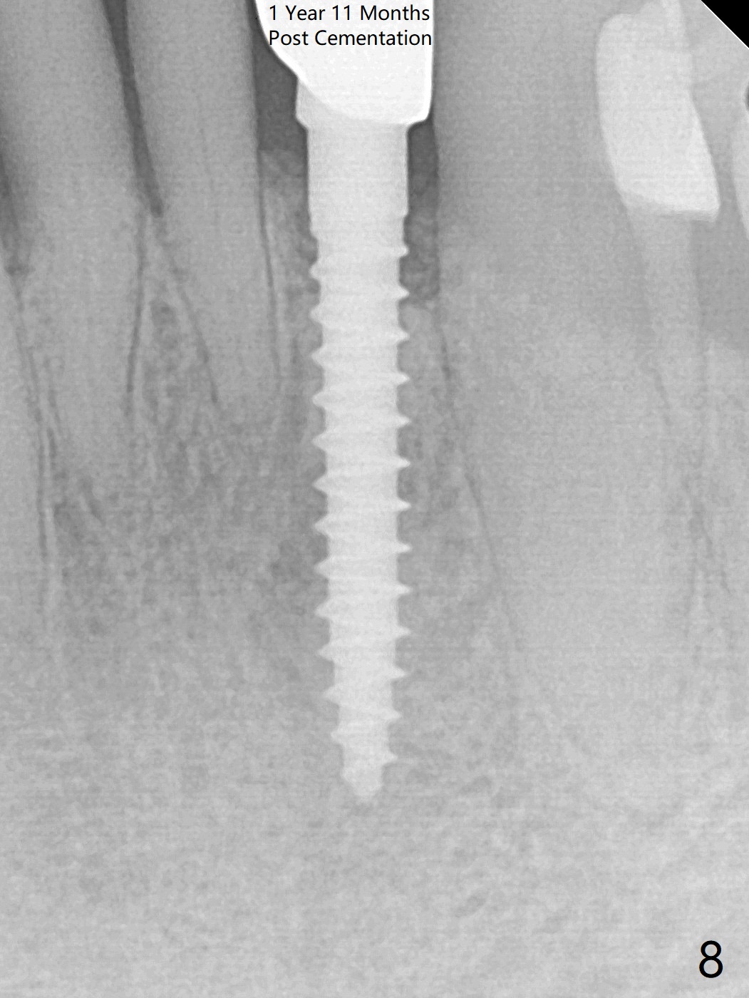 The tooth #23 is going to be extracted because the patient cannot masticate normally with mobility (Fit.1). The gingival depth is measured 2-4 mm after extraction. The 1st intraop PA taken with 1.2 mm drill for 16 mm shows the mesiodistal width is 5.11 mm (Fig.2); a 2.5x14(2) mm 1-piece implant is placed with >35 Ncm (Fig.3 with allograft placed). Following abutment preparation, an immediate provisional is fabricated to close the socket (Fig.4 P). There is no bone loss (Fig.5) or gingival inflammation (Fig.6 after reprep) 3 months postop. The narrow implant (2.5 or 2.0 mm) is indicated in the narrow edentulous space. The distal crest seems to be reduced in density and lower in height 1 year 7 months (Fig.7) and 1 year 11 months (Fig.8) post cementation. The severity does not worsen probably related to use of water pik. The crown looks bulky probably due to too large the abutment and too buccal placement of the implant (Fig.9, 10, as compared to Fig.1). A 2 mm implant may help?
