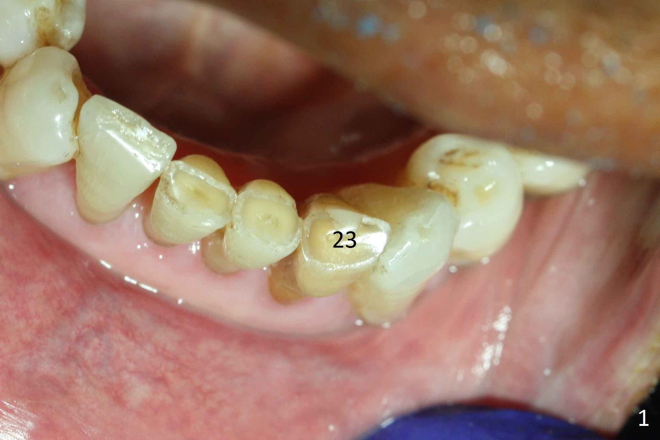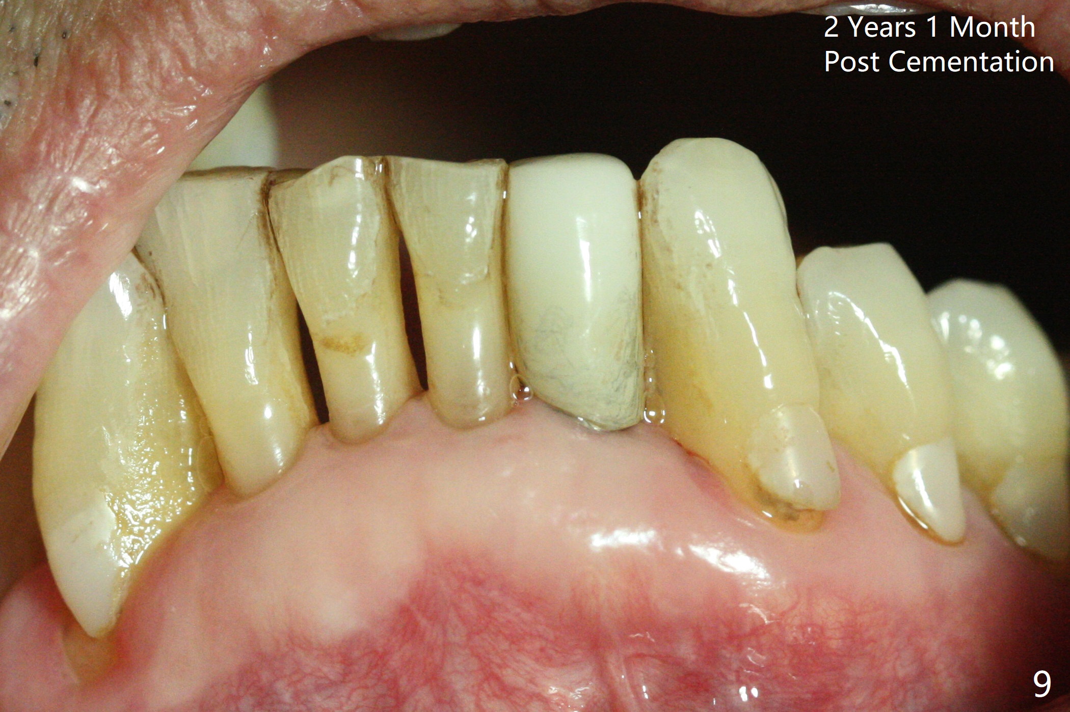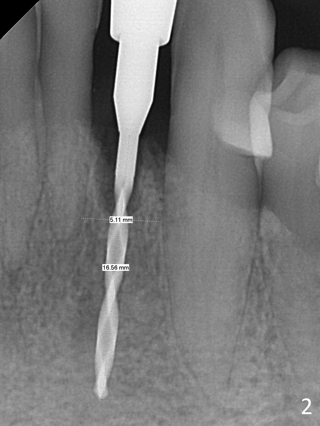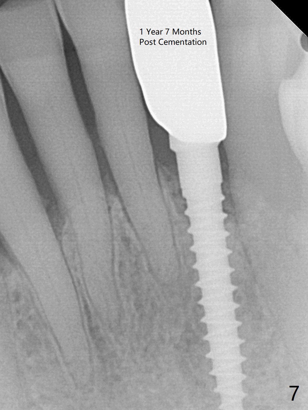 The tooth #23 is going to be extracted because the patient cannot masticate normally with mobility (Fit.1). The gingival depth is measured 2-4 mm after extraction. The 1st intraop PA taken with 1.2 mm drill for 16 mm shows the mesiodistal width is 5.11 mm (Fig.2); a 2.5x14(2) mm 1-piece implant is placed with >35 Ncm (Fig.3 with allograft placed). Following abutment preparation, an immediate provisional is fabricated to close the socket (Fig.4 P). There is no bone loss (Fig.5) or gingival inflammation (Fig.6 after reprep) 3 months postop. The narrow implant (2.5 or 2.0 mm) is indicated in the narrow edentulous space. The distal crest seems to be reduced in density and lower in height 1 year 7 months (Fig.7) and 1 year 11 months (Fig.8) post cementation. The severity does not worsen probably related to use of water pik. The crown looks bulky probably due to too large the abutment and too buccal placement of the implant (Fig.9, 10, as compared to Fig.1). A 2 mm implant may help?