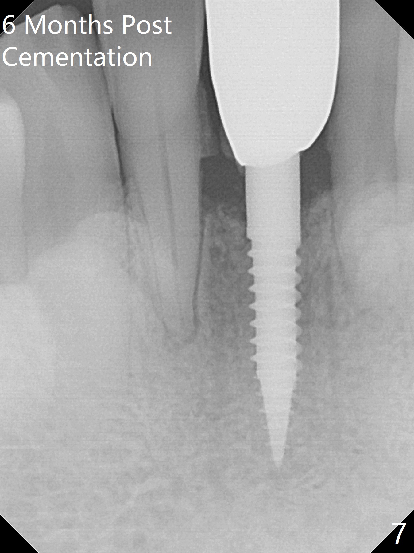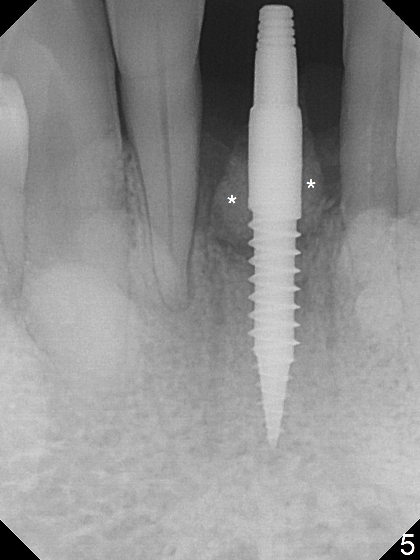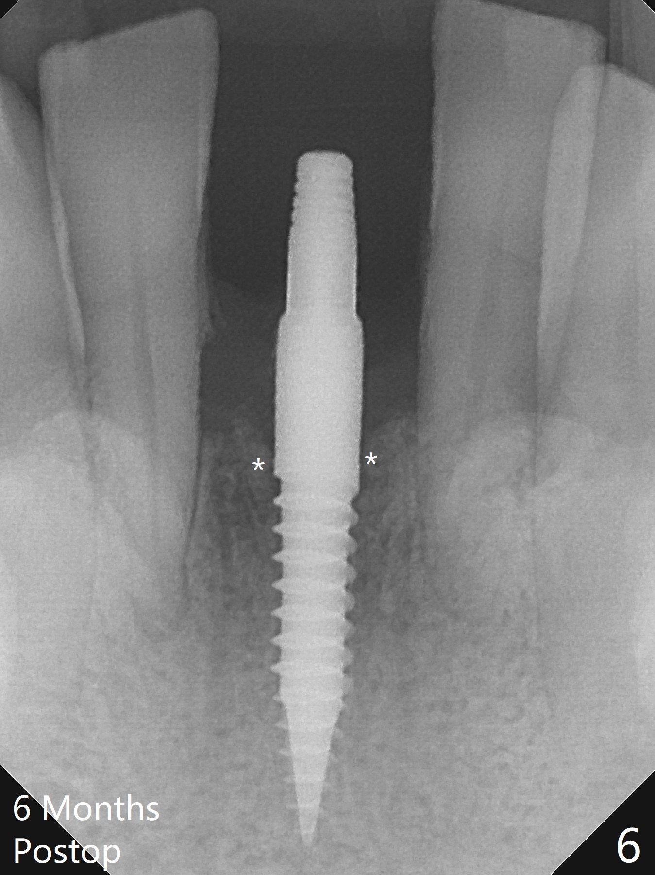 When the patient returns for implant placement 1.5 years after the last treatment (SRP), the tooth #25 has exfoliated, whereas the tooth #24 is severely displaced (Fig.1-3). In fact the buccolingual plates are found to be lost after extraction, corresponding to change in gingival color indicated by an arrowhead in Fig.1. Initial osteotomy with 1.2 mm drill is parallel to the terminal branches of the Incisive Canal (Fig.4 arrowheads). Since the gingiva is as thick as 7.5 mm (Fig.3 arrow), a 3x14 mm 1-piece implant with 4 mm cuff is placed (Fig.5); three implant threads are outside the native bone; with allograft (*) placed and the neighboring crests being coronal to the threads, the chance of periimplantitis should be remote. An immediate provisional is fabricated to contain the graft in place. Meanwhile the tooth #2 is symptomatic with crack. The top 3 threads appear to be contacted by the newly formed crestal bone 6 months postop (Fig.6 *). Bone appears to have grown into the space between implant threads 6 months post cementation (13 months postop).