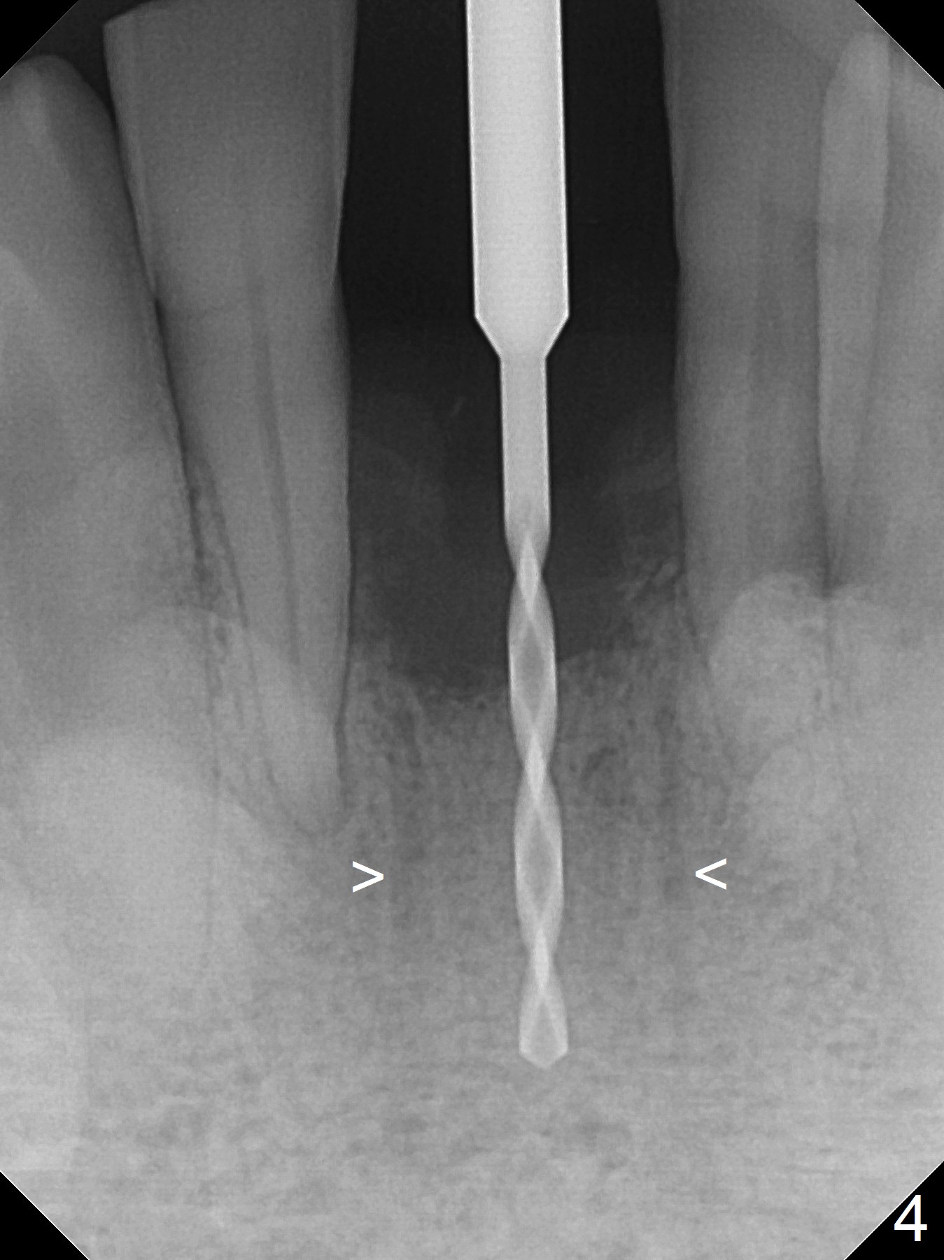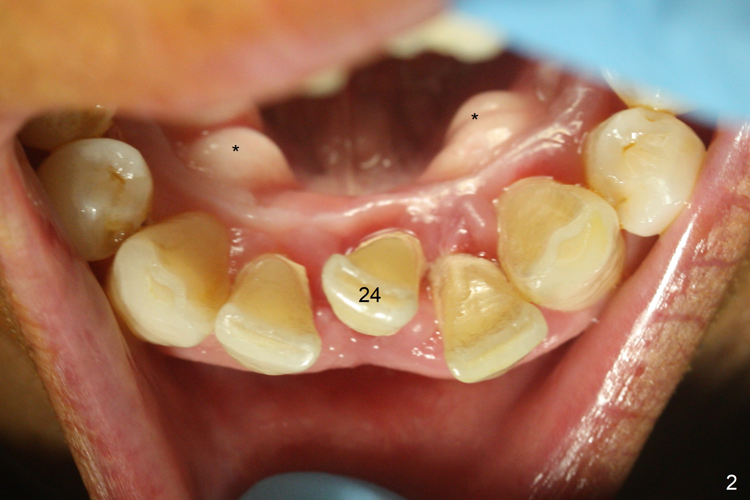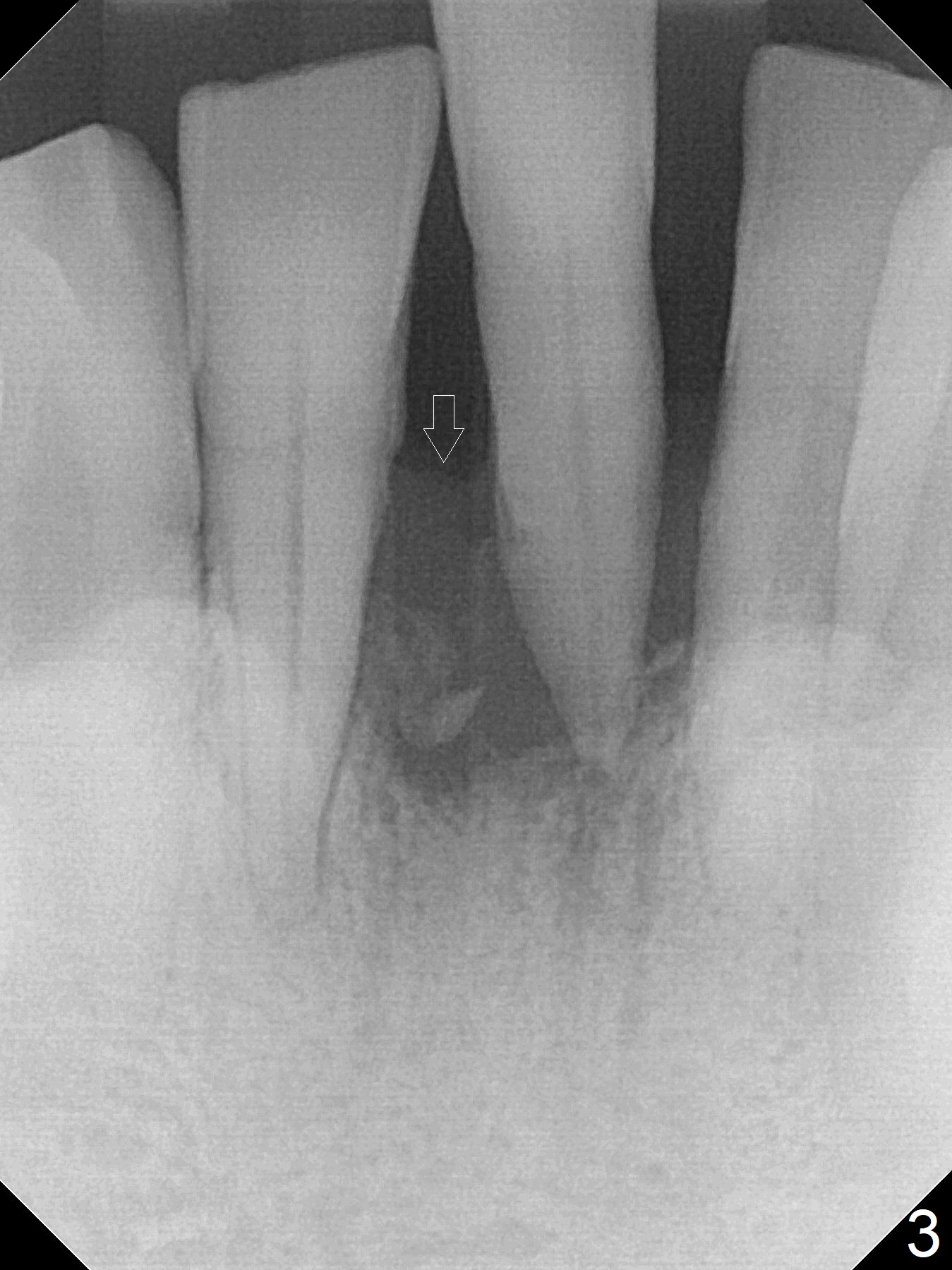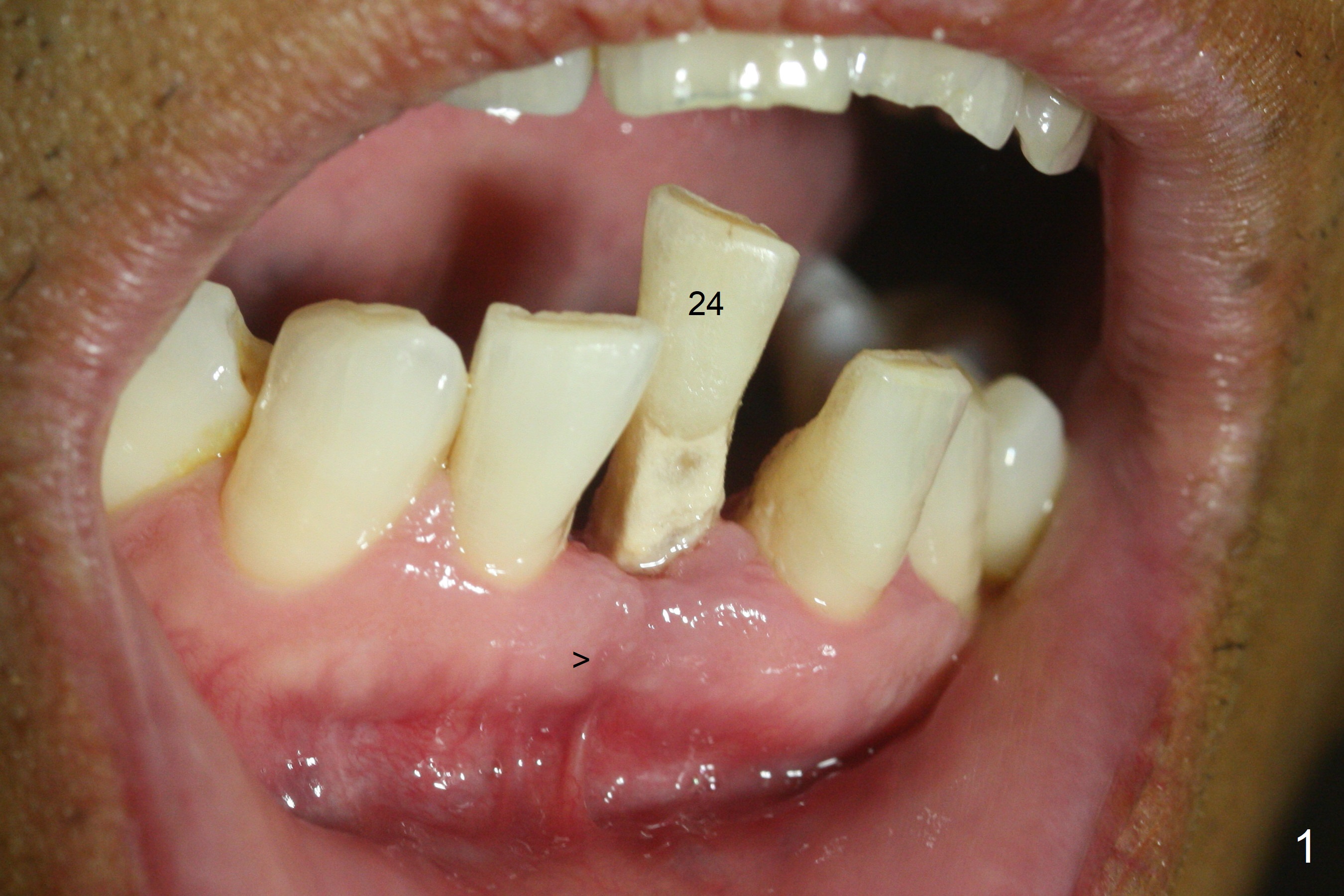 When the patient returns for implant placement 1.5 years after the last treatment (SRP), the tooth #25 has exfoliated, whereas the tooth #24 is severely displaced (Fig.1-3). In fact the buccolingual plates are found to be lost after extraction, corresponding to change in gingival color indicated by an arrowhead in Fig.1. Initial osteotomy with 1.2 mm drill is parallel to the terminal branches of the Incisive Canal (Fig.4 arrowheads). Since the gingiva is as thick as 7.5 mm (Fig.3 arrow), a 3x14 mm 1-piece implant with 4 mm cuff is placed (Fig.5); three implant threads are outside the native bone; with allograft (*) placed and the neighboring crests being coronal to the threads, the chance of periimplantitis should be remote. An immediate provisional is fabricated to contain the graft in place. Meanwhile the tooth #2 is symptomatic with crack. The top 3 threads appear to be contacted by the newly formed crestal bone 6 months postop (Fig.6 *). Bone appears to have grown into the space between implant threads 6 months post cementation (13 months postop).