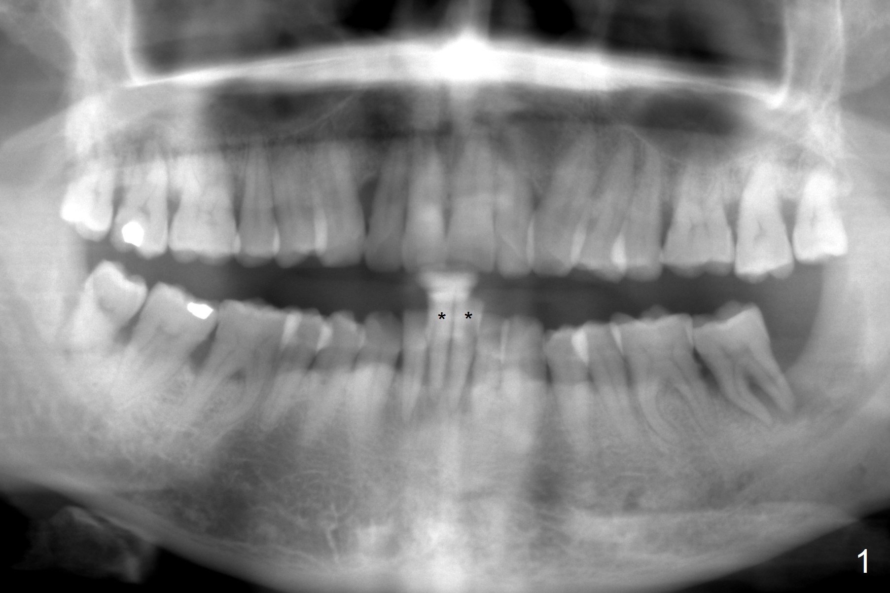 A 59-year-old man has two mobile central incisors, which are lingually displaced (Fig.1 *). Take photos and PA when the patients arrives for surgery. After extraction, choose the larger socket for osteotomy for 1-piece implant. In fact these two teeth have been exfoliated by themselves. Use an upper central incisor crown form for provisional with a vertical slot buccally to mimic 2 lower fused incisors.