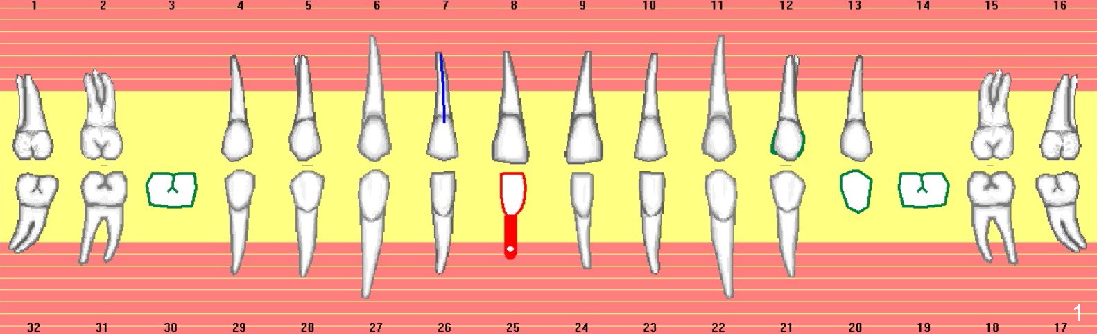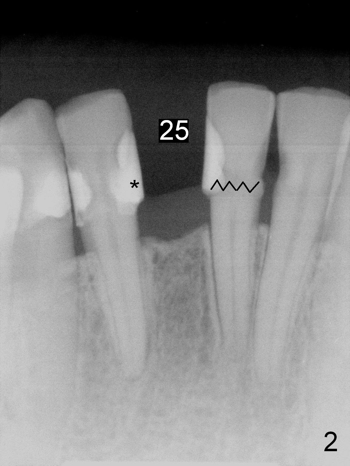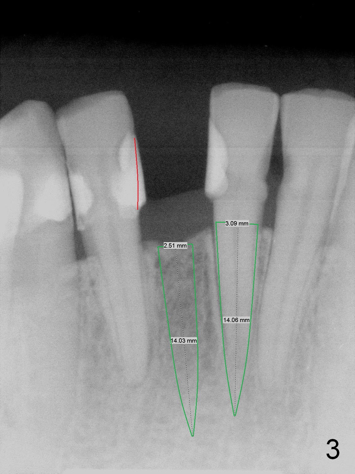A 3 or 3.5 mm 1-piece implant is placed at #24 (Fig.3) after Metronidazole socket soaking. The larger one is chosen (3.5 mm (Tatum)) if the implant at #25 fails to be placed. A dummy implant is placed partially to test trajectory. If the latter is bad, use an angled 1-piece one (Tatum). The composite overhang (Fig.2 *) is to be trimmed (Fig.3 red line). Take preop photos to show the concave buccal plate (Fig.4a) and intra- and post-op ones to show bone expansion (Fig.4b-d).