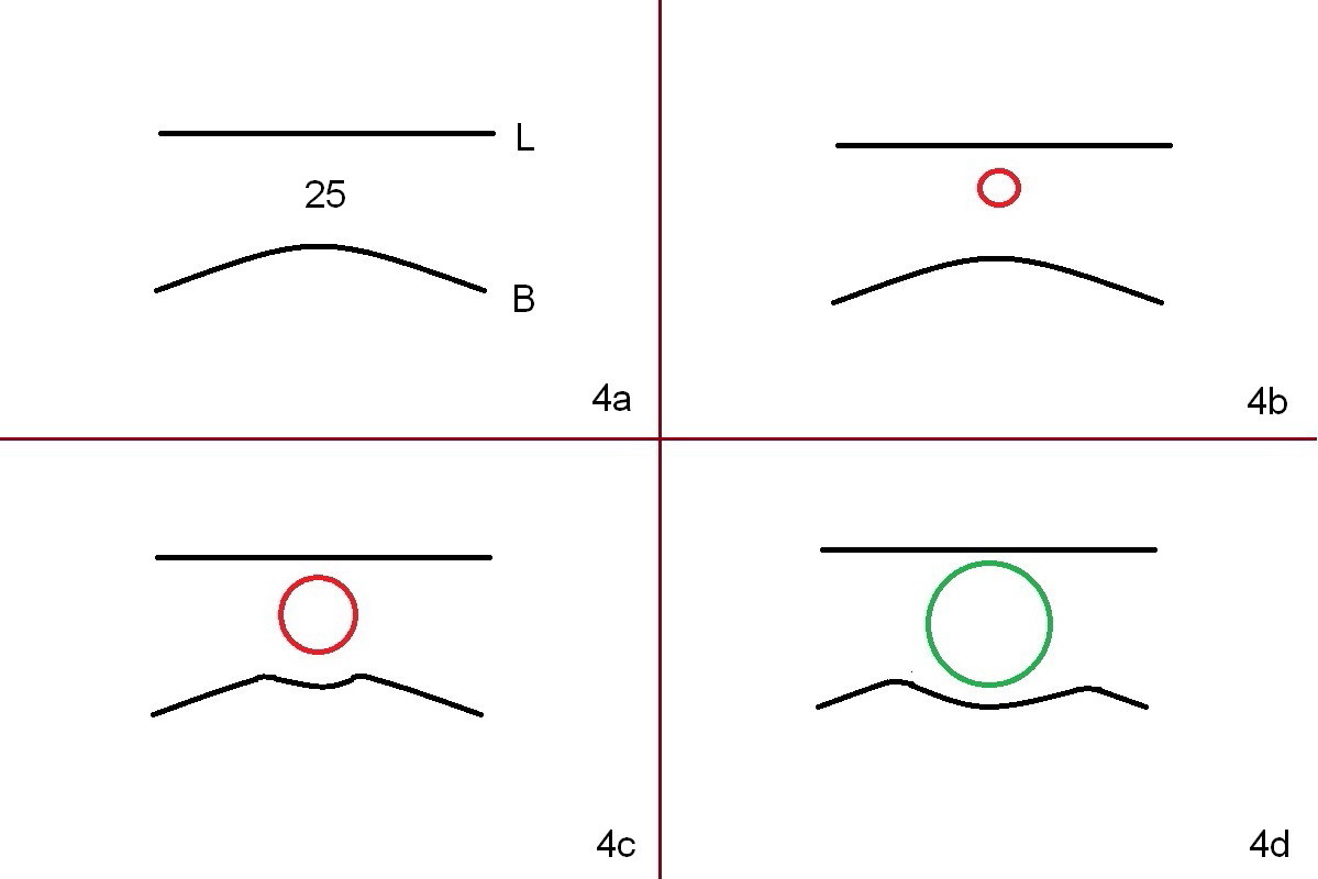 A 53-year-old woman (WX) had several missing teeth with a lower flipper (Fig.1,2, conditions 2 years ago). Recently the tooth #24 fractured equigingival (Fig.2 saw-toothed line). The edentulous area at #25 is narrow buccolingually (Fig.4a). Start osteotomy lingually (L, Fig.4b red circle). As the osteotomy increases (Fig.4c red circle) and a 2 or 2.5 mm 1-piece DIO implant is placed (Fig.4d green circle), the weaker buccal (B) plate is being expanded buccally.