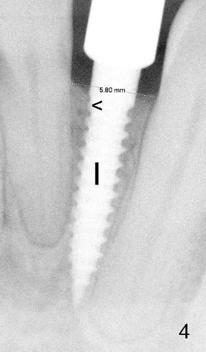 Fig.4: A 3x17 mm one piece implant is placed (I). The 1st thread is subcrestal (<). 术后邻牙轻度叩痛