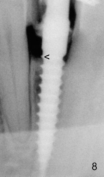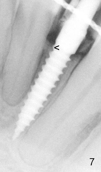 Fig.7 is taken 10 months postop. The provisional has not been replaced by a definitive restoration. The 1st thread is equicrestal (<).