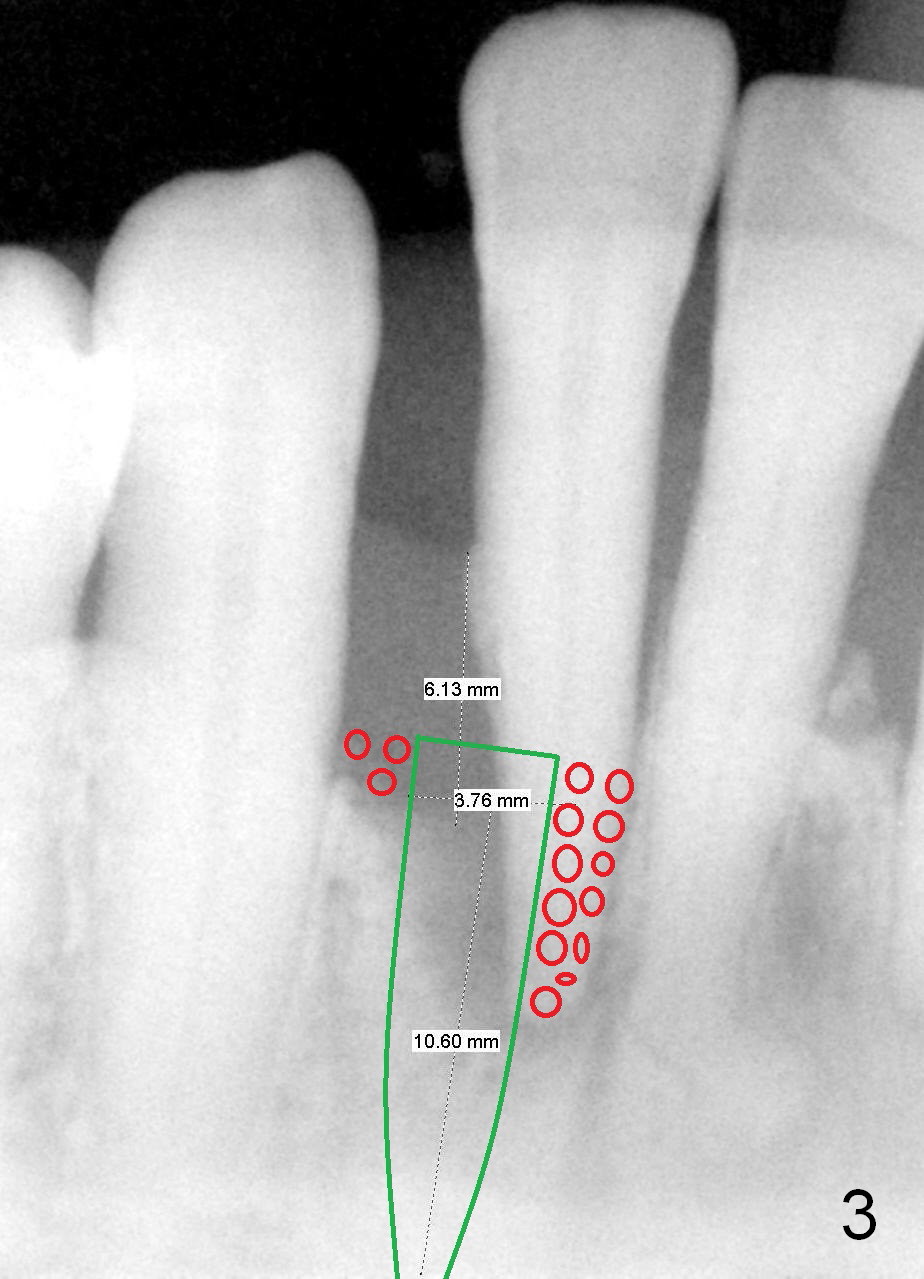 A tentative design is as follows: a bone-level implant is placed 4 mm subgingival (Fig.3, total gingival height 6 mm (Fig.2)). The cuff will be 4 mm. The most coronal threads are covered by bone graft (red circles).