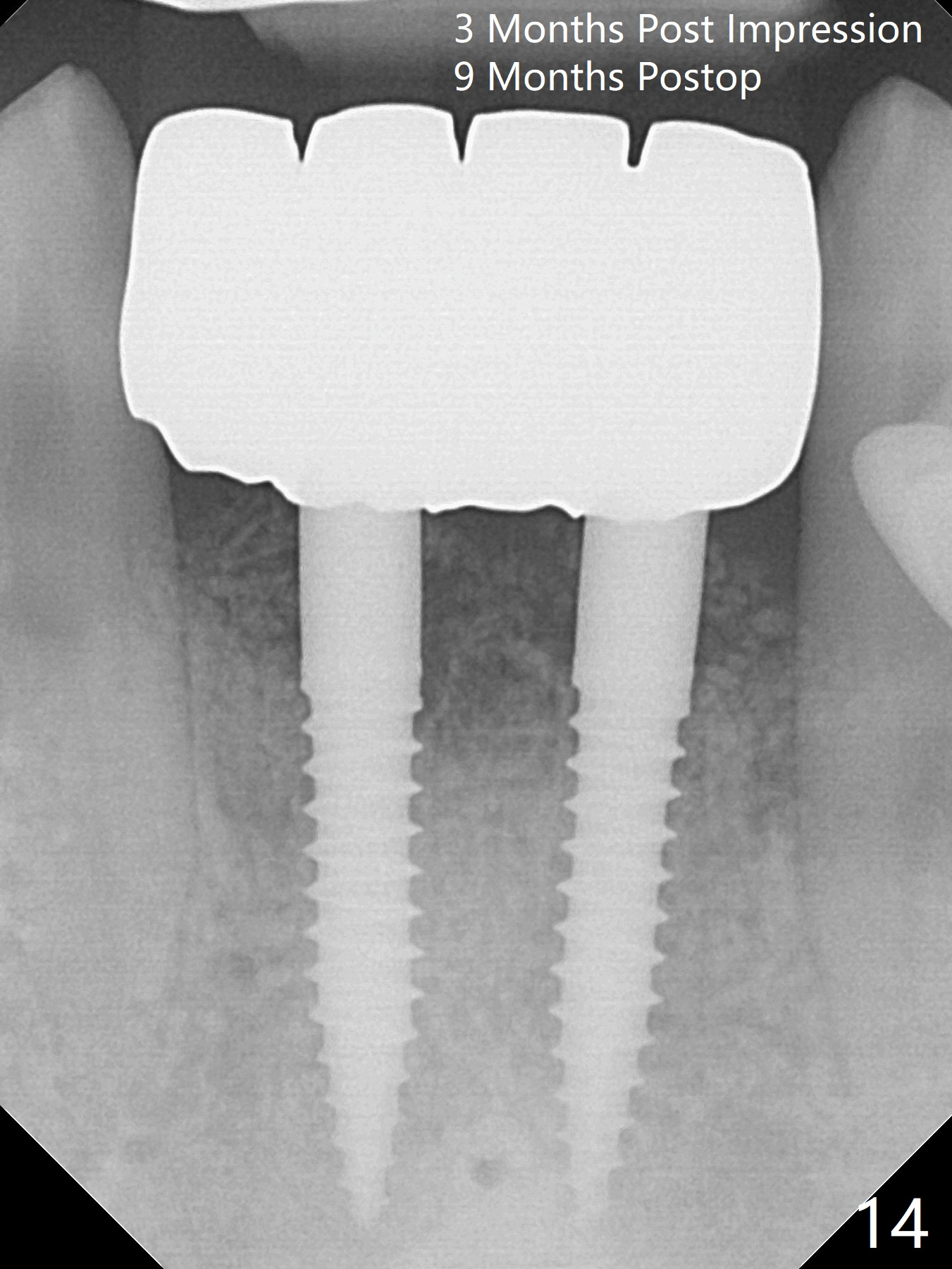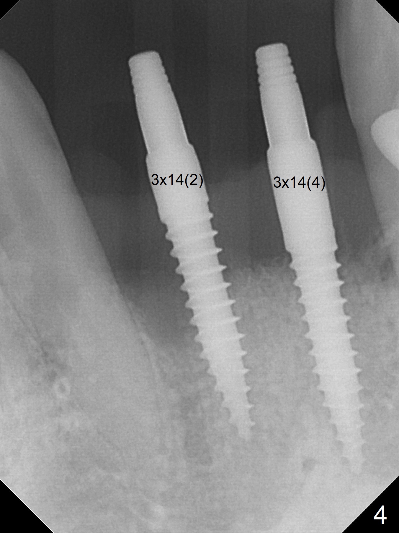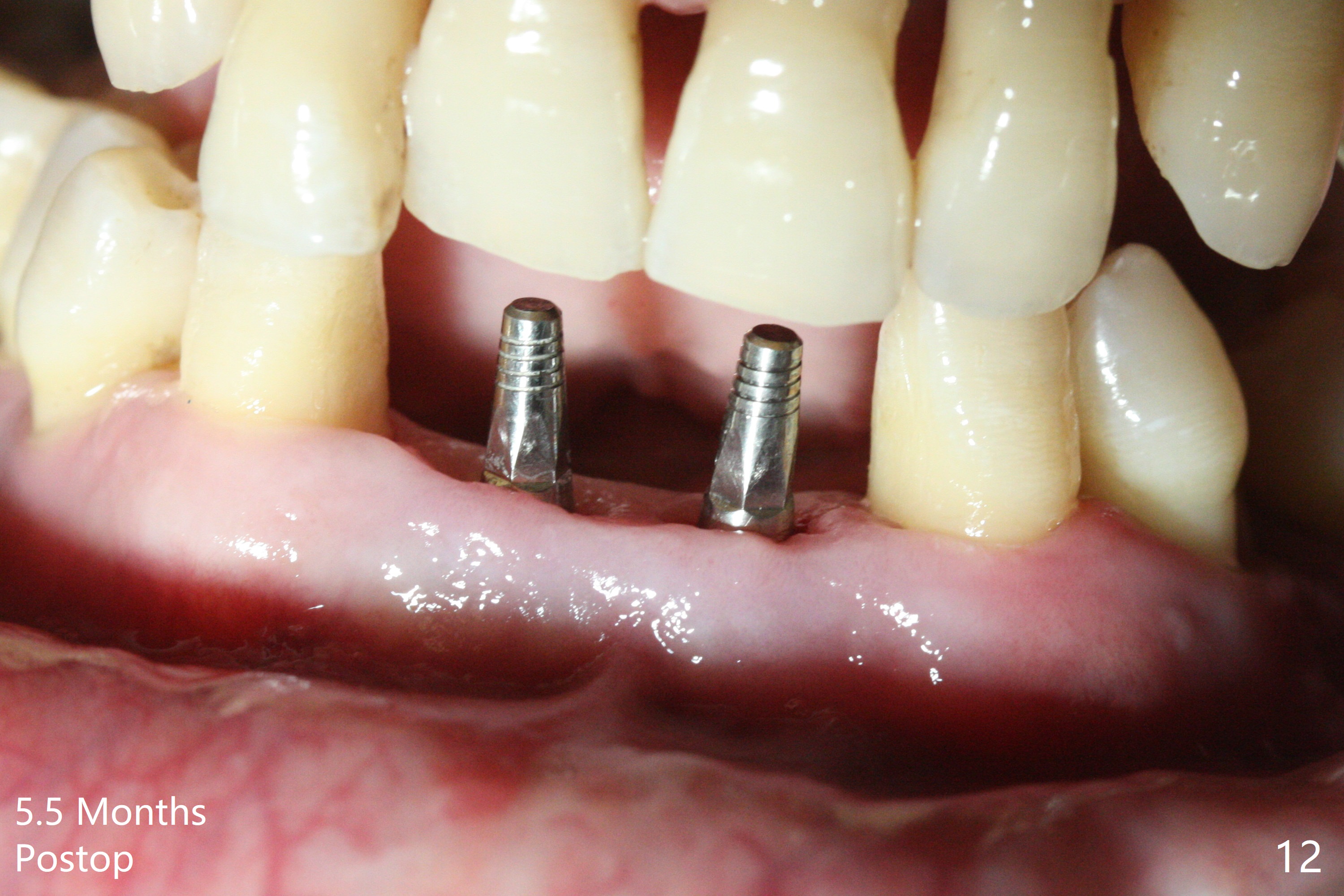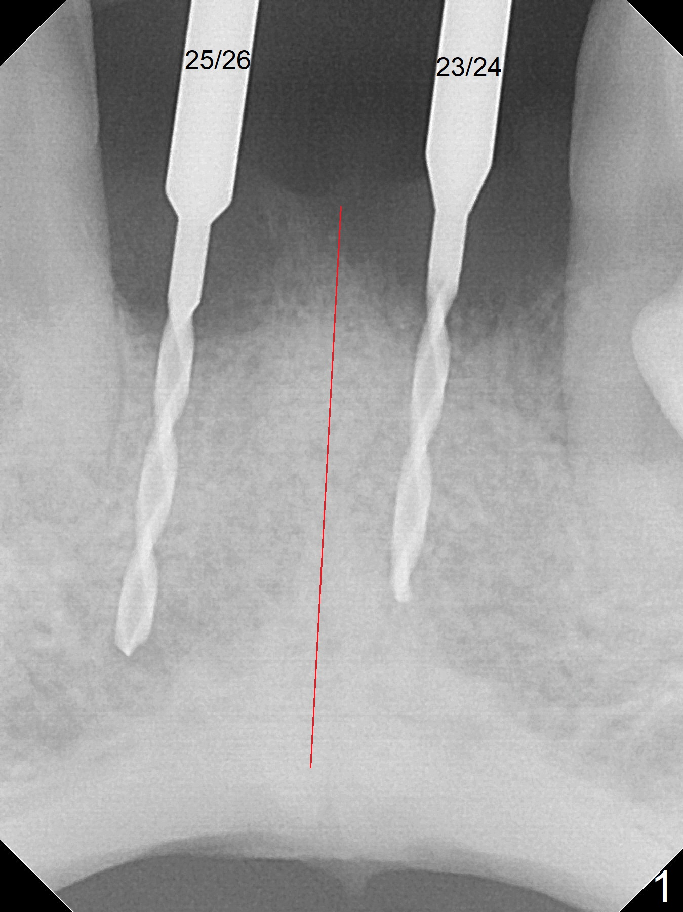 After extraction of 4 of the lower incisors, there are basically 2 sockets (#23/24 and 25/26), separated by the apparently midline bone (Fig.1 red line). In spite of using Lindamann bur to move the 25/26 osteotomy mesially, a 3x14(2) mm dummy implant remains close to the tooth #27 (Fig.2). The terminal branch of the Incisive Canal (<) is located between the lateral and central incisors. A de novo osteotomy (Fig.3 (1.5 mm drill)) is made mesial to the original one (O). While the 3x14(2) mm dummy implant is incompletely placed at #25/26, a 3x14(4) mm 1-piece one is placed at #23/24 (Fig.4). Finally the same implant is placed at #25/26 with placement of mineralized cortical/cancellous bone (Fig.5 *). When the large sockets are sutured, the supraerupted teeth #7-9 touch the lower gingiva (Fig.6). The incisal edge is reduced for clearance (Fig.7). Periodontal dressing is less likely to be dislodged with the incisal edge reduction (Fig.8,9). A provisional FPD is fabricated 1 week postop. Hard (Fig.10) and soft (Fig.11,12) tissues heal 5.5 months postop. The patient returns for crown cementation 3 months post impression (9 months postop, Fig.13,14).