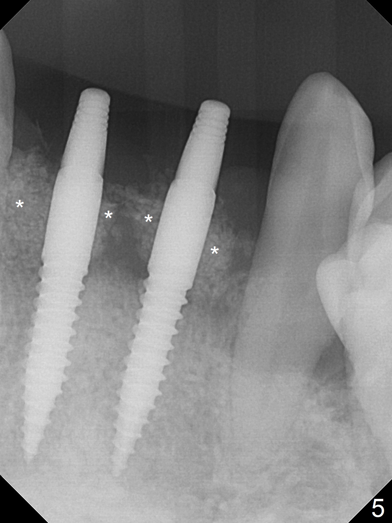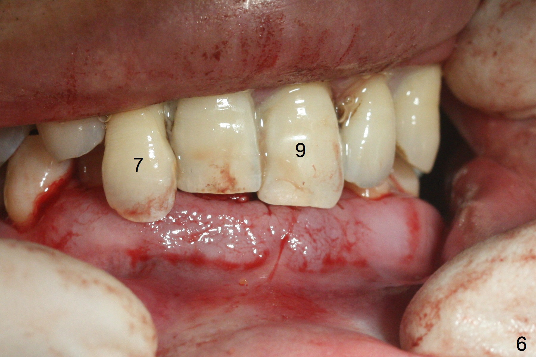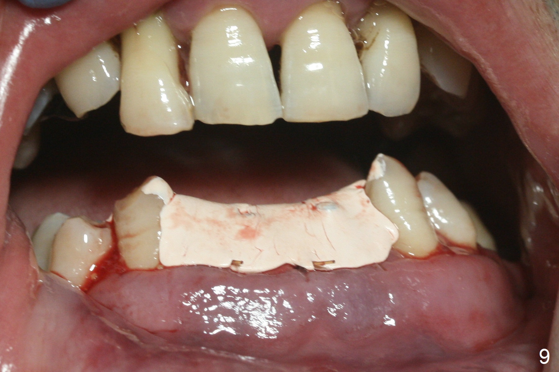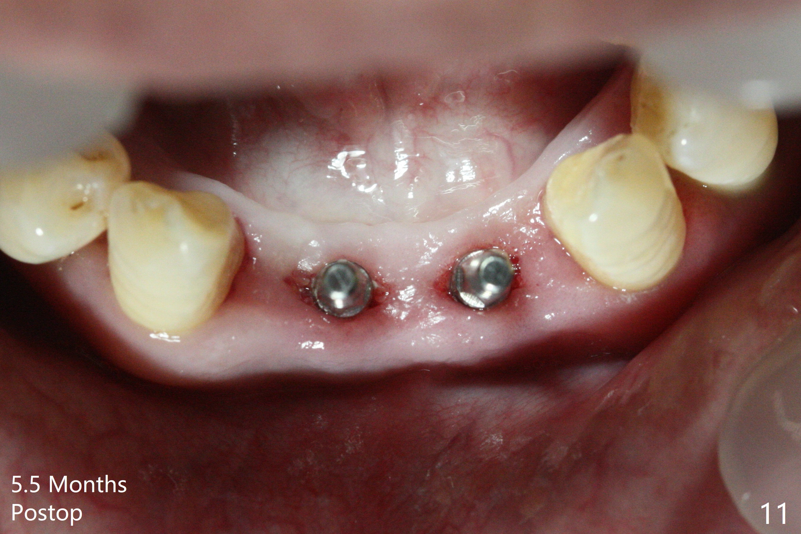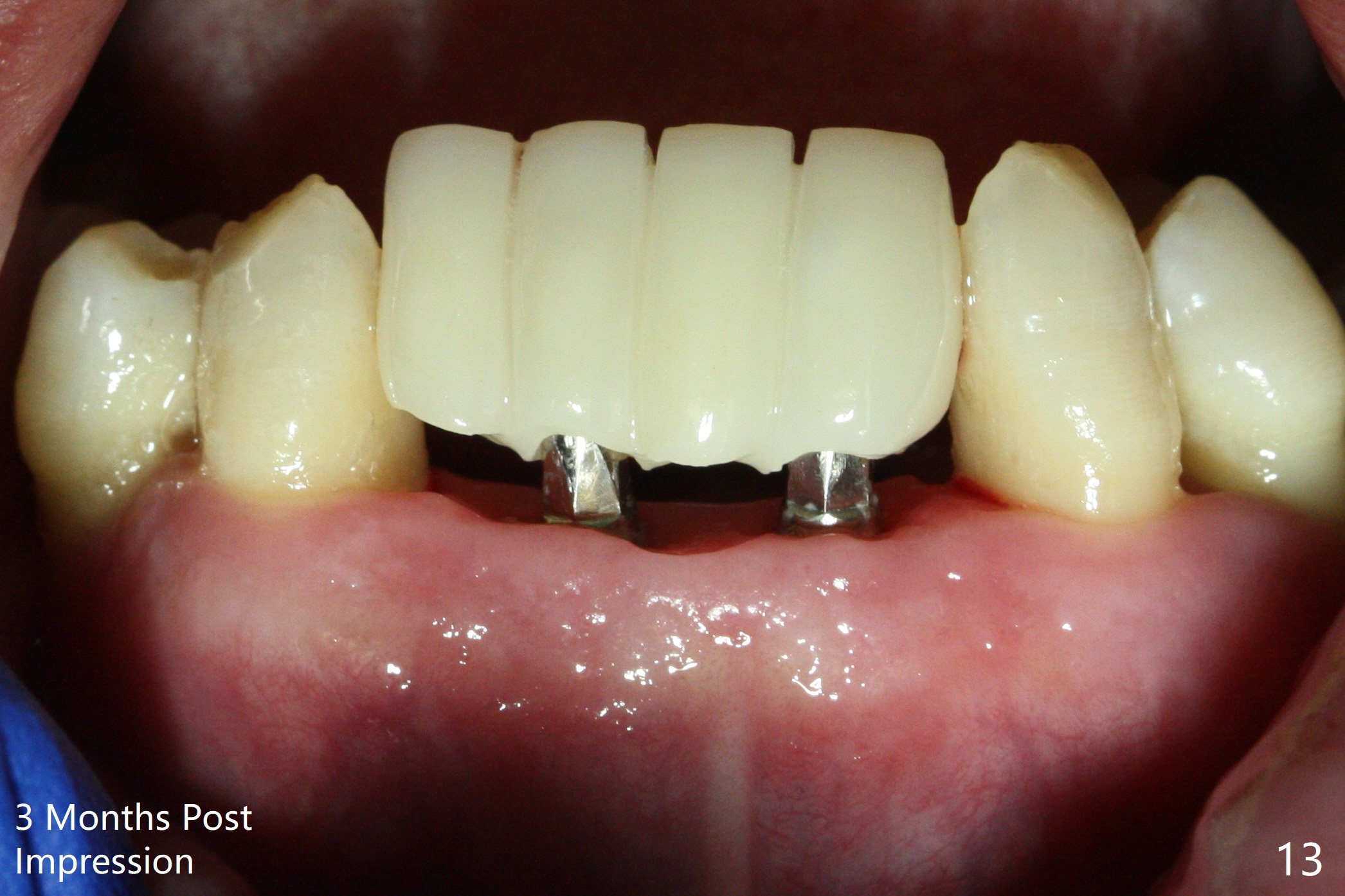 After extraction of 4 of the lower incisors, there are basically 2 sockets (#23/24 and 25/26), separated by the apparently midline bone (Fig.1 red line). In spite of using Lindamann bur to move the 25/26 osteotomy mesially, a 3x14(2) mm dummy implant remains close to the tooth #27 (Fig.2). The terminal branch of the Incisive Canal (<) is located between the lateral and central incisors. A de novo osteotomy (Fig.3 (1.5 mm drill)) is made mesial to the original one (O). While the 3x14(2) mm dummy implant is incompletely placed at #25/26, a 3x14(4) mm 1-piece one is placed at #23/24 (Fig.4). Finally the same implant is placed at #25/26 with placement of mineralized cortical/cancellous bone (Fig.5 *). When the large sockets are sutured, the supraerupted teeth #7-9 touch the lower gingiva (Fig.6). The incisal edge is reduced for clearance (Fig.7). Periodontal dressing is less likely to be dislodged with the incisal edge reduction (Fig.8,9). A provisional FPD is fabricated 1 week postop. Hard (Fig.10) and soft (Fig.11,12) tissues heal 5.5 months postop. The patient returns for crown cementation 3 months post impression (9 months postop, Fig.13,14).