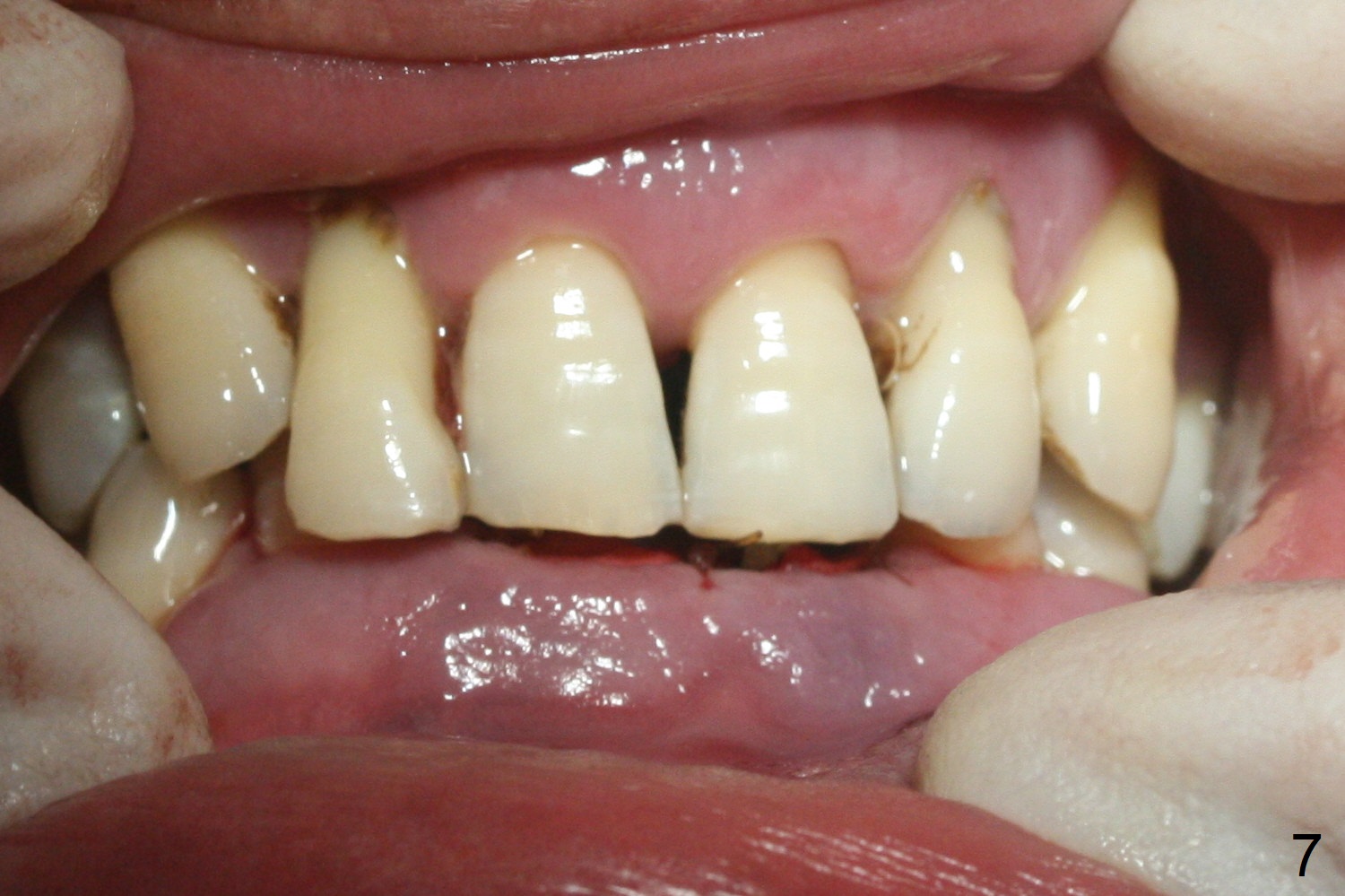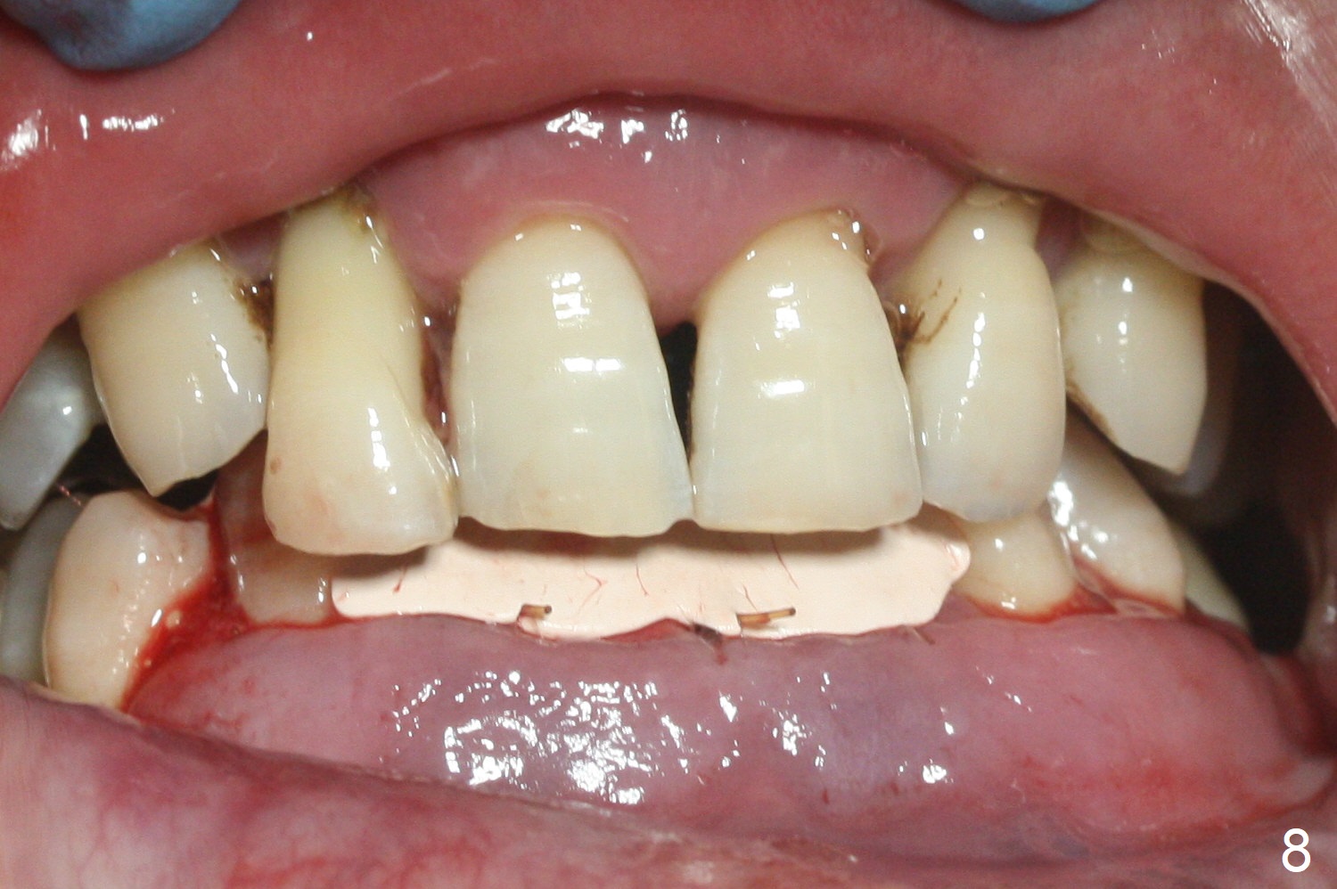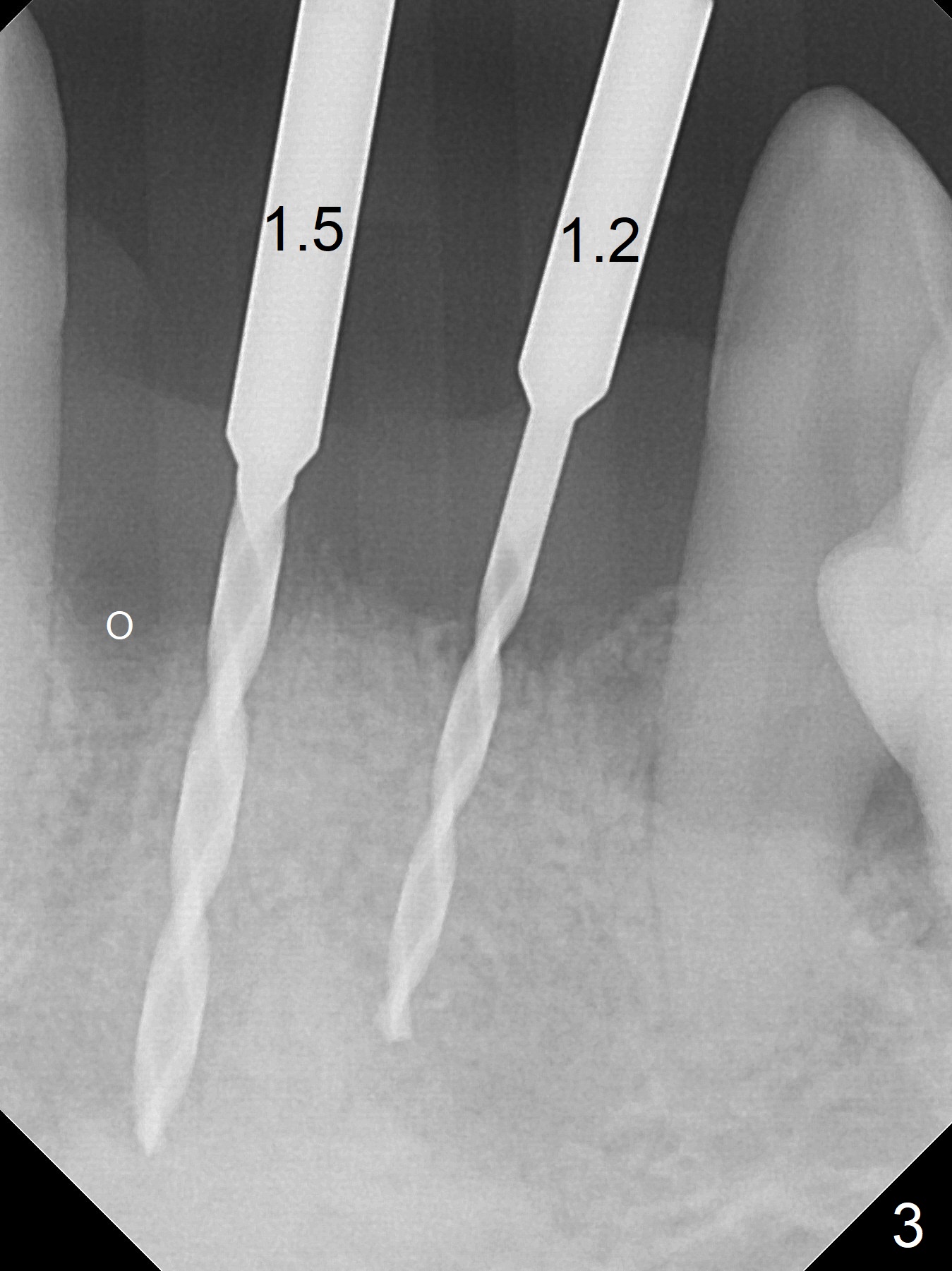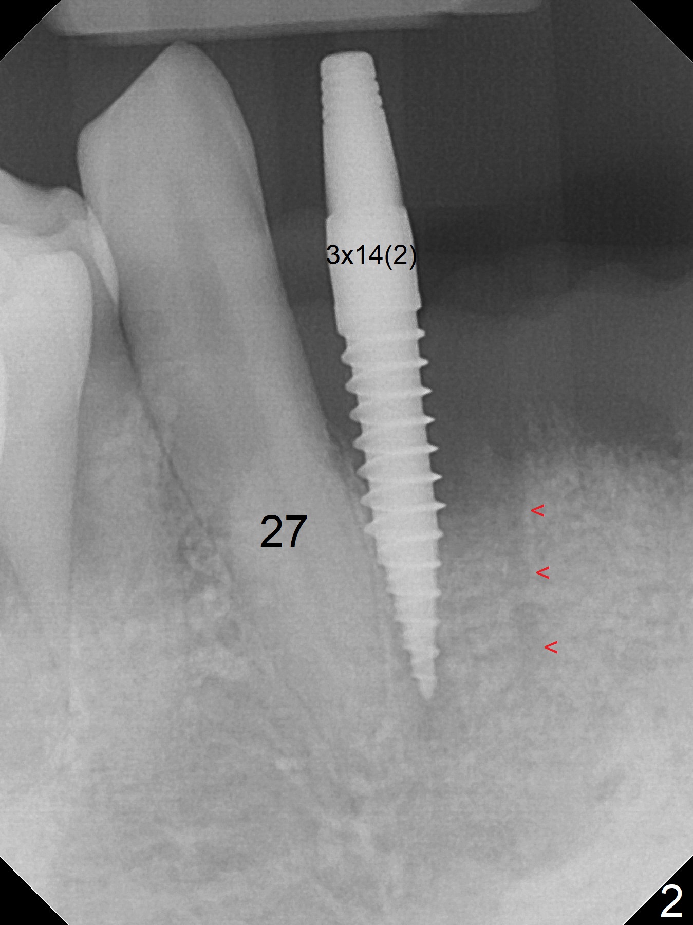After extraction of 4 of the lower incisors, there are basically 2 sockets (#23/24 and 25/26), separated by the apparently midline bone (Fig.1 red line). In spite of using Lindamann bur to move the 25/26 osteotomy mesially, a 3x14(2) mm dummy implant remains close to the tooth #27 (Fig.2). The terminal branch of the Incisive Canal (<) is located between the lateral and central incisors. A de novo osteotomy (Fig.3 (1.5 mm drill)) is made mesial to the original one (O). While the 3x14(2) mm dummy implant is incompletely placed at #25/26, a 3x14(4) mm 1-piece one is placed at #23/24 (Fig.4). Finally the same implant is placed at #25/26 with placement of mineralized cortical/cancellous bone (Fig.5 *). When the large sockets are sutured, the supraerupted teeth #7-9 touch the lower gingiva (Fig.6). The incisal edge is reduced for clearance (Fig.7). Periodontal dressing is less likely to be dislodged with the incisal edge reduction (Fig.8,9). A provisional FPD is fabricated 1 week postop. Hard (Fig.10) and soft (Fig.11,12) tissues heal 5.5 months postop. The patient returns for crown cementation 3 months post impression (9 months postop, Fig.13,14).
