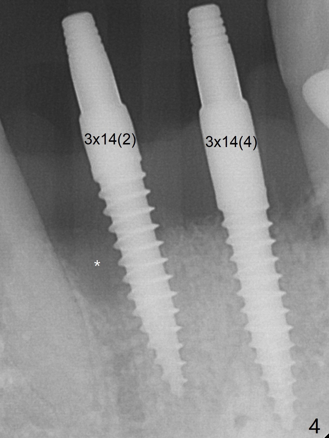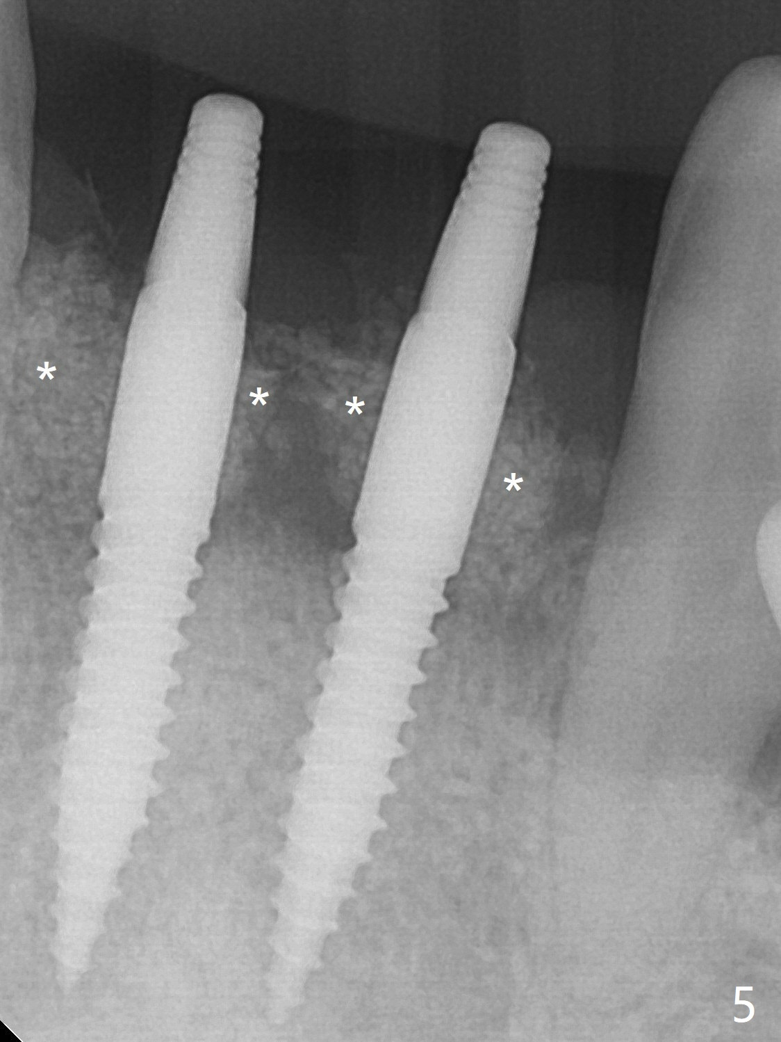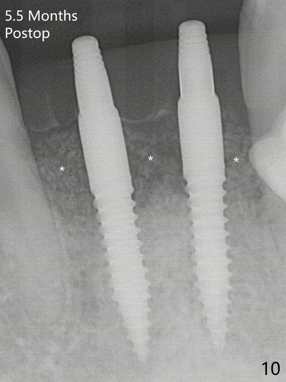 When dummy implants are placed partially, there is a large bony defect (Fig.4 *). After final implants (3x14(4) mm) are placed, allograft is placed coronally (Fig.5 *). Hard tissue heals 5.5 months postop (Fig.10 with formation of apparent bony trabeculae: *).