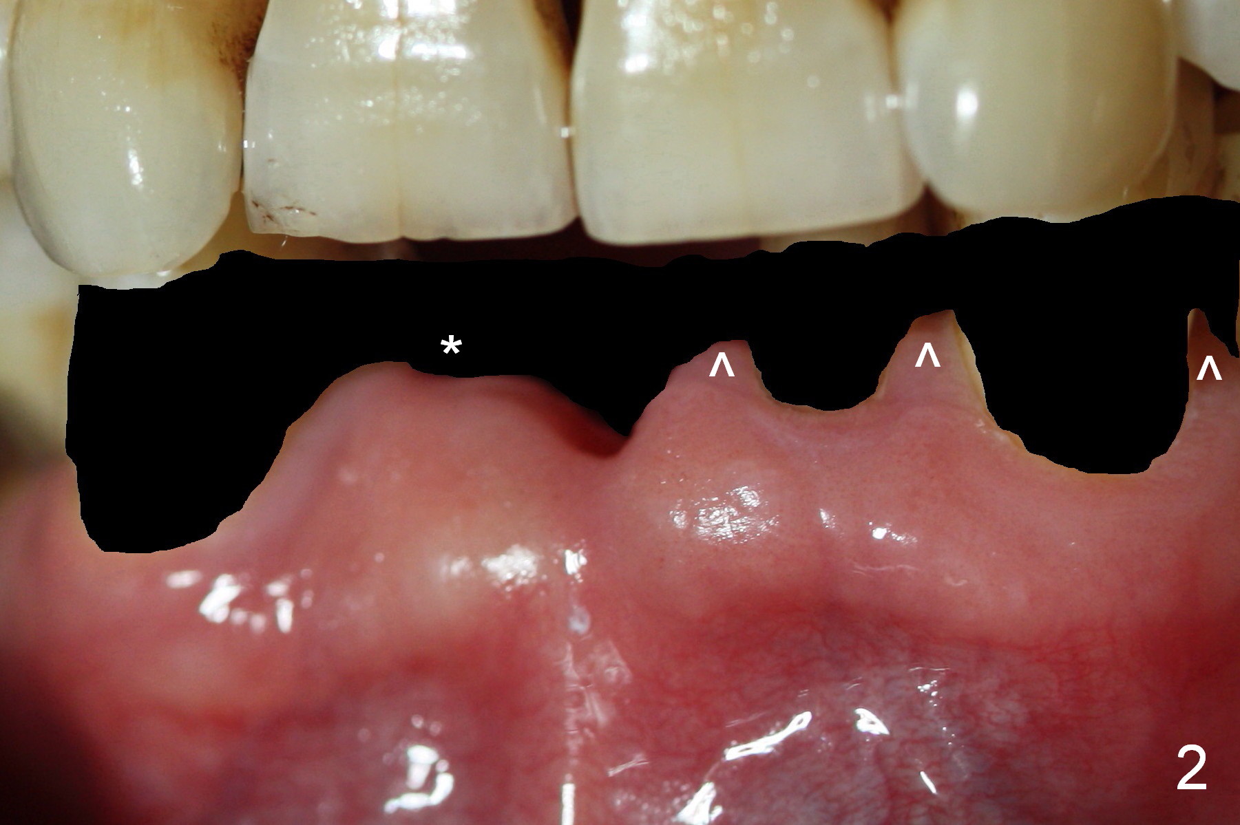 The teeth give the gingiva scallop shaped (Fig.1, 2). The scallop is less where the tooth is absent (Fig.2 *). The scallop must have been distinct when the tooth is just extracted with prominent papillae (Fig.2,3 ^).