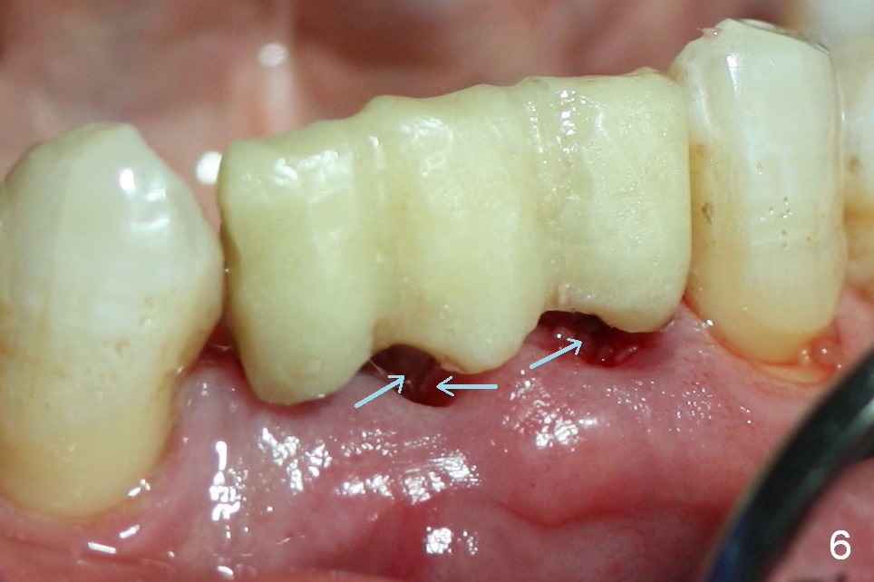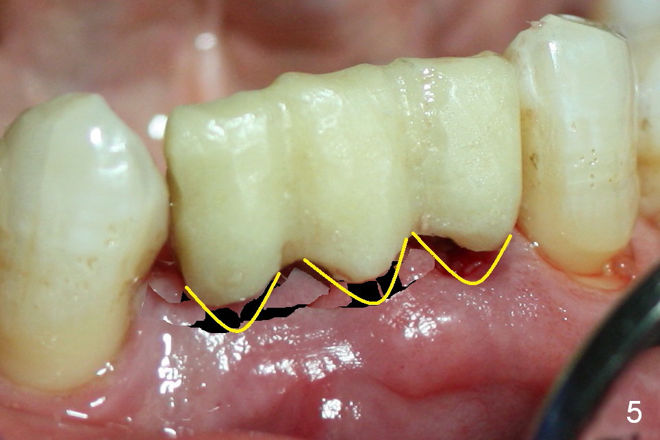 One of the functions of an immediate provisional is to maintain and create the valleys and peaks of the gingival morphology (Fig.4-6). When the wound heals initially, the provisional should be modified (Fig.5 yellow curves) to push the gingiva aside (Fig.6 arrows) to create oval pontic and papillae (Fig.5).