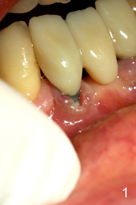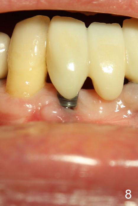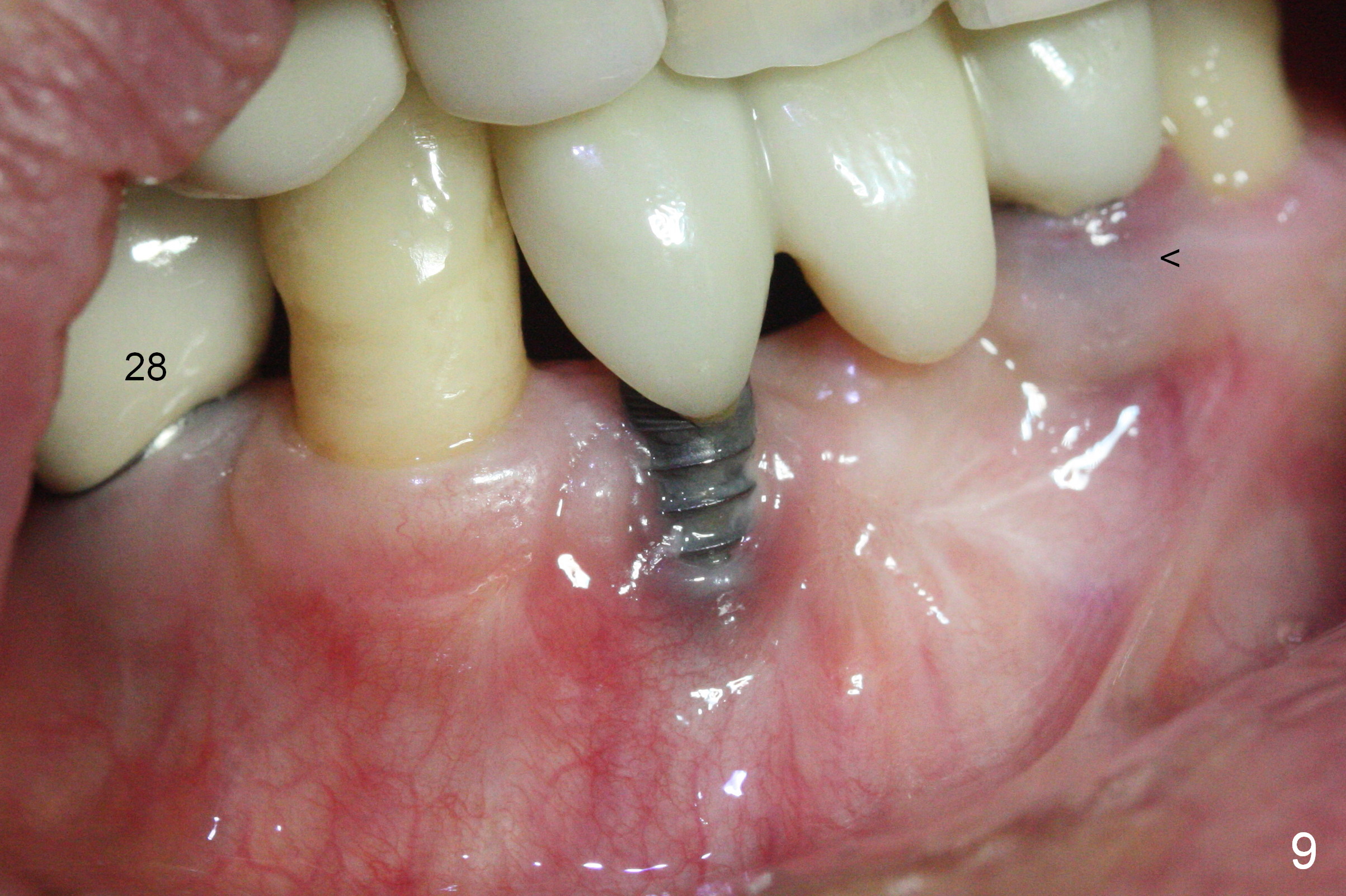 Fig.5 is taken following local anesthesia to show the exposed mesh, 22 days post placement. When the latter is removed, the exposed threads appear to be less (Fig.6, as compared to Fig.2). There is healthy granulation tissue growth apically (*). The patient is asymptomatic 1 month post mesh removal; there is no tenderness around exposed threads (Fig.7). Connective tissue graft is planned to cover the exposed threads through tunnel technique. Thread exposure appears less 3 months post mesh removal (Fig.8). There is infection when the region is not kept clean (Fig.9 (2.5 years post mesh removal)). The other 1-piece implant should have minor implant exposure (<). It appears that there is no thread exposure associated with the immediate implant at #28. Using smaller 1-piece implants (2.5 or 2.0 vs. 3 mm) with flap surgery should be able to prevent the complication. The 72-year-old phobic patient declines any further treatment. Two years later, she agrees to have treatment because of repeated infection (Fig.10). Impression has been taken for stent. After sectioning FPD and removing the infected implant (Tatum), a smaller implant will be placed in between the implants. If her vein is not too small, blood will be drawn for PRF.