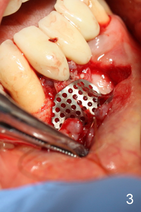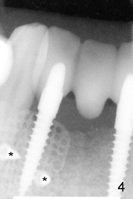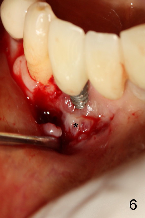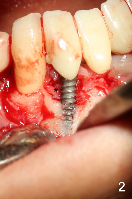 The patient has had chronic pain and swelling associated with the implant at the site of #26 (Fig.1). The extent of implant thread exposure is shown in Fig.2 after flap reflection; inflammatory granulation tissue is present around the most coronal threads (*, one year post cementation). Following debridement and Clindamycin soaking, allograft is placed around the exposed threads; a titanium mesh is used to contain the graft (Fig.3). The flap is closed with tension in spite of the periosteum being underscored. The patient develops moderate to severe ecchymosis postop.