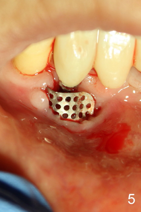The coronal portion of the mesh is exposed with loss of bone graft granules. It appears that the mesh has lost its function. It is planned to be removed. PA is taken 16 days post placement of the mesh (Fig.4).