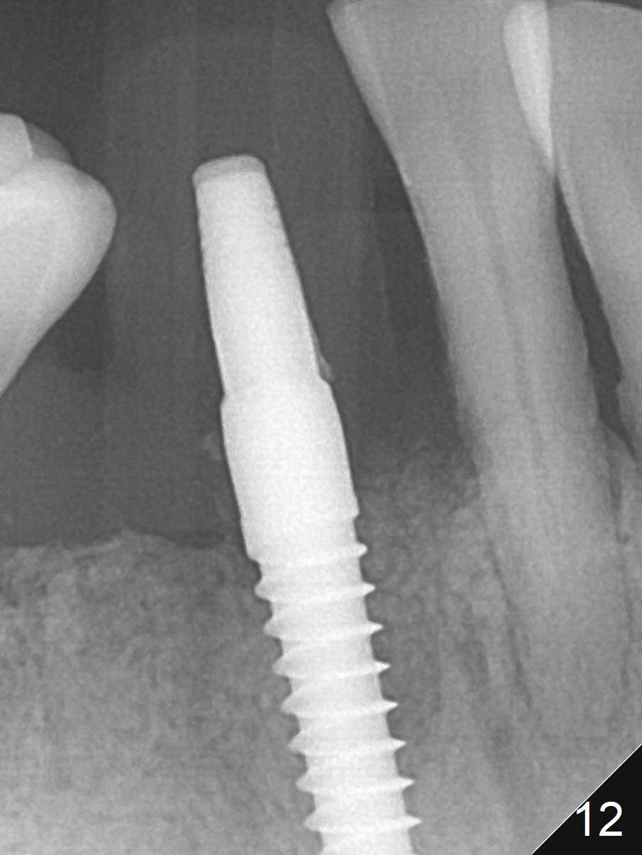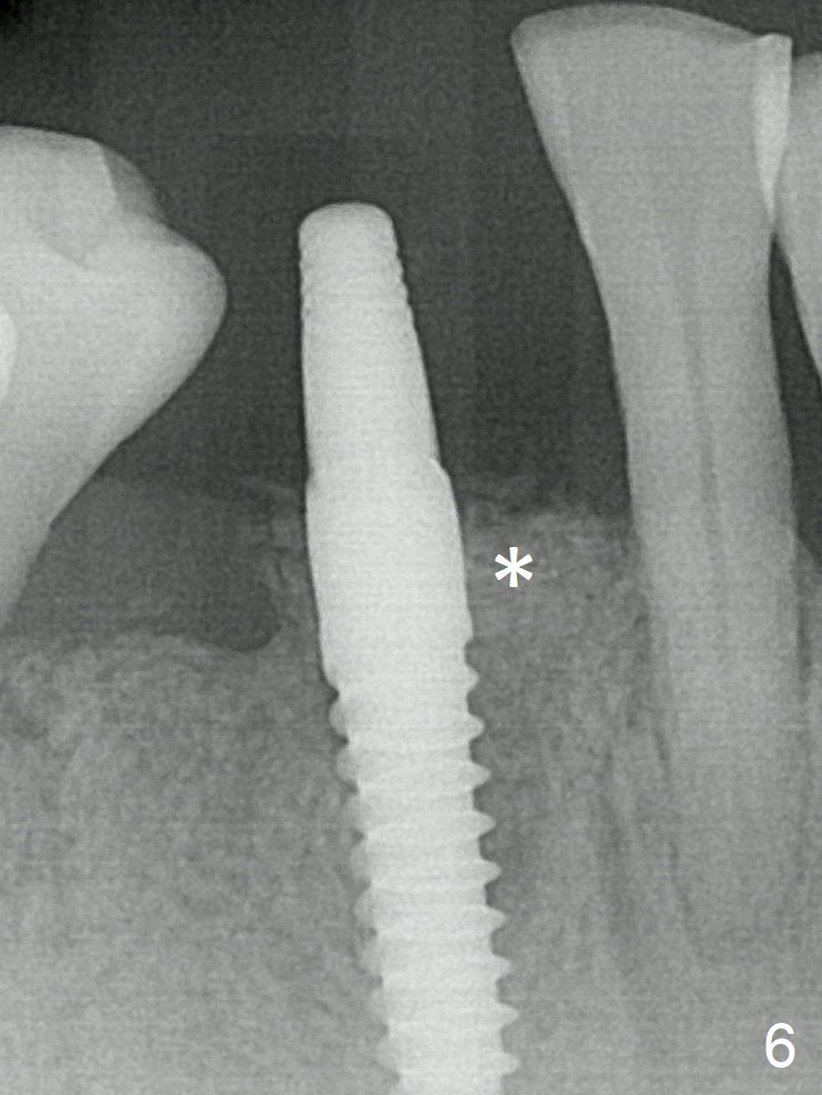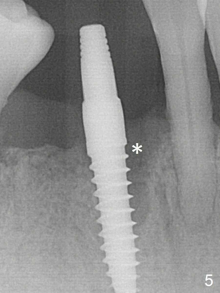 A 3x16(2) mm 1-piece implant is being placed as distal as possible (Fig.5 with 45 Ncm) with the mesial gap (*). The latter is filled with bone graft (Fig.6 *). The implant threads are not exposed 3 months 1 week postop (Fig.12).