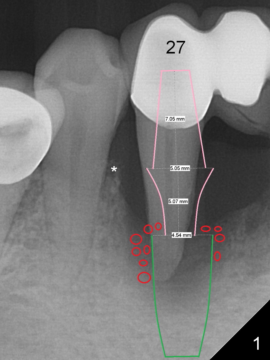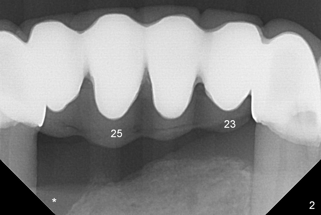 For the same token (severe bone loss at the mesial aspect of the site of #27), the site of #26 is not a good candidate one for implantation (Fig.2 *). The site of #25 is most likely a better one. The site of #23 should be the most favorite one among #23-26, since the edentulous site next to the dentate one is less likely resorbed after extracted. For a FPD, abutments should be far away from each other. No matter what, prepare 1-piece implants (as small as 2.5 and 2.0 mm ones) and surgical handpiece (why?). Take preop photos to show recessive gingiva at #27.