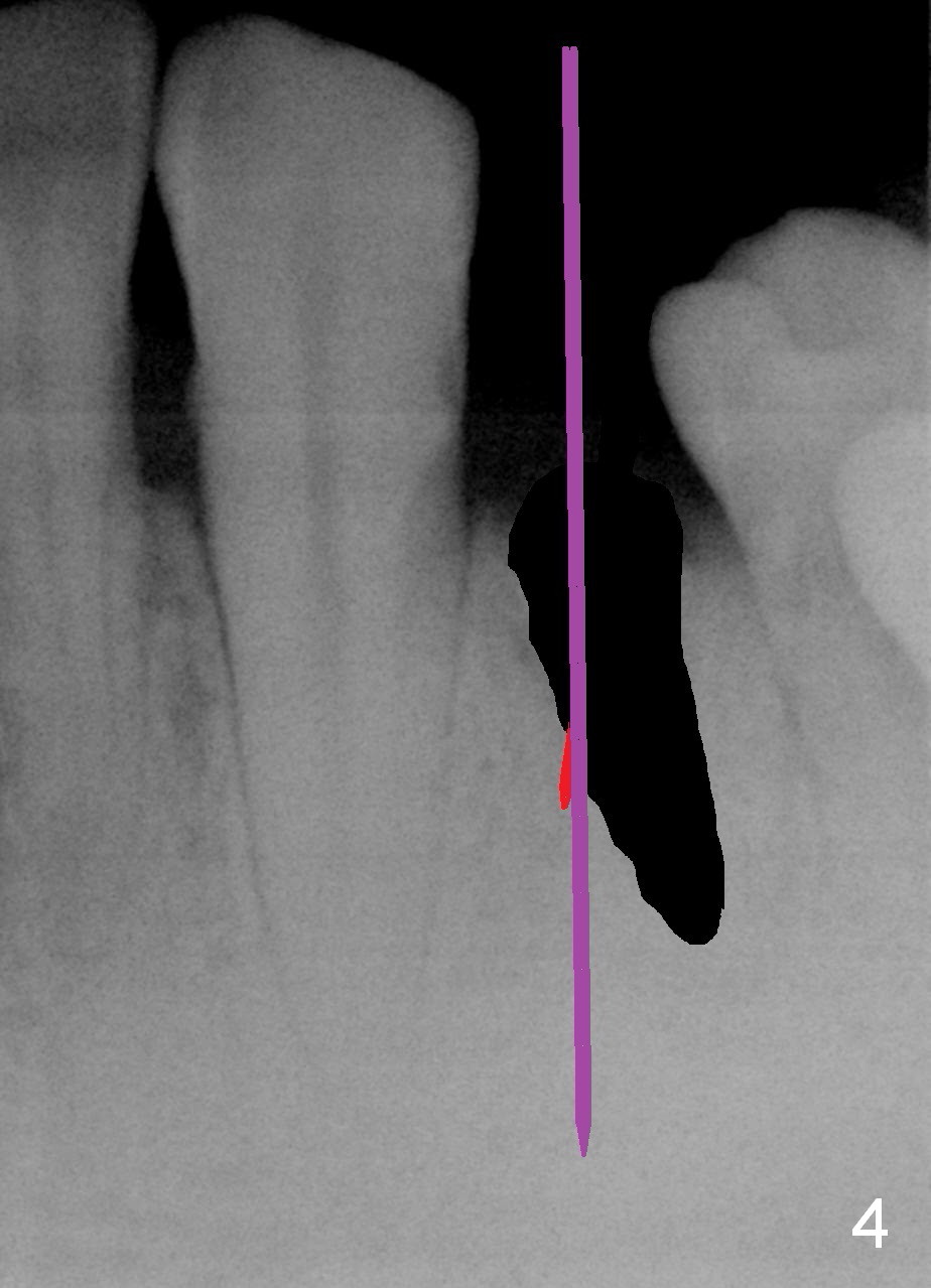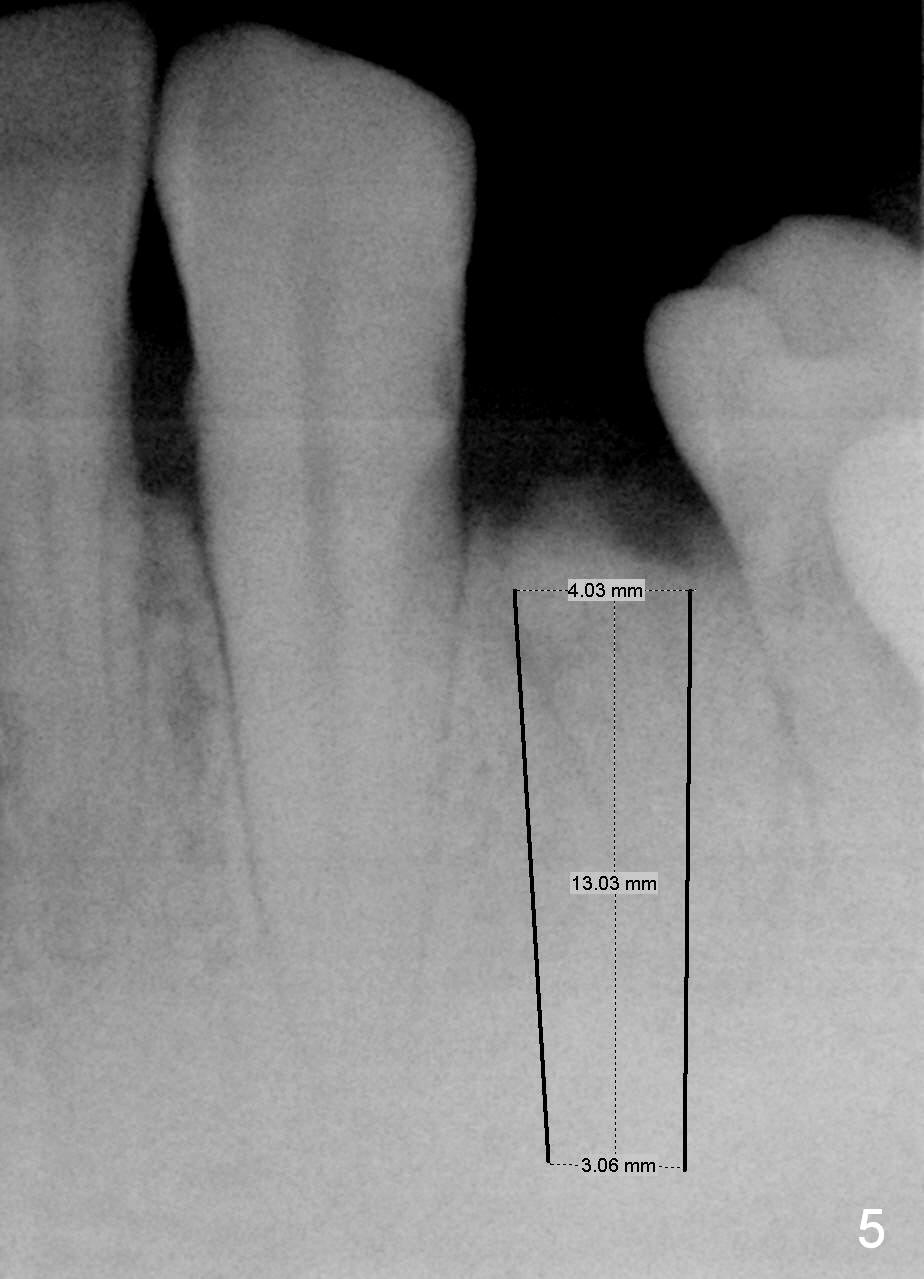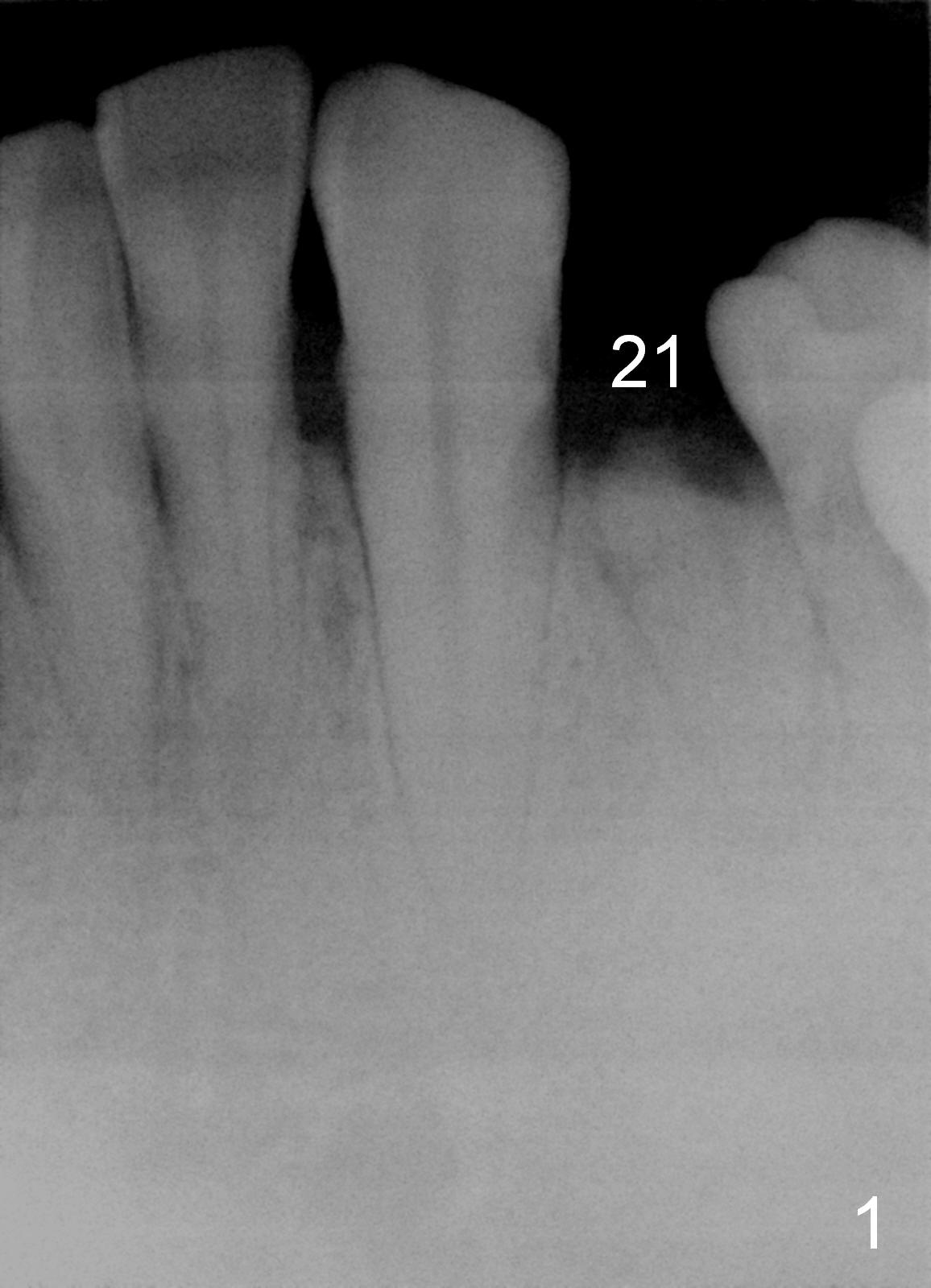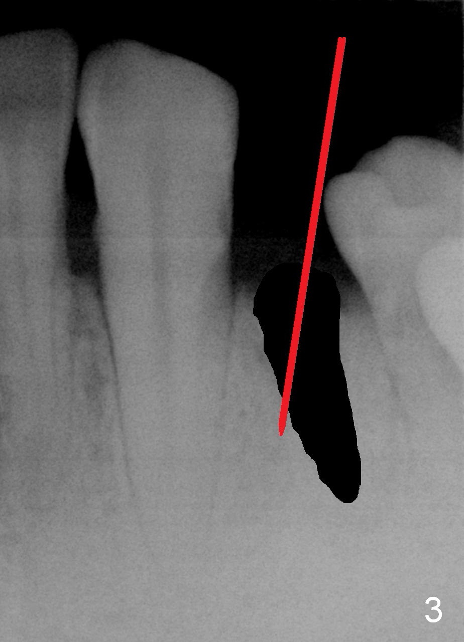 A 48-year-old man requests restoring the fractured tooth #21 (Fig.1). The socket seems to be oblique (Fig.2, no Antibiotic). Also considering the thin buccal plate, the initial osteotomy should be established in the mesiolingual slope (Fig.3). Change the trajectory once the entry is made (Fig.4) and take PA for confirmation. A 4x13 mm implant is to be placed (Fig.5). Why should the implant placed lingually? In fact the implant is placed too lingually. What is the reason?
