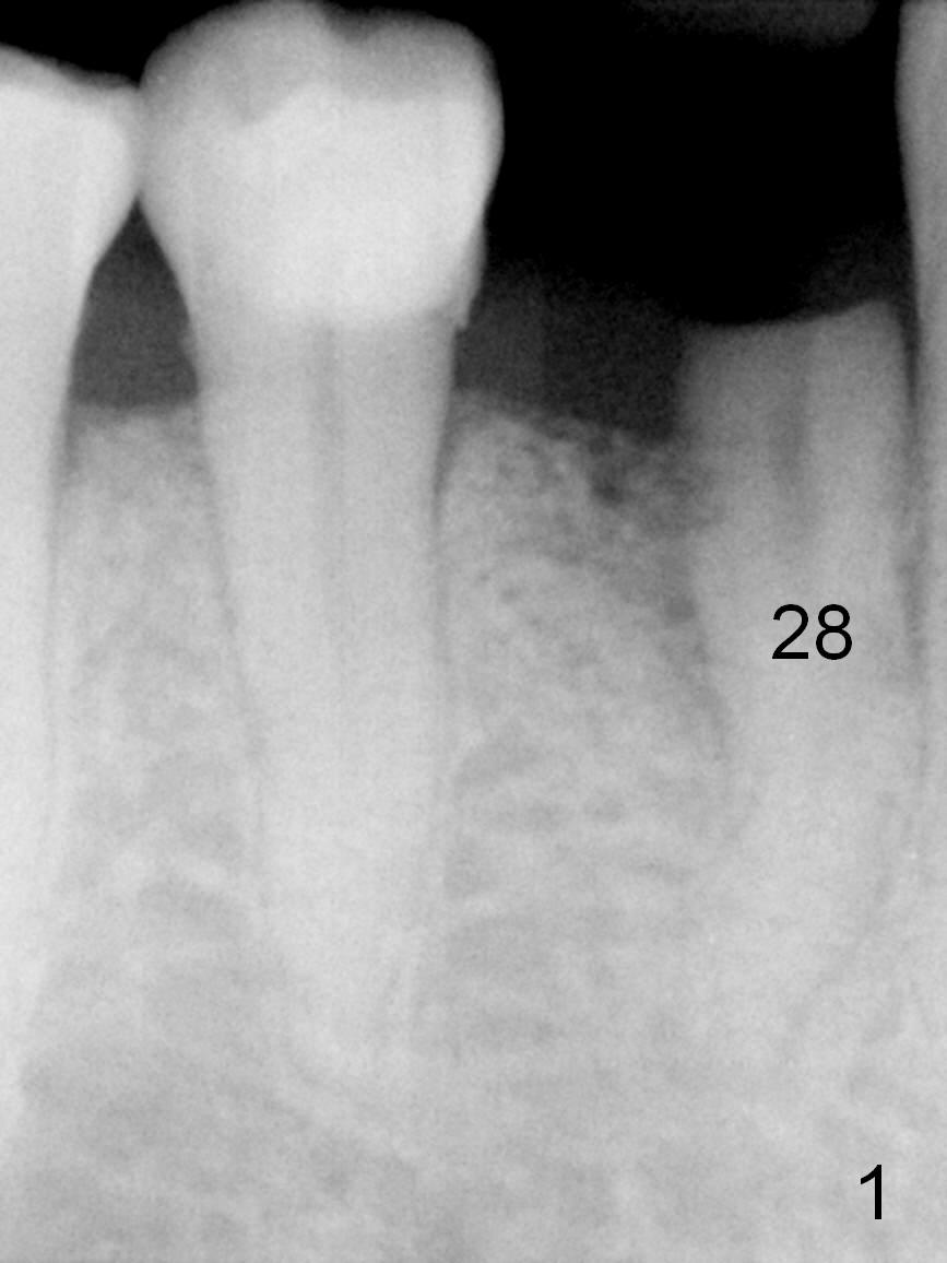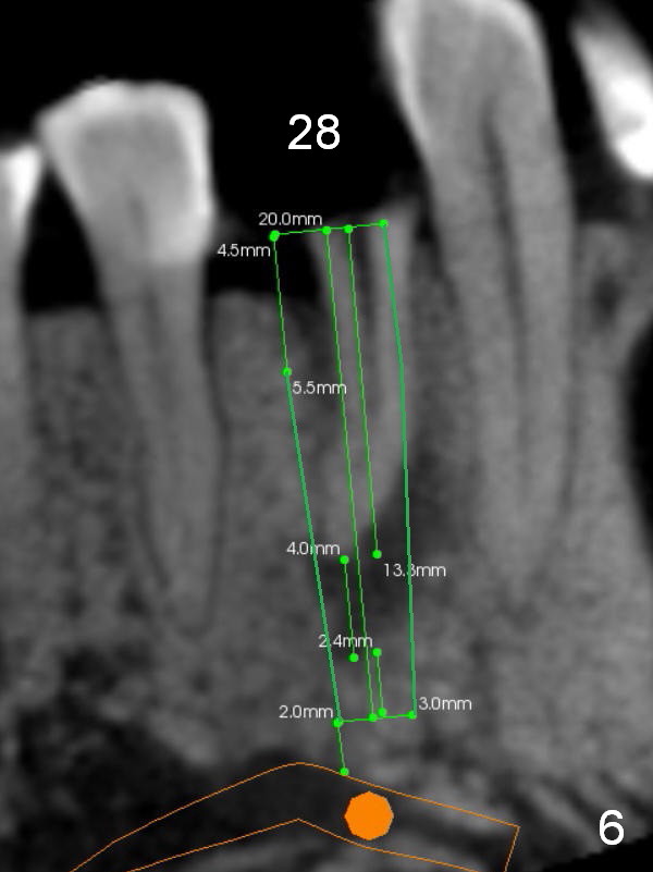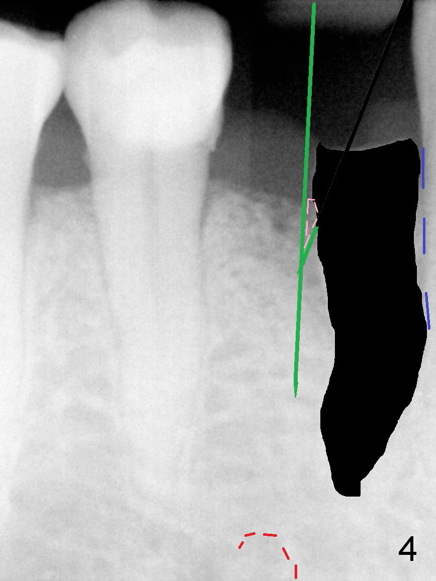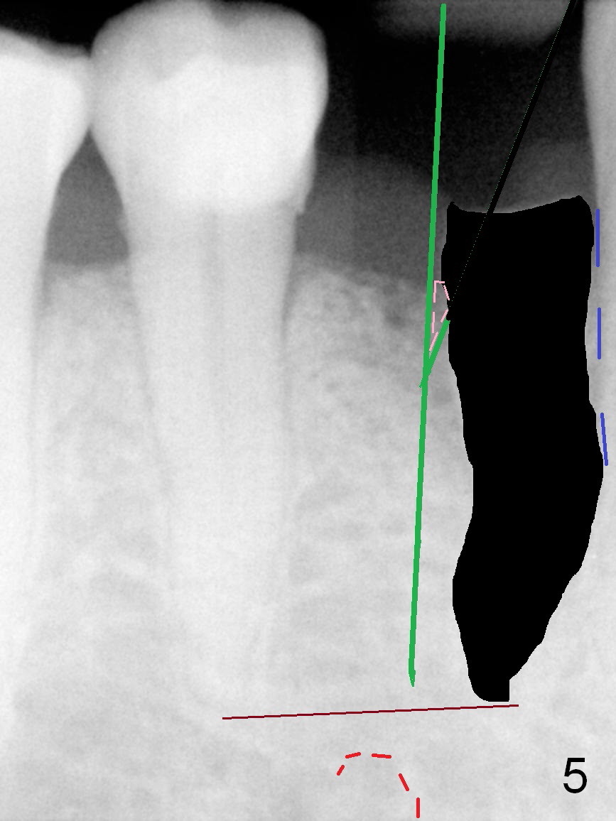 A 73-year-old man requests extraction of the lower right 1st premolar and implant restoration (Fig.1: #28). The root of the affected tooth (Fig.2 black area) is not only curved, but also deviated mesially (close to the root of the canine (blue dashed line). Osteotomy should be established with a sharp 1.5 mm pilot drill obliquely in the distolingual slope of the socket (treated with Metronidazole, Fig.3 (green line)). Once bony penetration is obtained, the drill straightens up in the middle of the socket and along the ideal long axis (Fig.4). Remove the bone in between (Fig.4 pink dashed line) if there is resistance to change in the trajectory. A PA is taken to confirm the position and trajectory. Then extend the osteotomy (Fig.5 green line) , but not beyond the apices of the neighboring tooth and the original socket (brown line), since the Mental Loop is nearby (Fig.2-5 red dashed line).
