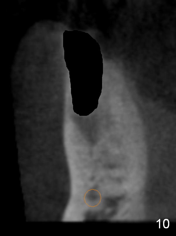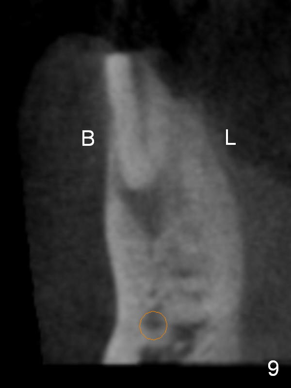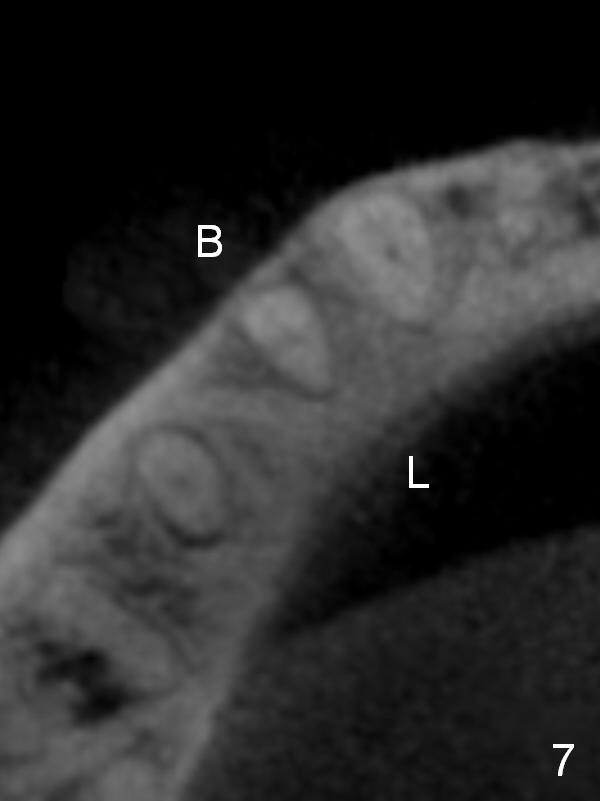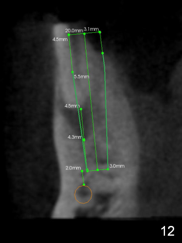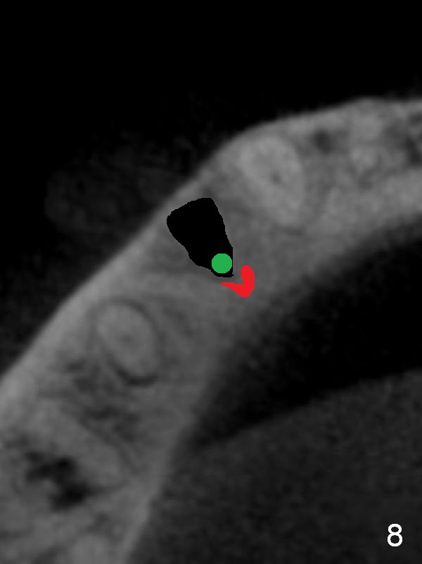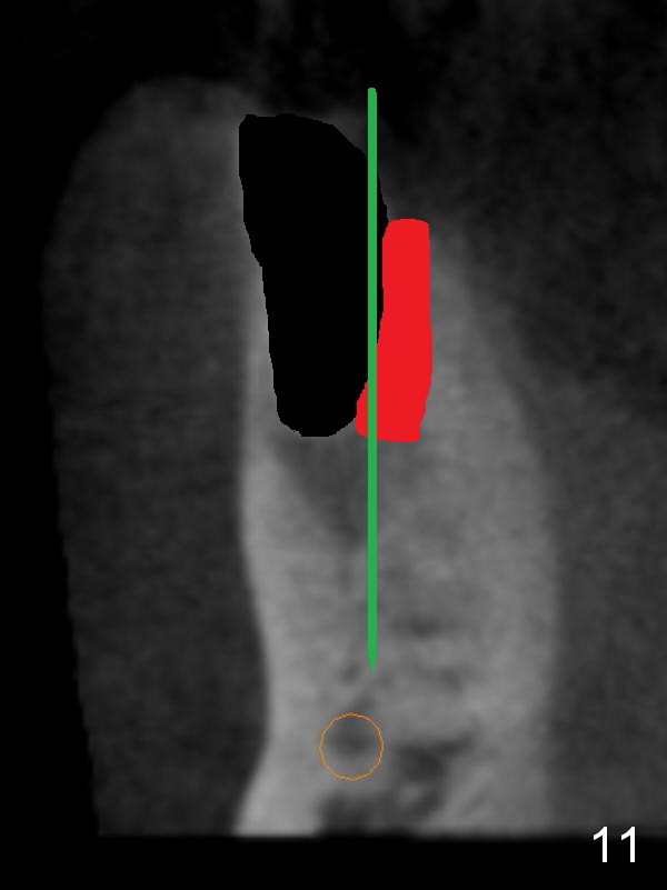 CT sagittal section shows that it is possible to place 4.5x20 mm implant (Fig.6). Axial (Fig.7) and coronal (Fig.9) sections show that the lingual (L) plate is much thicker than the buccal (B) one. To prevent the implant being buccally deviated, a Lindermann bur is used after extraction (black area in Fig.8,10) to remove ~ 1mm bone from the lingual plate (red area in Fig.8,11). A 2 mm pilot drill is placed as lingual as possible (green in Fig.8,11). If the implant (Fig.12) starts to deviate buccally while being placed, remove it from the osteotomy and remove more bone from the lingual plate. Place the implant again and monitor the trajectory tightly.