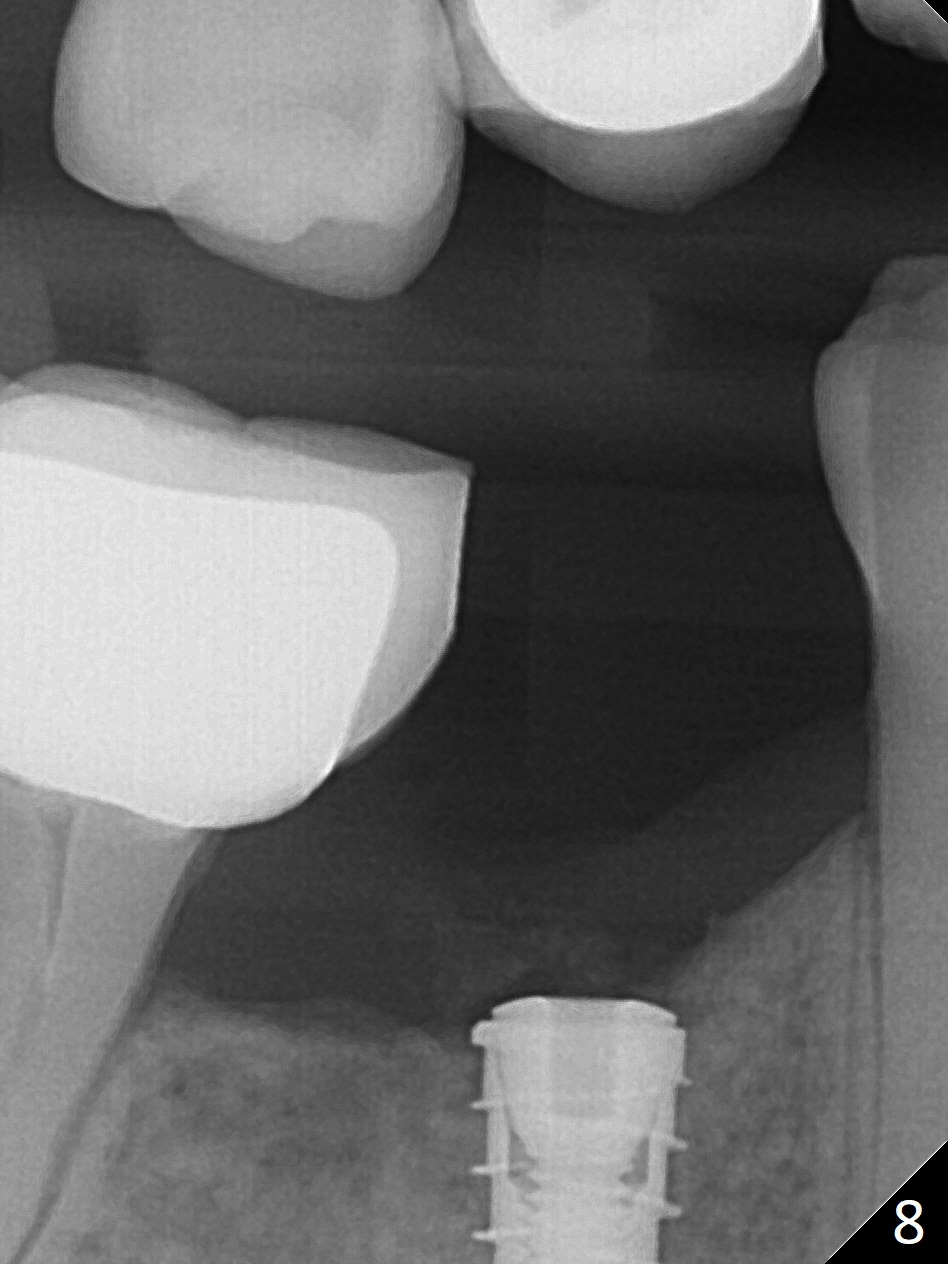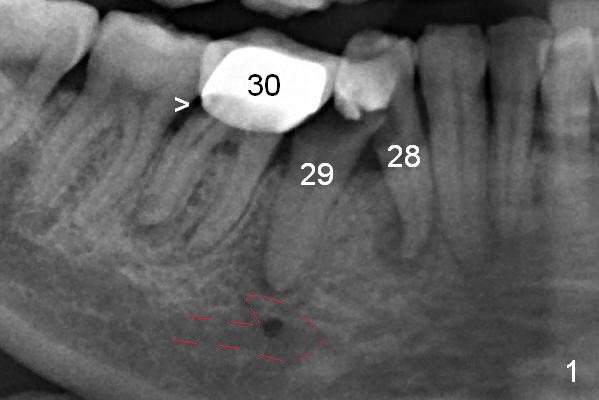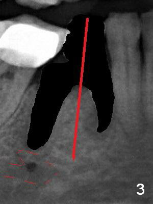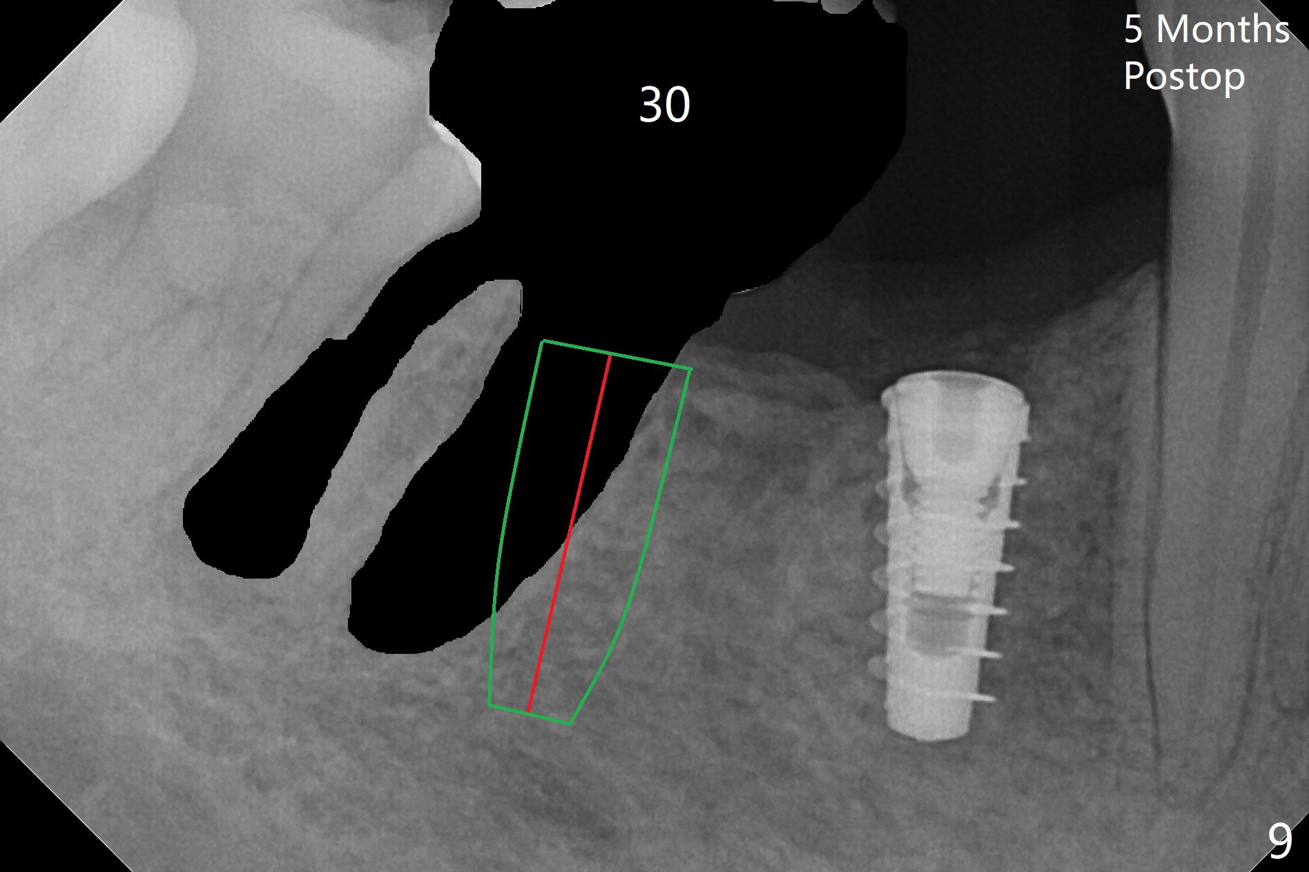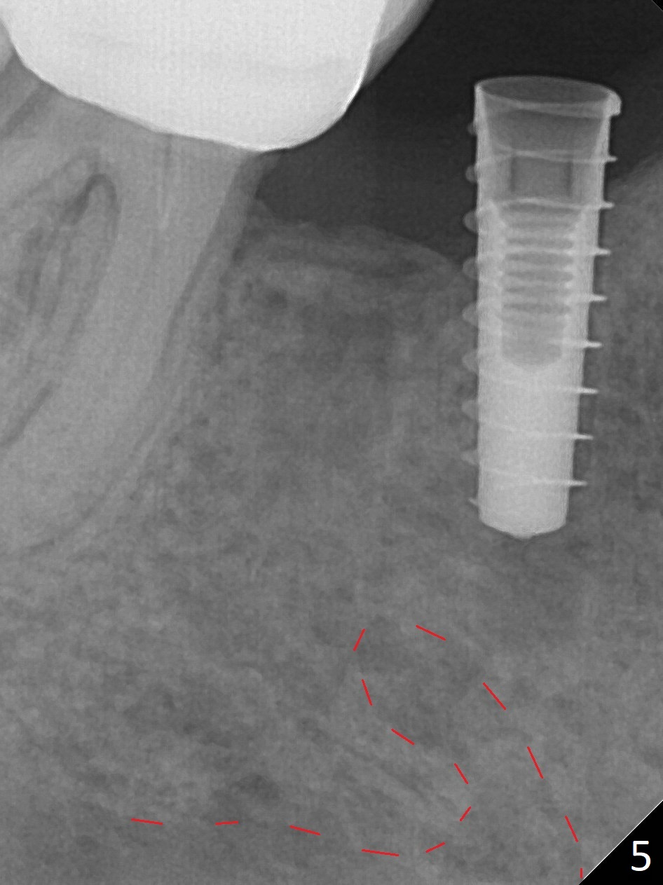 The patient returns for implant placement 11 months post extraction of #28 and 29. With flapless manner, initial osteotomy happens to drop into the original socket of #28 (Fig.4). After use of 3.3 mm Magic Drill (MD) and Final Drill for 15 mm, a 4x11 mm dummy implant is placed (Fig.5). It appears that the implant is long for the site (red dashed line: Mental Loop). However, a definitive implant (4x9 mm, IBS) has difficulty to reach its depth (Fig.6). After several rounds of untorque and retorque, the implant does not seat completely (Fig.7, implant driver disengagement) with autogenous bone placed distal (>). Retrospectively, a larger MD should have been used (3.8 mm) for complete seating in the dense bone. In fact she is post breast cancer treatment with 50% chance of relapse. The patient returns for follow up 1.5 months postop (Fig.8). The wound has healed. Impression is taken 5 months postop (Fig.9). When the crown is cemented, food impaction is an issue between the implant crown and crown at #30. Since the tooth #30 is mesially tilted with distal open margin and apical infection, the tooth will be extracted. Osteotomy is going to be initiated in the mesial slope of the mesial socket (Fig.9 red line). An implant will be placed more or less in the mesial socket (green box).