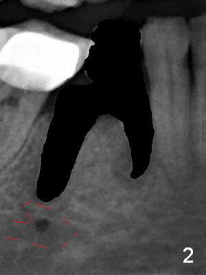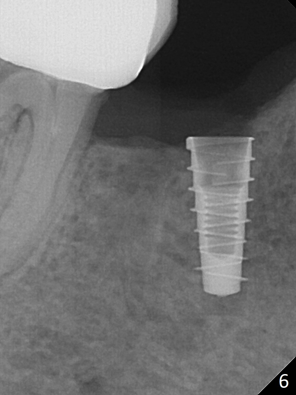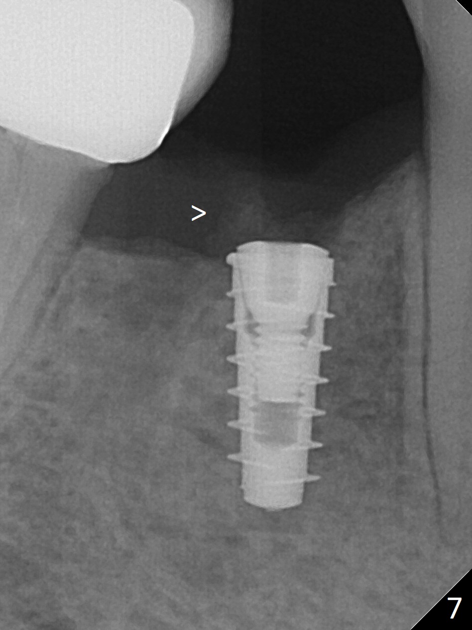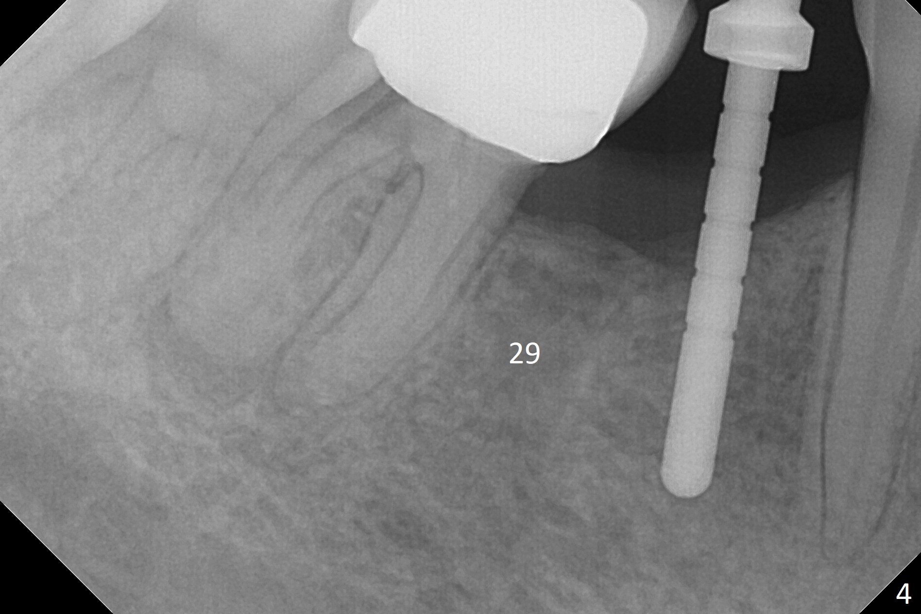 The patient returns for implant placement 11 months post extraction of #28 and 29. With flapless manner, initial osteotomy happens to drop into the original socket of #28 (Fig.4). After use of 3.3 mm Magic Drill (MD) and Final Drill for 15 mm, a 4x11 mm dummy implant is placed (Fig.5). It appears that the implant is long for the site (red dashed line: Mental Loop). However, a definitive implant (4x9 mm, IBS) has difficulty to reach its depth (Fig.6). After several rounds of untorque and retorque, the implant does not seat completely (Fig.7, implant driver disengagement) with autogenous bone placed distal (>). Retrospectively, a larger MD should have been used (3.8 mm) for complete seating in the dense bone. In fact she is post breast cancer treatment with 50% chance of relapse. The patient returns for follow up 1.5 months postop (Fig.8). The wound has healed. Impression is taken 5 months postop (Fig.9). When the crown is cemented, food impaction is an issue between the implant crown and crown at #30. Since the tooth #30 is mesially tilted with distal open margin and apical infection, the tooth will be extracted. Osteotomy is going to be initiated in the mesial slope of the mesial socket (Fig.9 red line). An implant will be placed more or less in the mesial socket (green box).