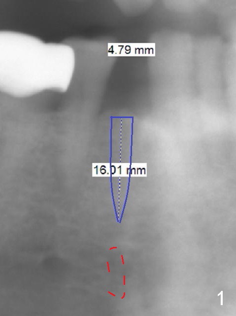 Three weeks post #2 and 4 implantation, the patient requests implantation at #28. If the narrow mesiodistal space (Fig.1 (panoramic X-ray)) is confirmed clinically (using implant positioner), a 3x16 mm 1-piece implant (DIO) will be placed. Also prepare Tatum 3.5 mm 1-piece implant. If there is no space limitation, use an IBS one (4 or 4.5 mm).