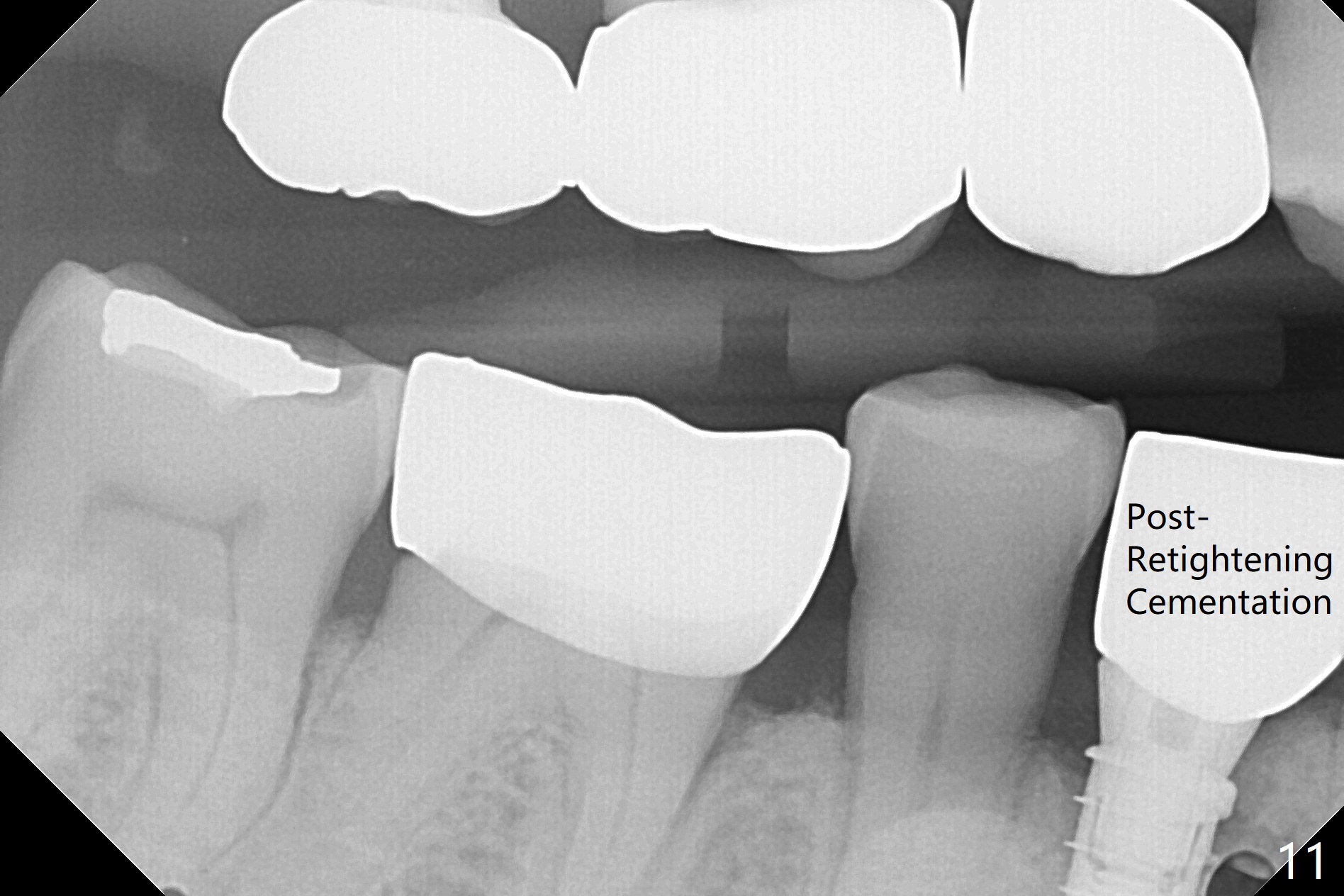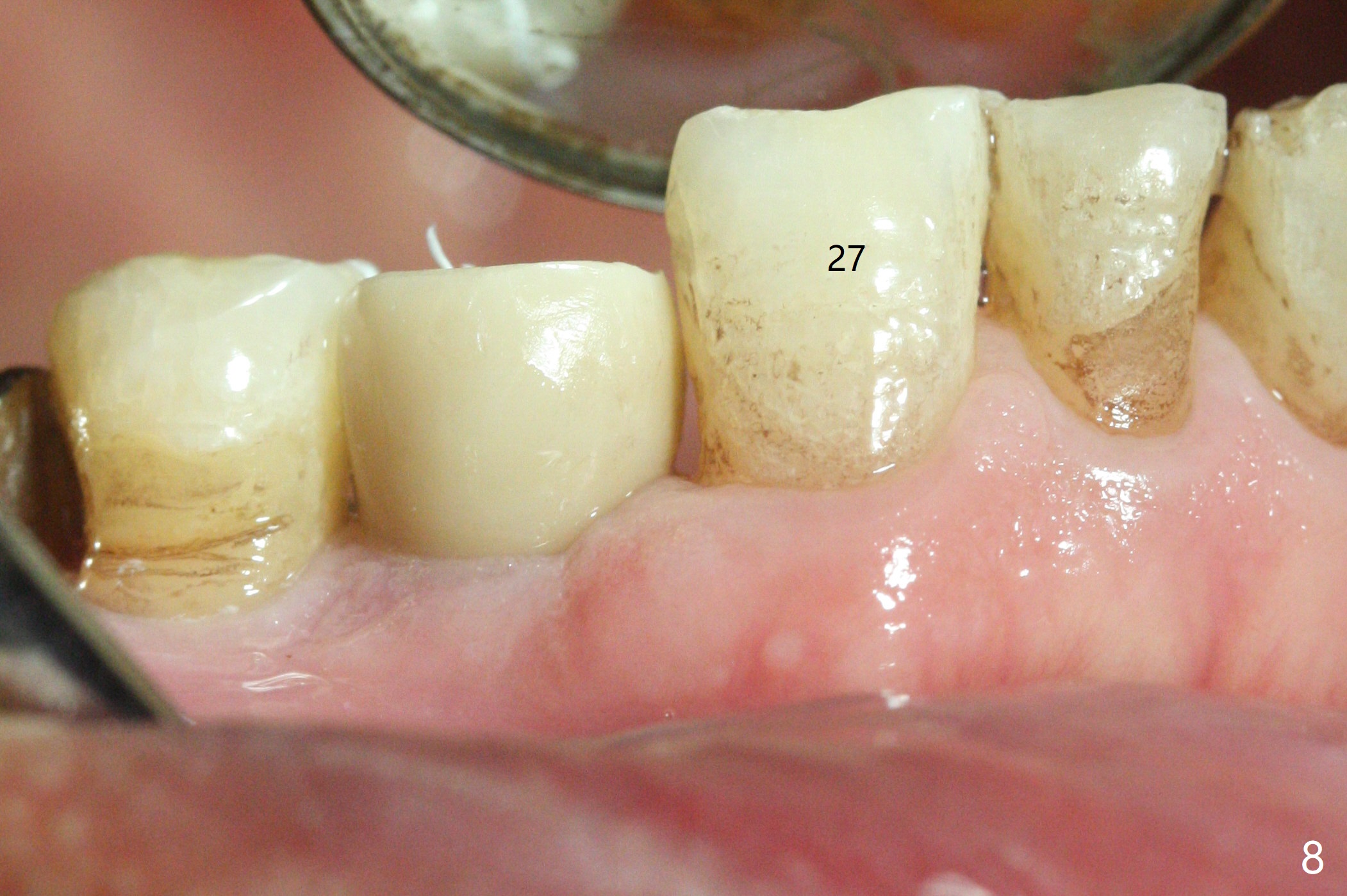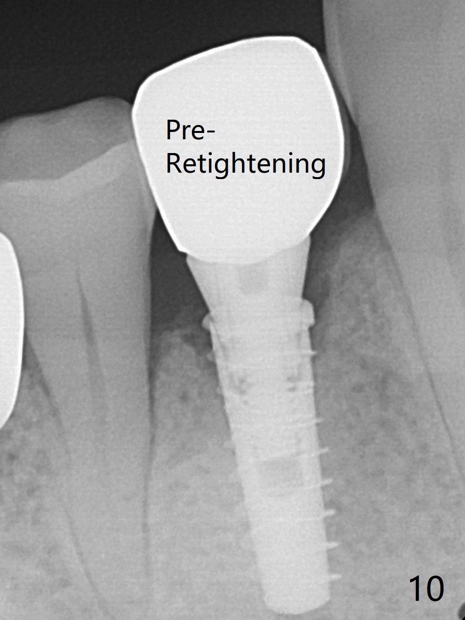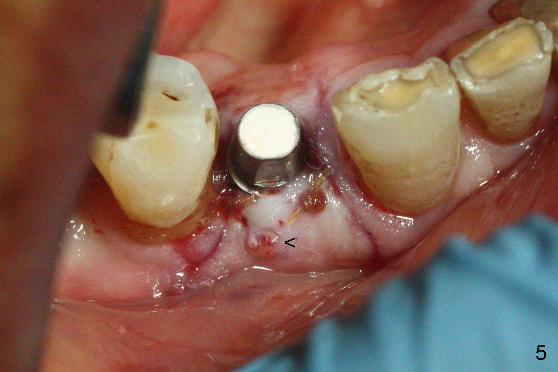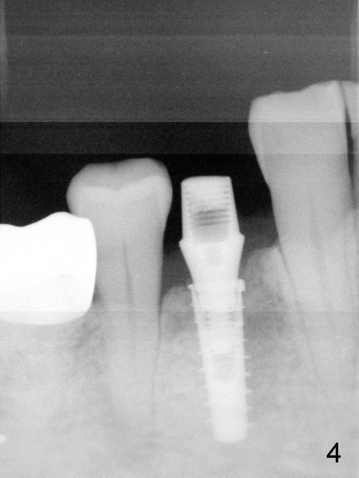 In fact the mesiodistal space of the site of #28 is within normal limit. The buccal plate atrophy is striking (Fig.1) with a fistula (^, associated with underlying residual root tip). When the flaps are raised, the ridge is triangular with the lingual plate (Fig.2 *) higher than the buccal one. Because of the slope, the multiple-drill approach is adopted in stead of single-drill one, because the marking bur is wobbling after 1.6 mm osteotomy at 13 mm (Fig.3). After placement of a 4x11 mm implant, a 4.5x4(2) mm abutment is inserted (Fig.4). The abutment and the implant act as a mesh (framework) so that bone graft and collagen membrane can be laid upon them buccolingually. When the flaps are sutured, there is less tension than that without the abutment. Furthermore, the buccal tissue volume seems to be increased (Fig.5 (<: fistula, which should heal soon), as compared to Fig.1). Tale photos to show effectiveness of the simultaneous GBR and disappearance of the fistula. Three months postop (Fig.6,7 (incomplete abutment seating)), the implant is loaded for intrusion of the opposing supraerupted tooth. The patient returns with chief complaint of food impaction between #27 and 28 three years 7 months post cementation; there is an open contact. Before pick up impression the distal convex surface of #27 is trimmed. The repaired crown has tight proximal contacts before (Fig.9,10) and after (Fig.11) retightening and cementation.