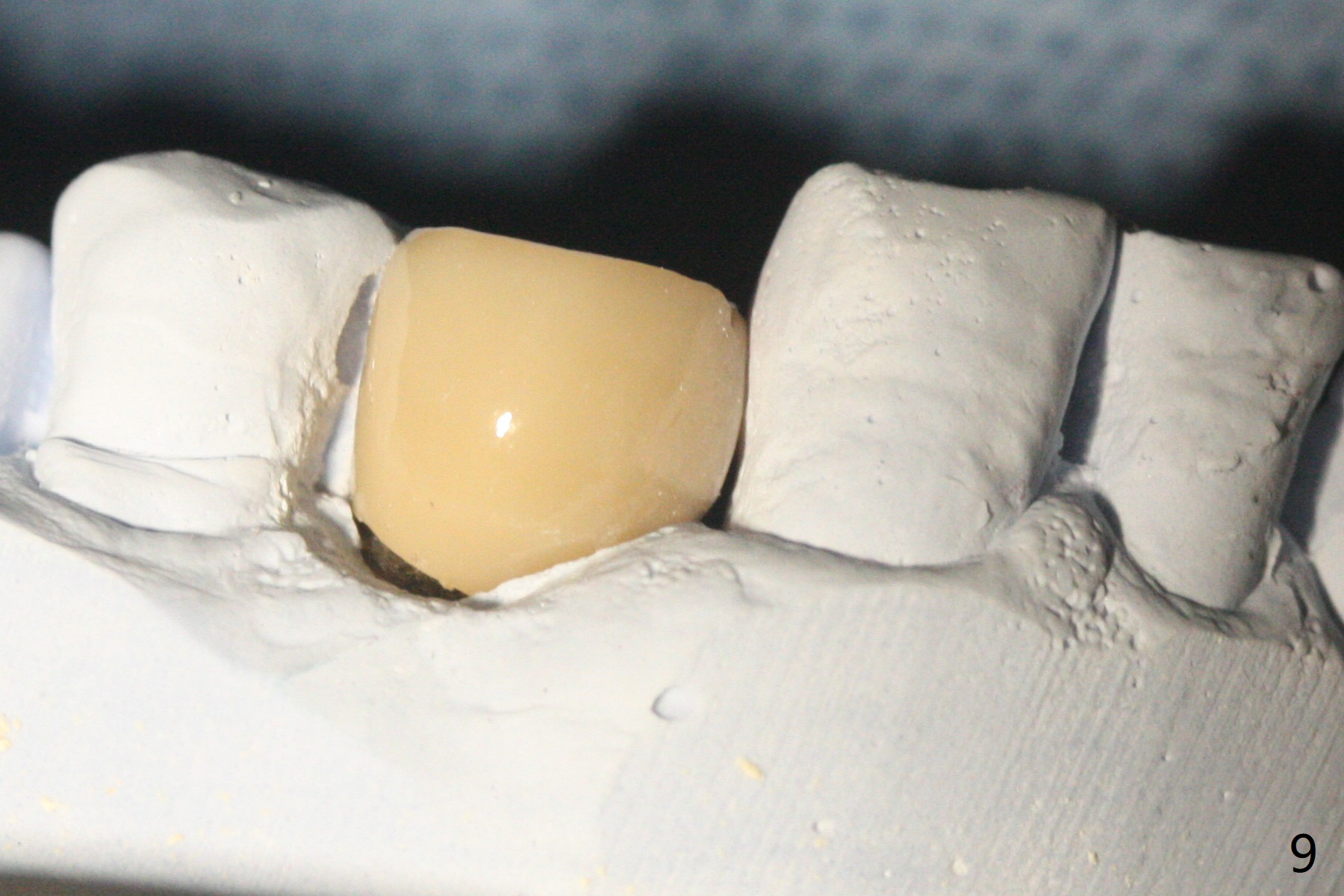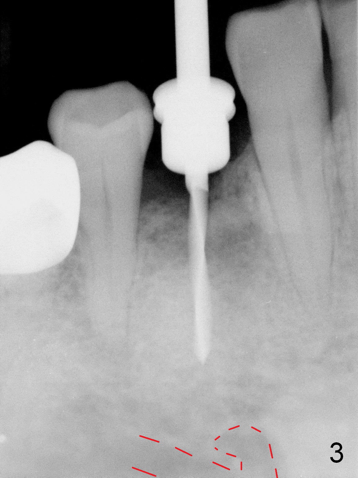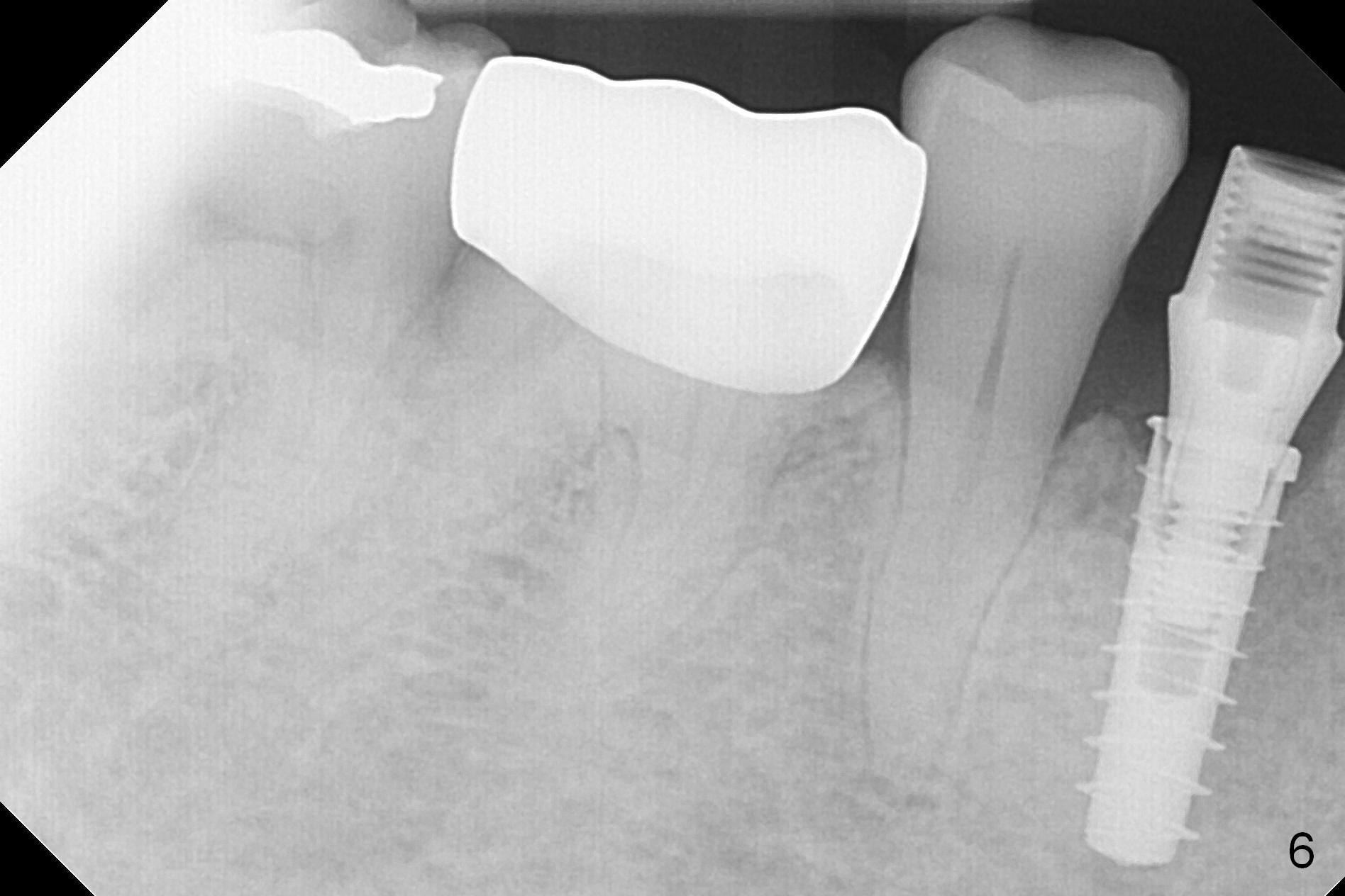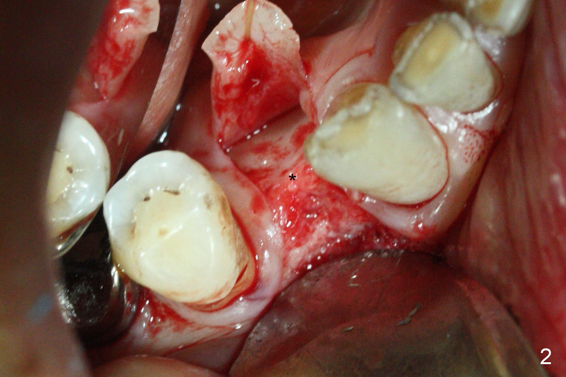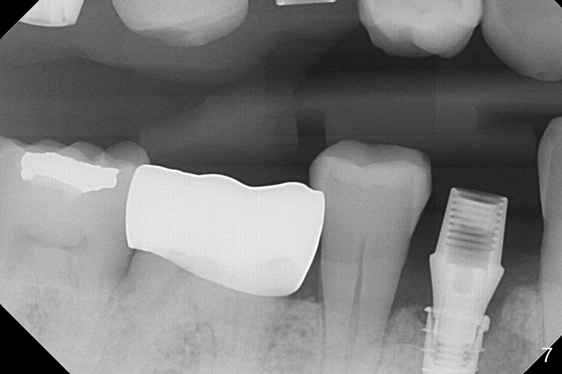 In fact the mesiodistal space of the site of #28 is within normal limit. The buccal plate atrophy is striking (Fig.1) with a fistula (^, associated with underlying residual root tip). When the flaps are raised, the ridge is triangular with the lingual plate (Fig.2 *) higher than the buccal one. Because of the slope, the multiple-drill approach is adopted in stead of single-drill one, because the marking bur is wobbling after 1.6 mm osteotomy at 13 mm (Fig.3). After placement of a 4x11 mm implant, a 4.5x4(2) mm abutment is inserted (Fig.4). The abutment and the implant act as a mesh (framework) so that bone graft and collagen membrane can be laid upon them buccolingually. When the flaps are sutured, there is less tension than that without the abutment. Furthermore, the buccal tissue volume seems to be increased (Fig.5 (<: fistula, which should heal soon), as compared to Fig.1). Tale photos to show effectiveness of the simultaneous GBR and disappearance of the fistula. Three months postop (Fig.6,7 (incomplete abutment seating)), the implant is loaded for intrusion of the opposing supraerupted tooth. The patient returns with chief complaint of food impaction between #27 and 28 three years 7 months post cementation; there is an open contact. Before pick up impression the distal convex surface of #27 is trimmed. The repaired crown has tight proximal contacts before (Fig.9,10) and after (Fig.11) retightening and cementation.