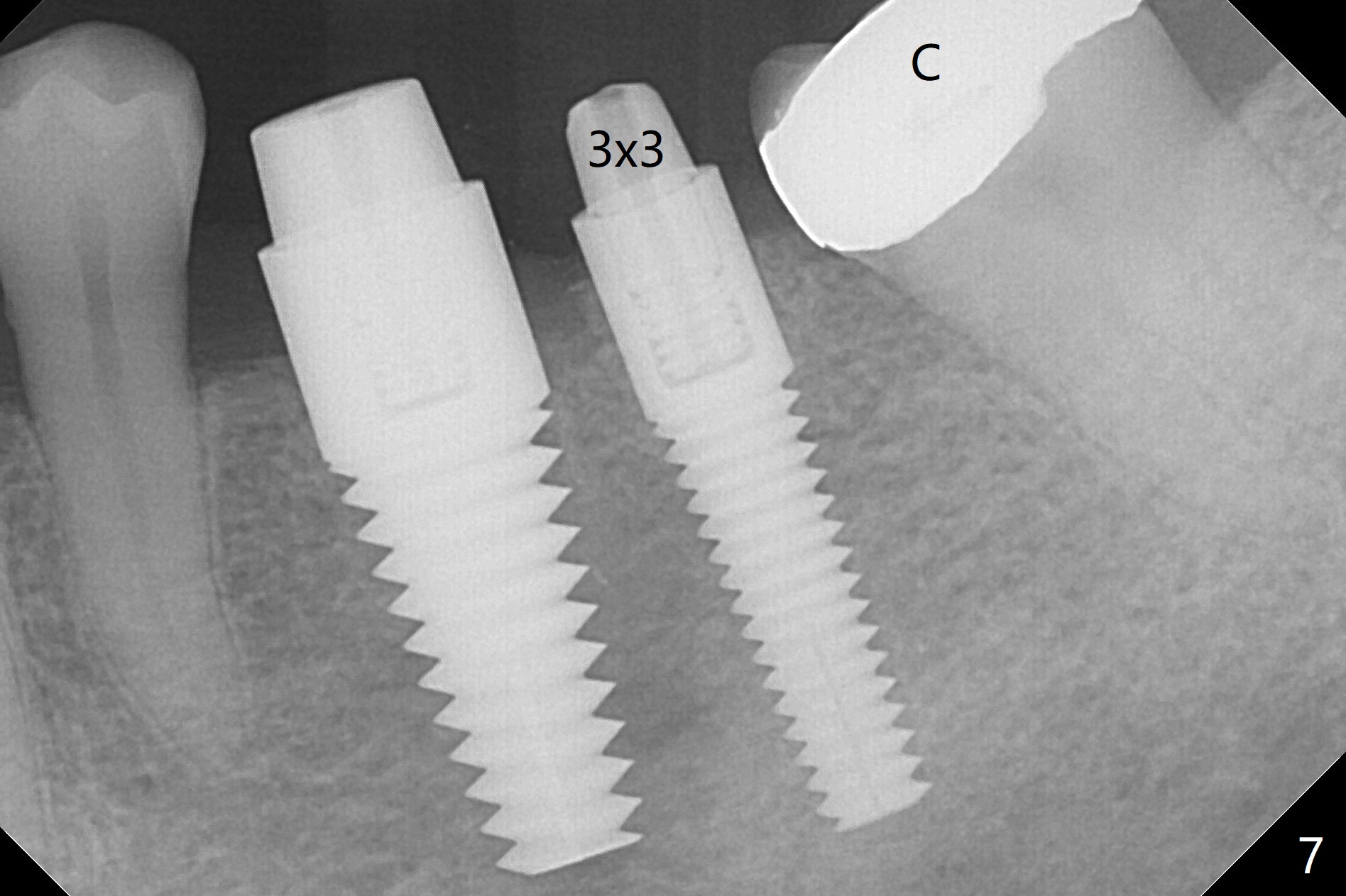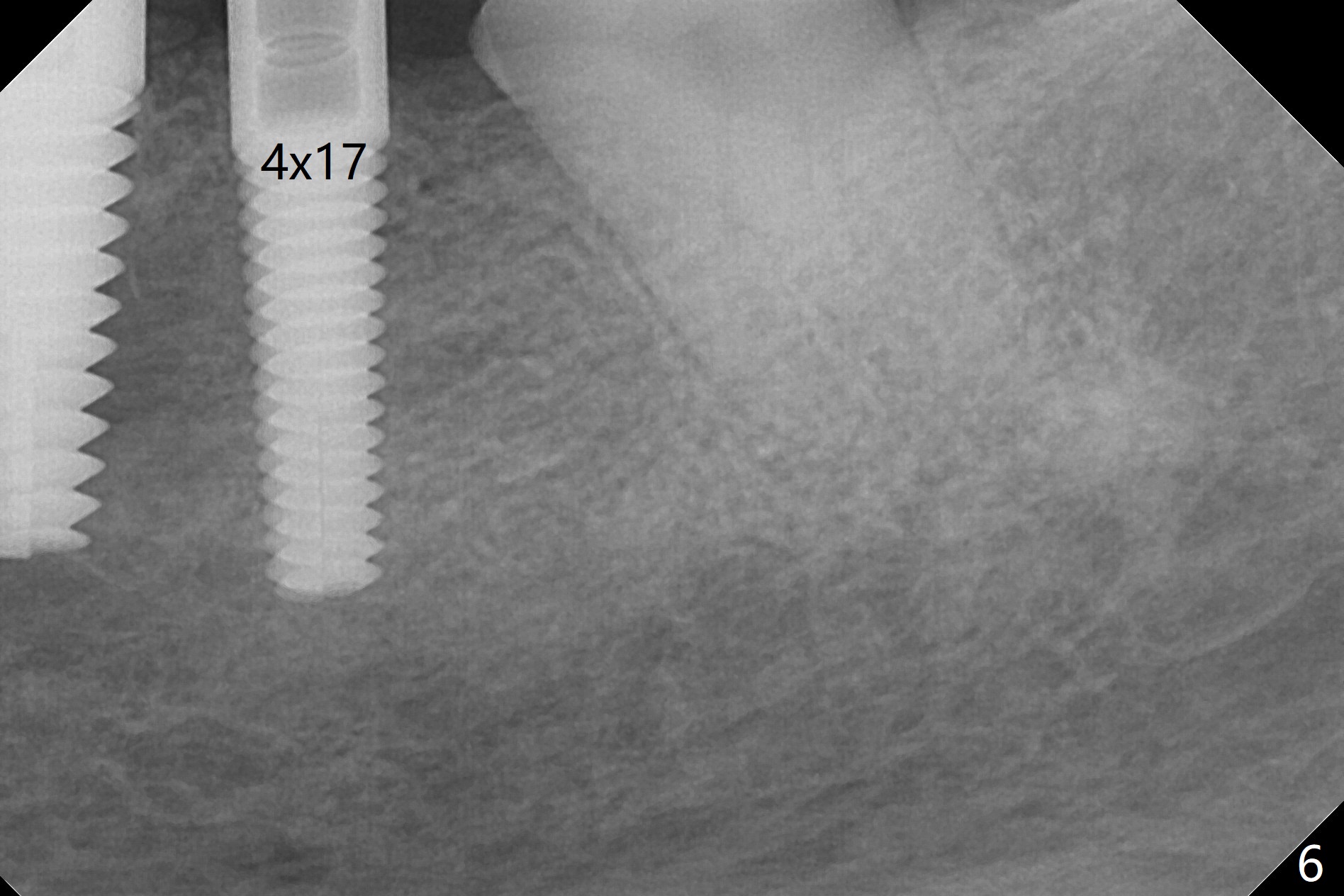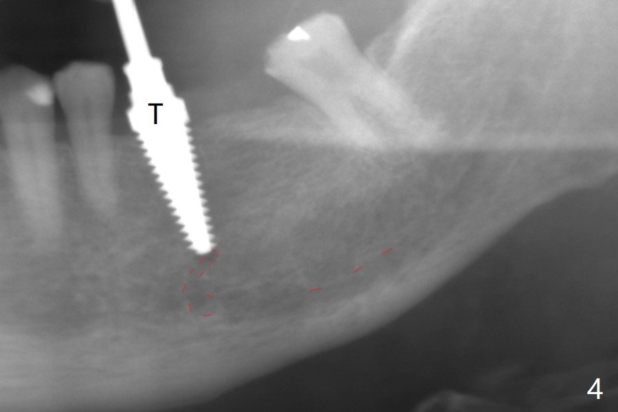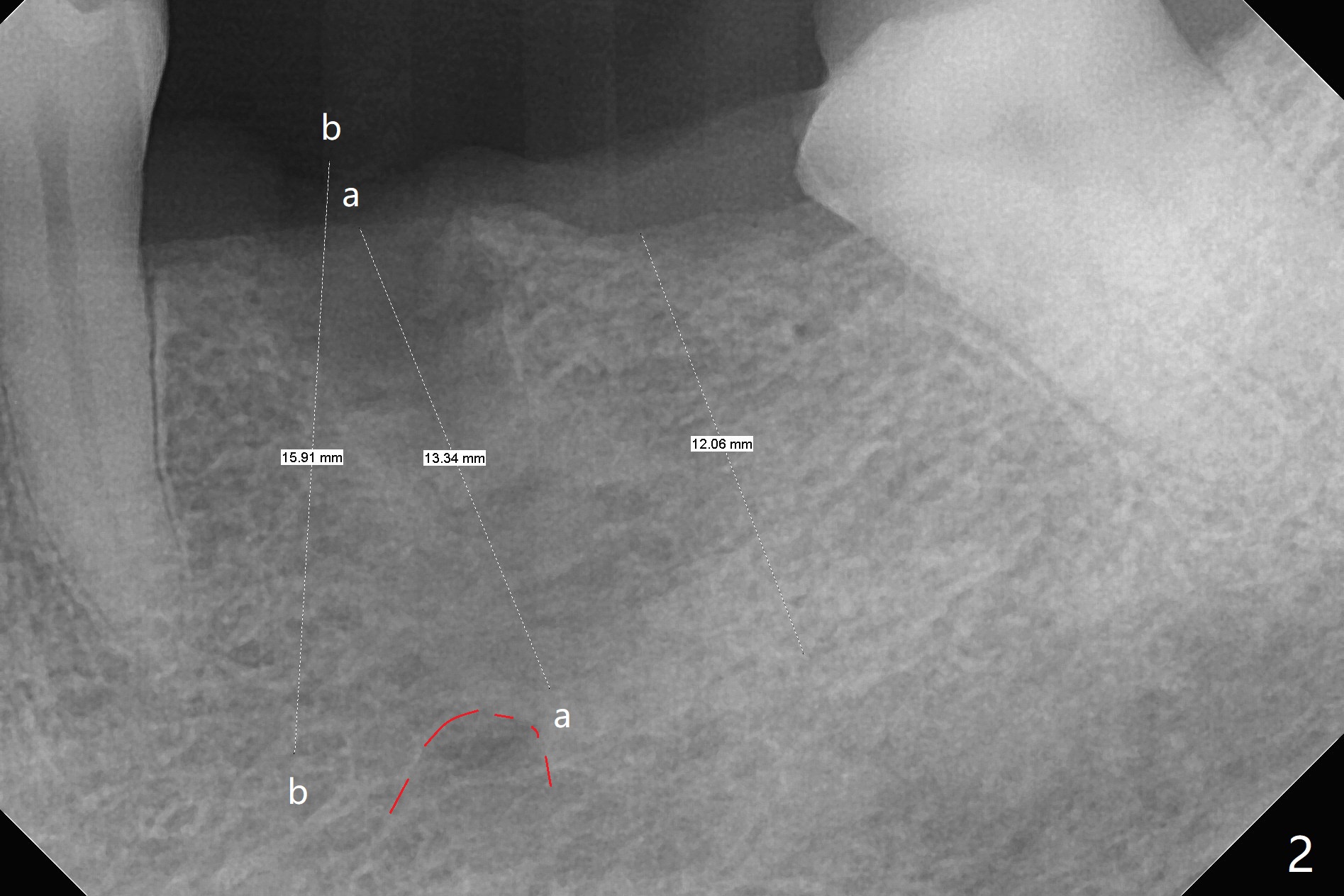 When the tooth #20 is extracted, the buccal and lingual plates are intact, but the apical lesion is deep. A PA is taken (Fig.1). Osteotomy will be established either along the long axis of the original socket (Fig.2 a line) or in the mesial slope (b line). Either osteotomy may damage the Mental Loop (red dashed line). To reduce the complication, osteotomy is being made by inserting 3.8 to 6 mm taps. In fact the 6 mm tap achieves stability (Fig.3,4), but it invades the buccal gap. When the tap is removed, the bottom of the socket is sensitive to probing with oozing from the socket. To reduce further compromise of the buccal space, Lindamann bur is used to remove the bone from the lingual and mesial plate, followed by placing a 6x17 mm implant with >50 Ncm (Fig.5). In fact the implant is placed shallower than the tap. When a 4x17 mm implant is placed at #19, there seems to be clearance from the Inferior Alveolar Canal (Fig.6). Postop there is no paresthesia. The buccal gap is <1 mm, which is filled with Vanilla Graft. After recementing the retainer (crown, C in Fig.7) at #18, periodontal dressing is applied to the sites of #19 and 20. Impression is taken 4 months postop with that of #15.