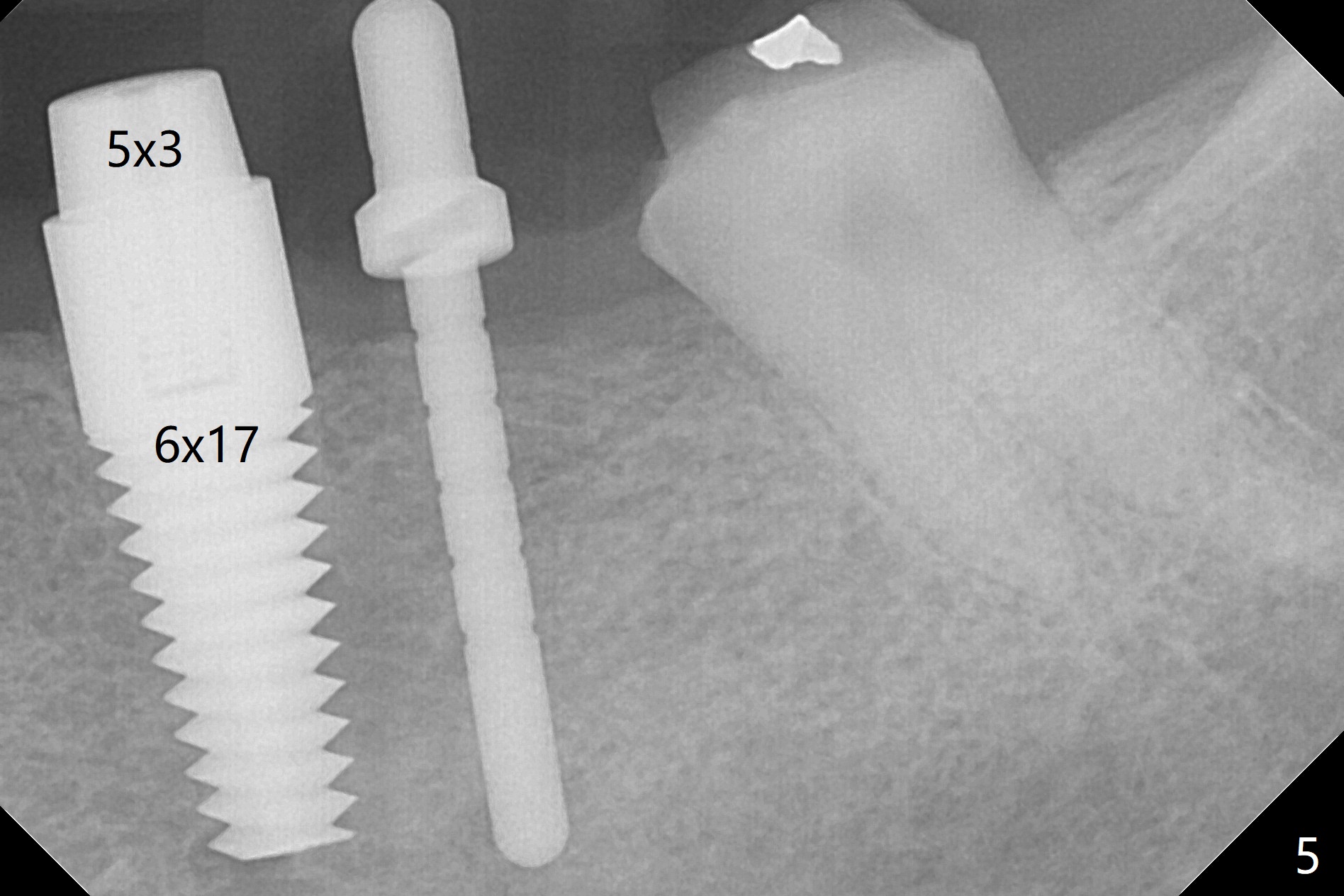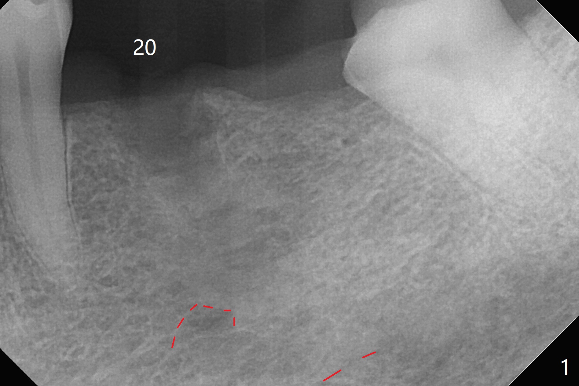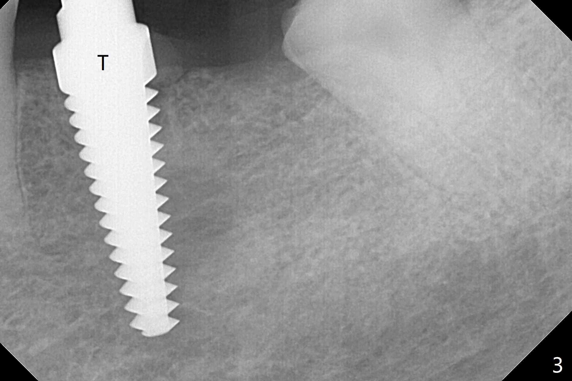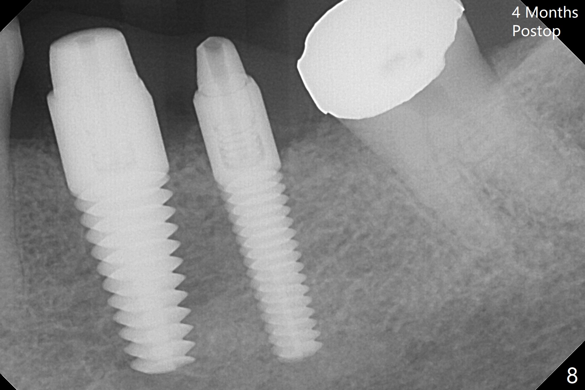 When the tooth #20 is extracted, the buccal and lingual plates are intact, but the apical lesion is deep. A PA is taken (Fig.1). Osteotomy will be established either along the long axis of the original socket (Fig.2 a line) or in the mesial slope (b line). Either osteotomy may damage the Mental Loop (red dashed line). To reduce the complication, osteotomy is being made by inserting 3.8 to 6 mm taps. In fact the 6 mm tap achieves stability (Fig.3,4), but it invades the buccal gap. When the tap is removed, the bottom of the socket is sensitive to probing with oozing from the socket. To reduce further compromise of the buccal space, Lindamann bur is used to remove the bone from the lingual and mesial plate, followed by placing a 6x17 mm implant with >50 Ncm (Fig.5). In fact the implant is placed shallower than the tap. When a 4x17 mm implant is placed at #19, there seems to be clearance from the Inferior Alveolar Canal (Fig.6). Postop there is no paresthesia. The buccal gap is <1 mm, which is filled with Vanilla Graft. After recementing the retainer (crown, C in Fig.7) at #18, periodontal dressing is applied to the sites of #19 and 20. Impression is taken 4 months postop with that of #15.