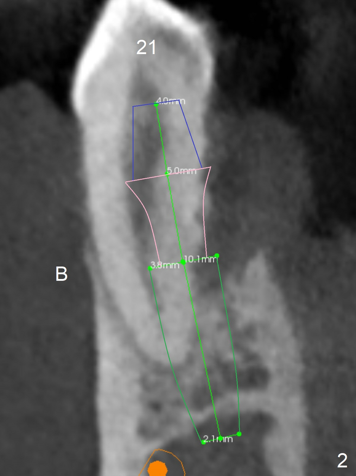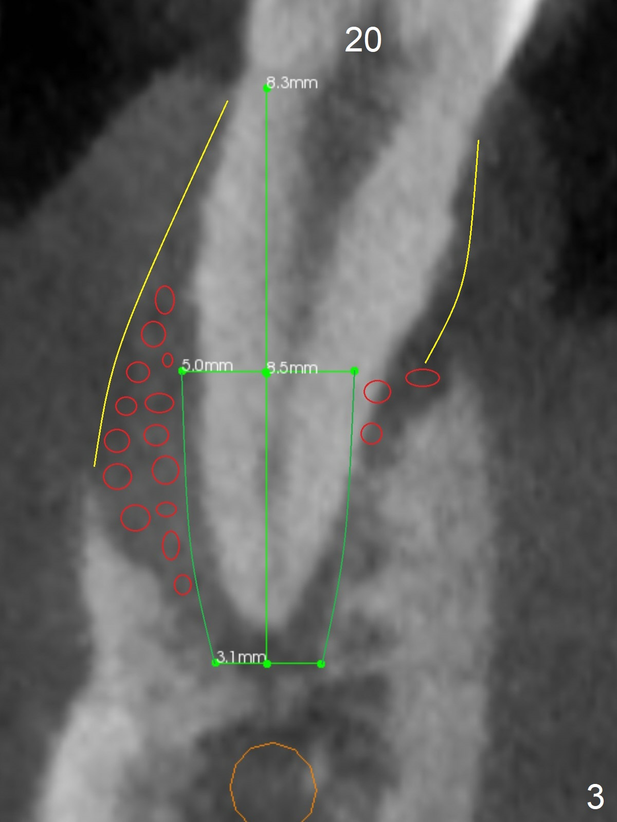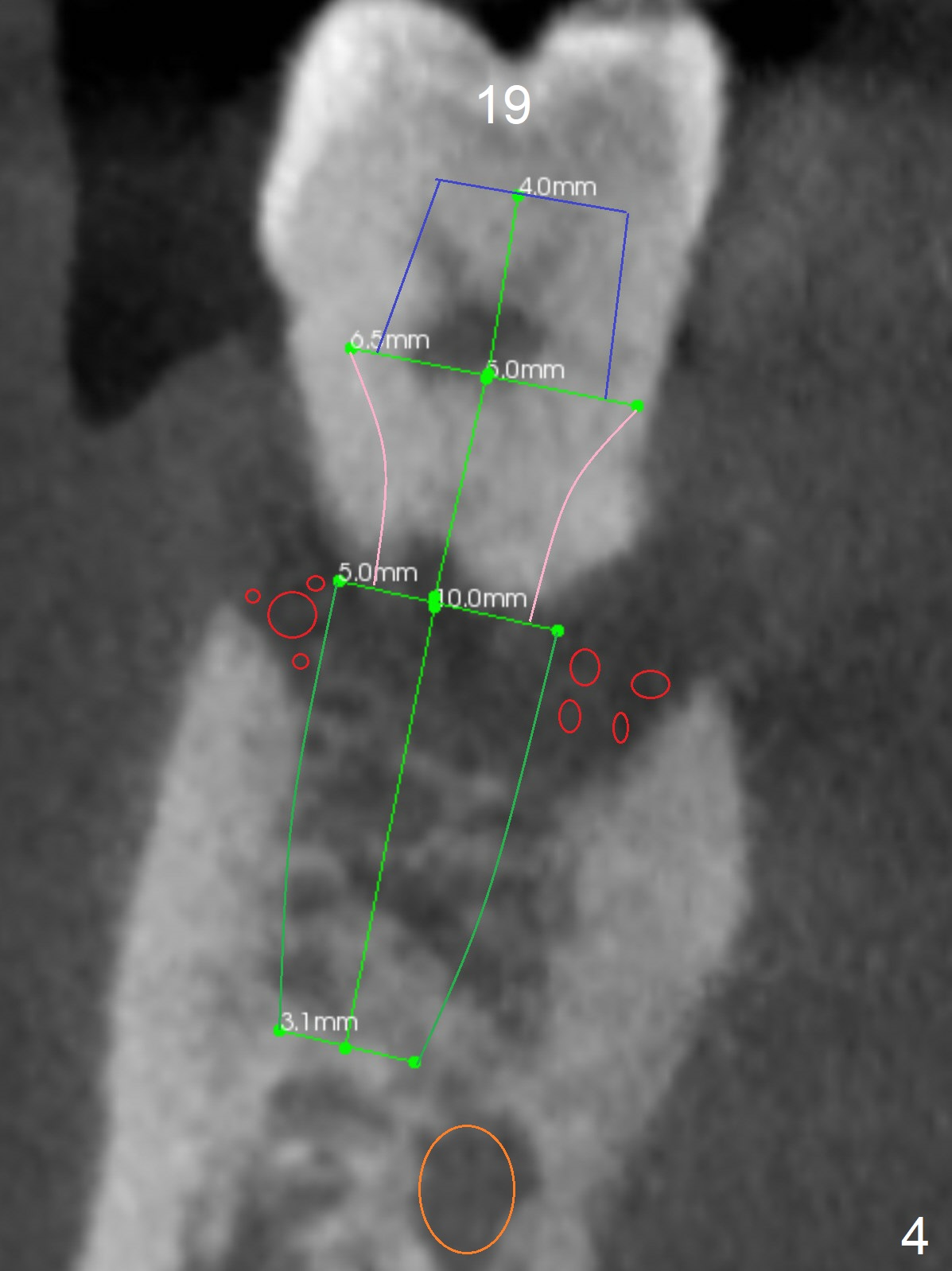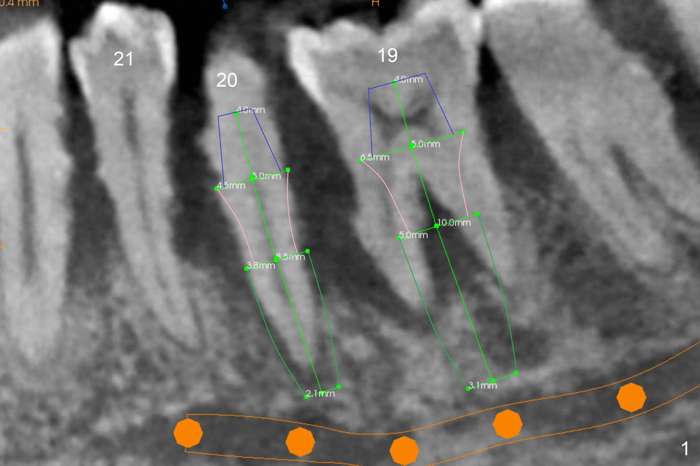 A 36-year-old man develops periodontal abscess at #19 and 20 after scaling & root planing. Since the site of #20 is close to the Mental Nerve, 3.8 mm tap or dummy implant will be used to form osteotomy instead of drills (Fig.1,3). While an implant will be placed in the middle of the socket #20, an implant will be placed as buccal as possible at #19 (Fig.4). If primary stability at #20 is poor, extract the tooth #21 and place a 3.8x10 mm lingually (Fig.2). PRF membrane will be placed prior to bone graft after implant placement (Fig.3 yellow).