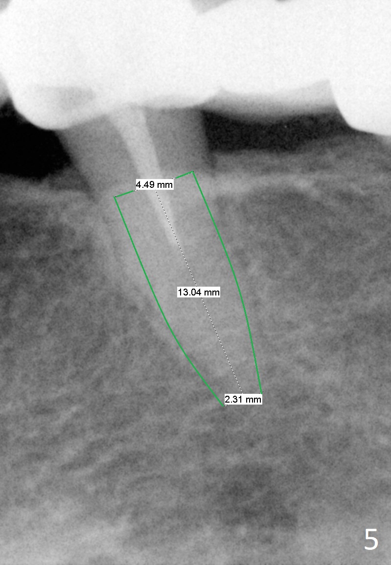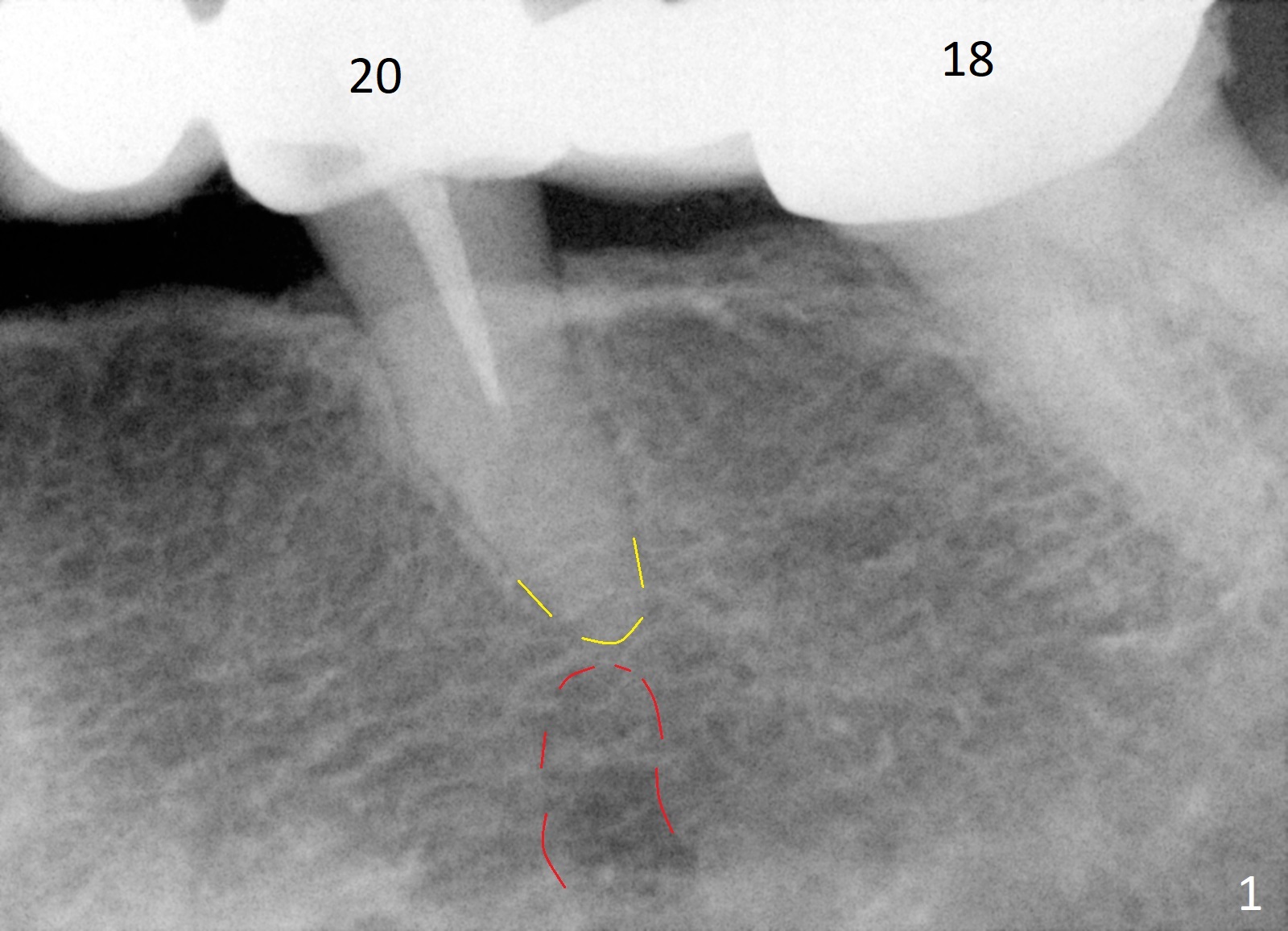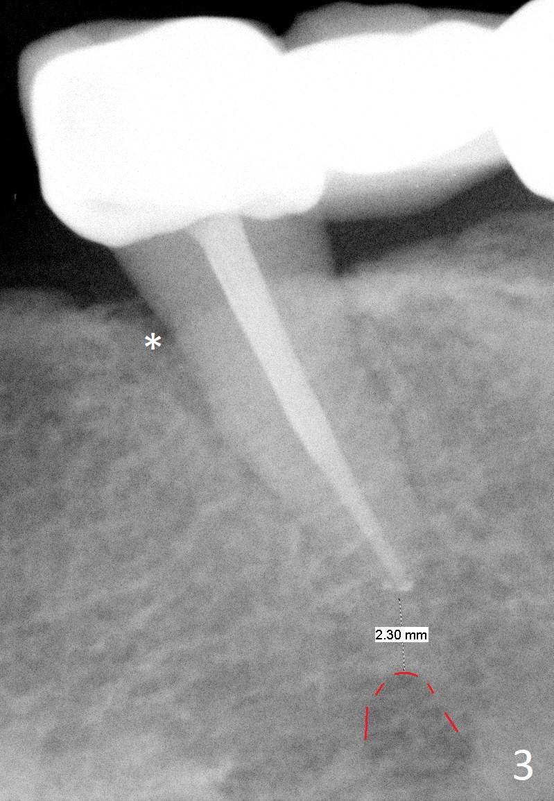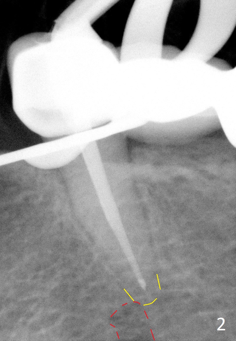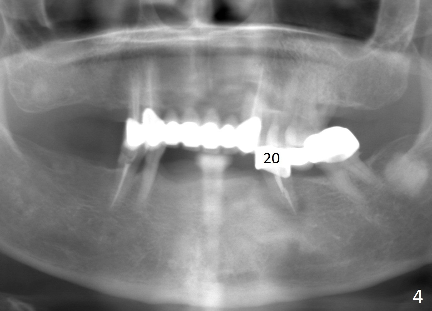 A 65-year-old woman used to have a long bridge (Fig.1). First, the portion mesial to #20 was sectioned. But the remaining portion kept chipping. RCT was retreated for the tooth #20 as the first step to have separate crowns at #18 and 20 and have a lower partial redo. Instead a new FPD was done between #18 and 20 in her own country (Fig.2). Two years later, the tooth #20 became symptomatic with increased pdl mesially (Fig.3*). Periradicular radiolucency increases in another 2 years (Fig.4). The apex of the affected tooth (yellow dashed line) is close to the Mental Loop (red dashed line, Fig.1-3). Although the loop is buccal to the apex of the 2nd premolar, an implant will not extend past the apex to avoid neuropathy (Fig.5). No Inferior Alveolar Nerve block will be administered. PA will be taken after pilot drill. The FPD will be sectioned between #18 and 19. To compensate for the short length of the implant, try to place a large one as long as the buccolingual bone allows. Adapt the lower RPD to the immediate provisional, which should be as small as possible, since the retention must be not too high.