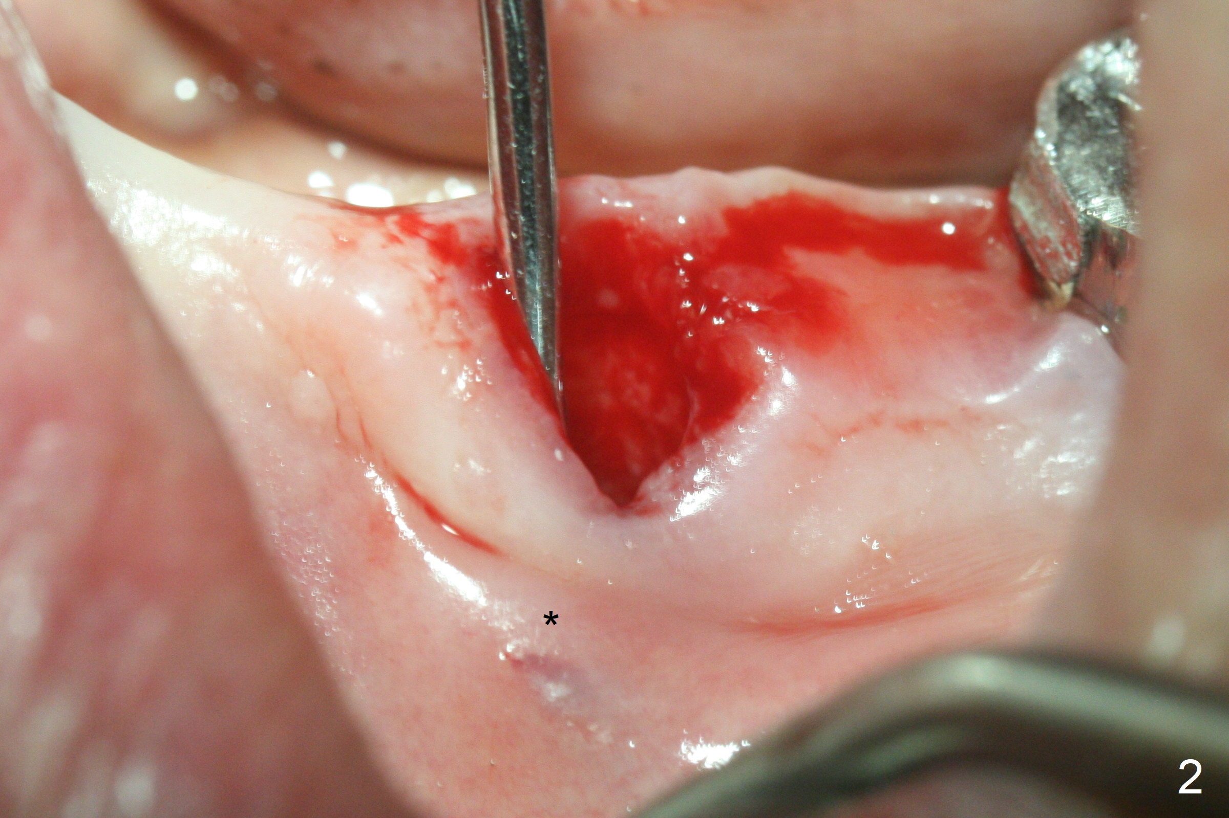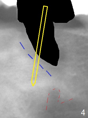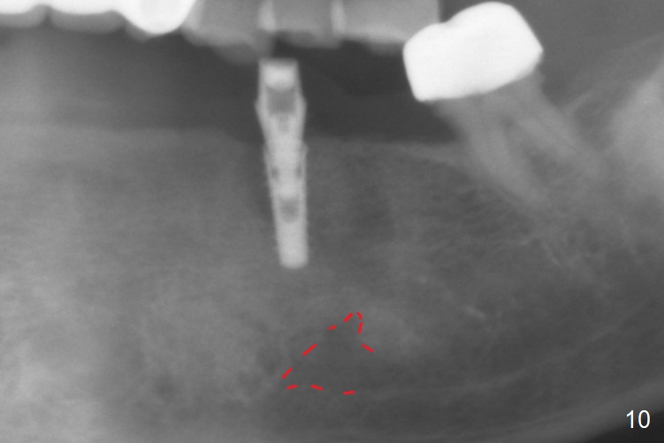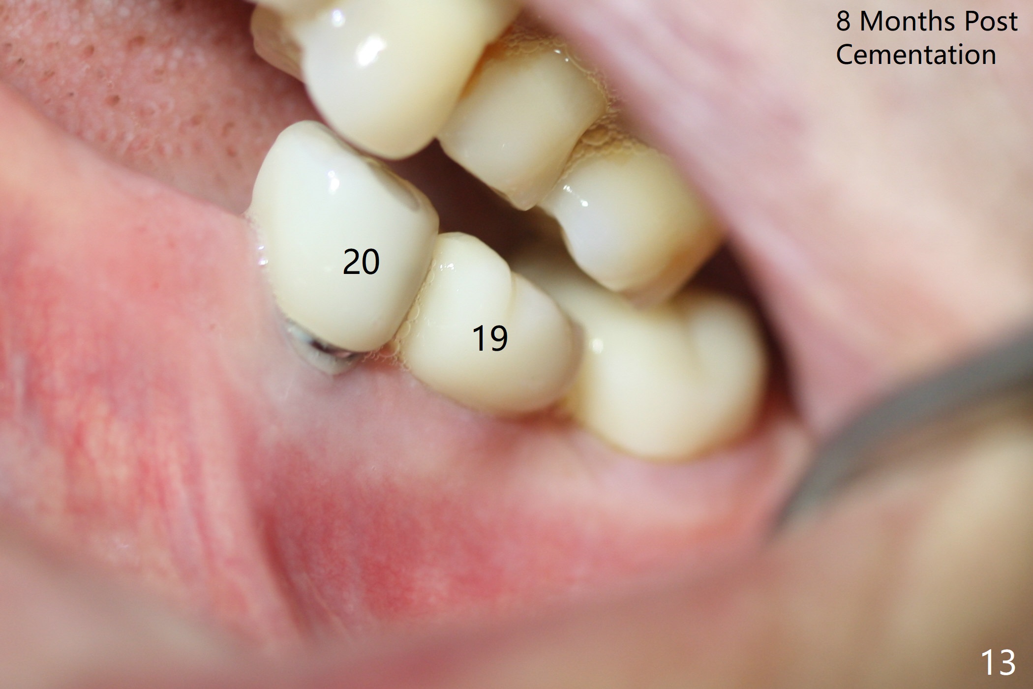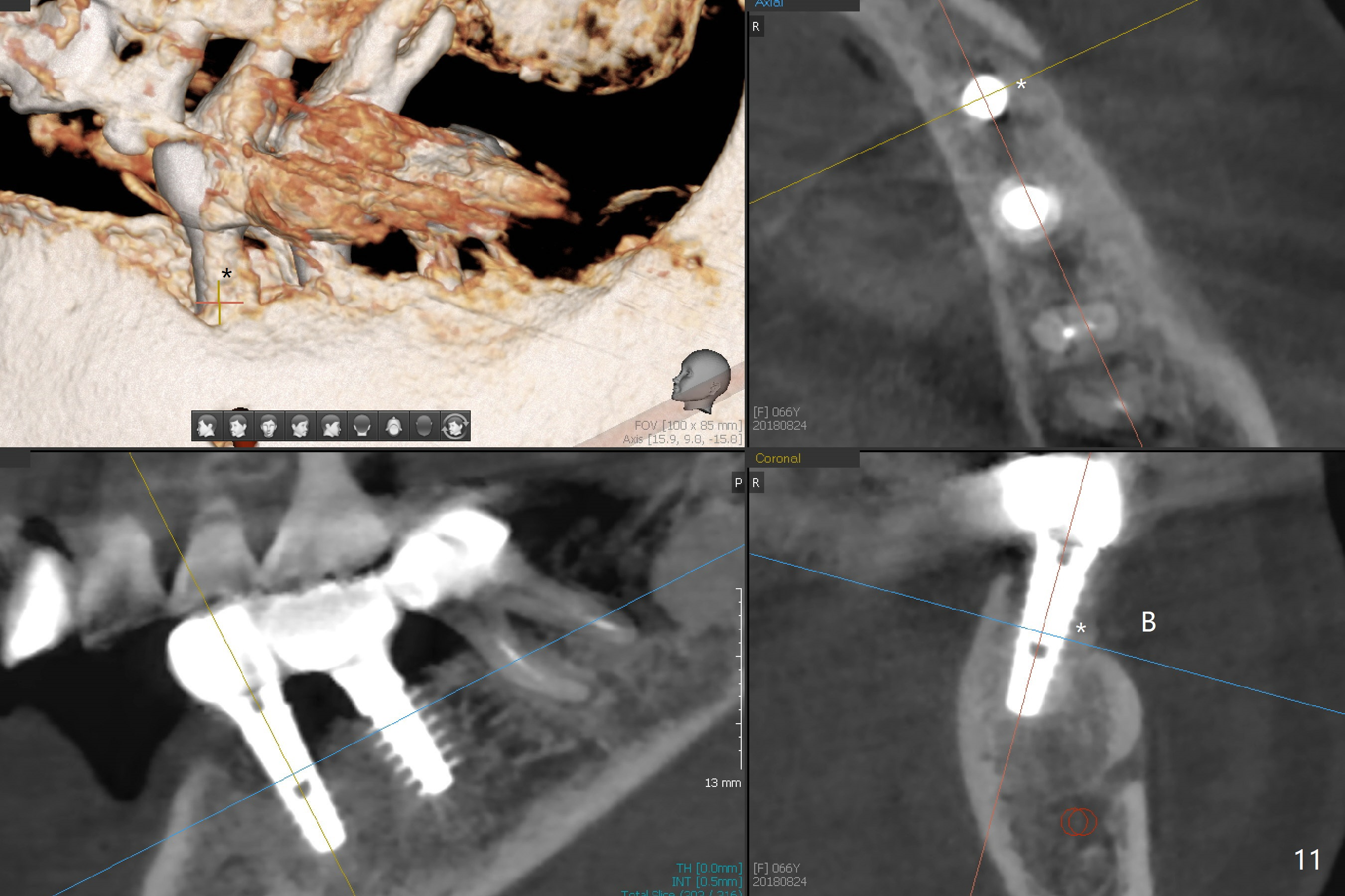 After removal of the pontic at #19 and retainer at #20 (Fig.1) and of vertically fractured root, the buccal plate is found to be defective (Fig.2 *). An implant will be placed as lingual as possible. Since the apex of the affected tooth is coronal to the Mental Loop (Fig.3 red dashed line), an osteotomy (Fig.4 yellow arrow) to be established in the mesial slope (blue dashed line) after extraction (black area) appears to be safer than that along the long axis of the tooth. The initial osteotomy is accomplished by free hand (Fig.5), but when the lower RPD is inserted, the superior end of the 1.5 mm pilot drill is distal (Fig.6). When the trajectory is corrected using the RPD as a surgical guide at the same depth (17 mm gingival level), brisk hemorrhage is from the osteotomy without severe pain. After hemostasis is achieved by packing the socket with Osteogen plug and bone graft and packing bone graft into the osteotomy, 3.3 mm Magic Drill is used for 14 mm. A 4x11 mm IBS implant is placed with 60 Ncm (Fig.7). The implant is then placed deeper, followed by placement of a 4.5x4(3) mm abutment and further bone graft (Fig.8). Finally the implant/abutment complex is apparently in an acceptable mesiodistal position with a large buccal gap which has been filled by bone graft (Fig.9 *). In fact the Mental Loop seems to have been not violated in the procedure (Fig.10). X-ray is taken 3 and 6 months postop. Bone graft (Fig.11,12 (CBCT) *) appears to remain over the buccal (B) surface of the implant coronally 13 months postop (7 months post cementation). The gingiva at #19 and 20 is apparently healthy 8 months post cementation except mild recession at #20 (Fig.13).