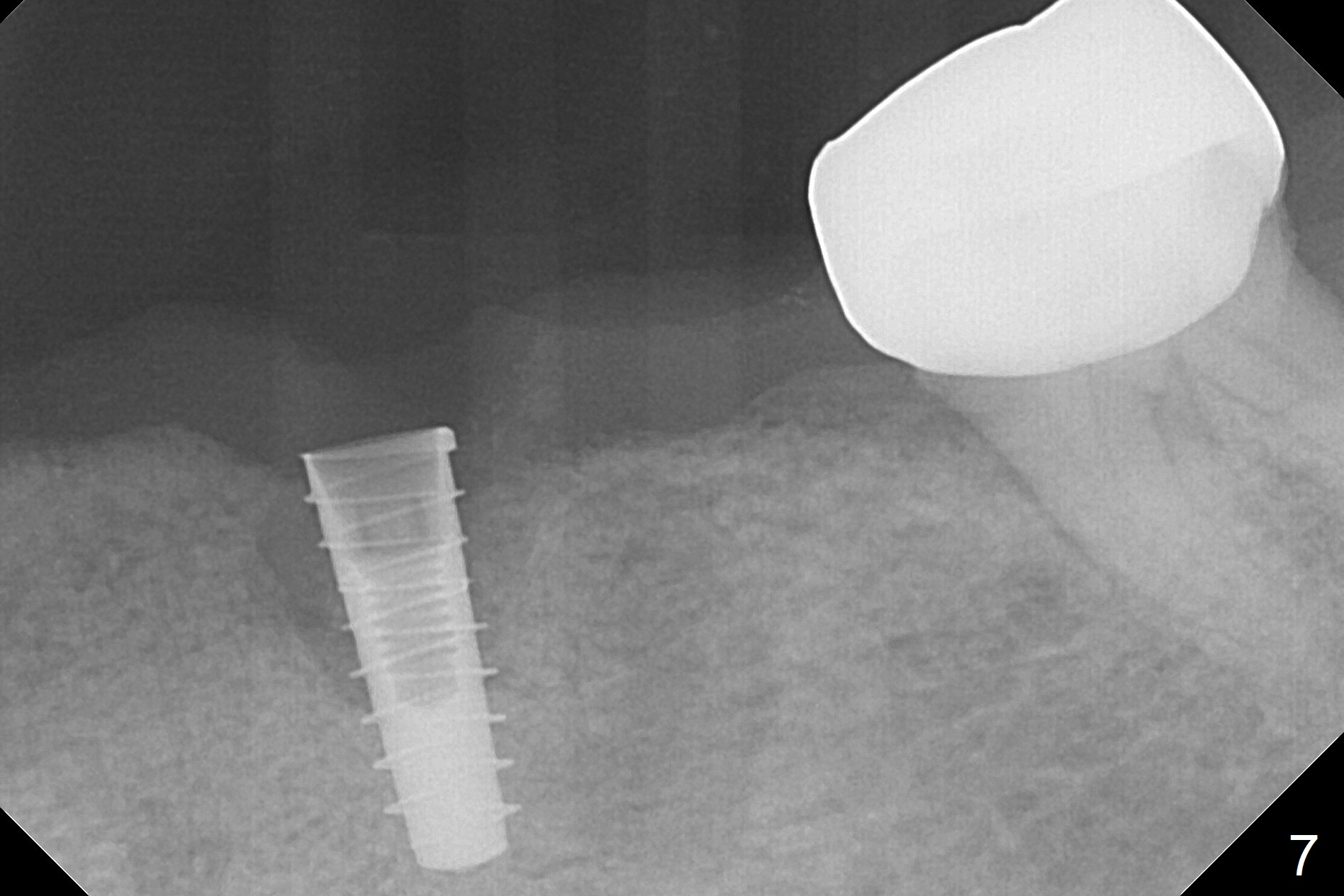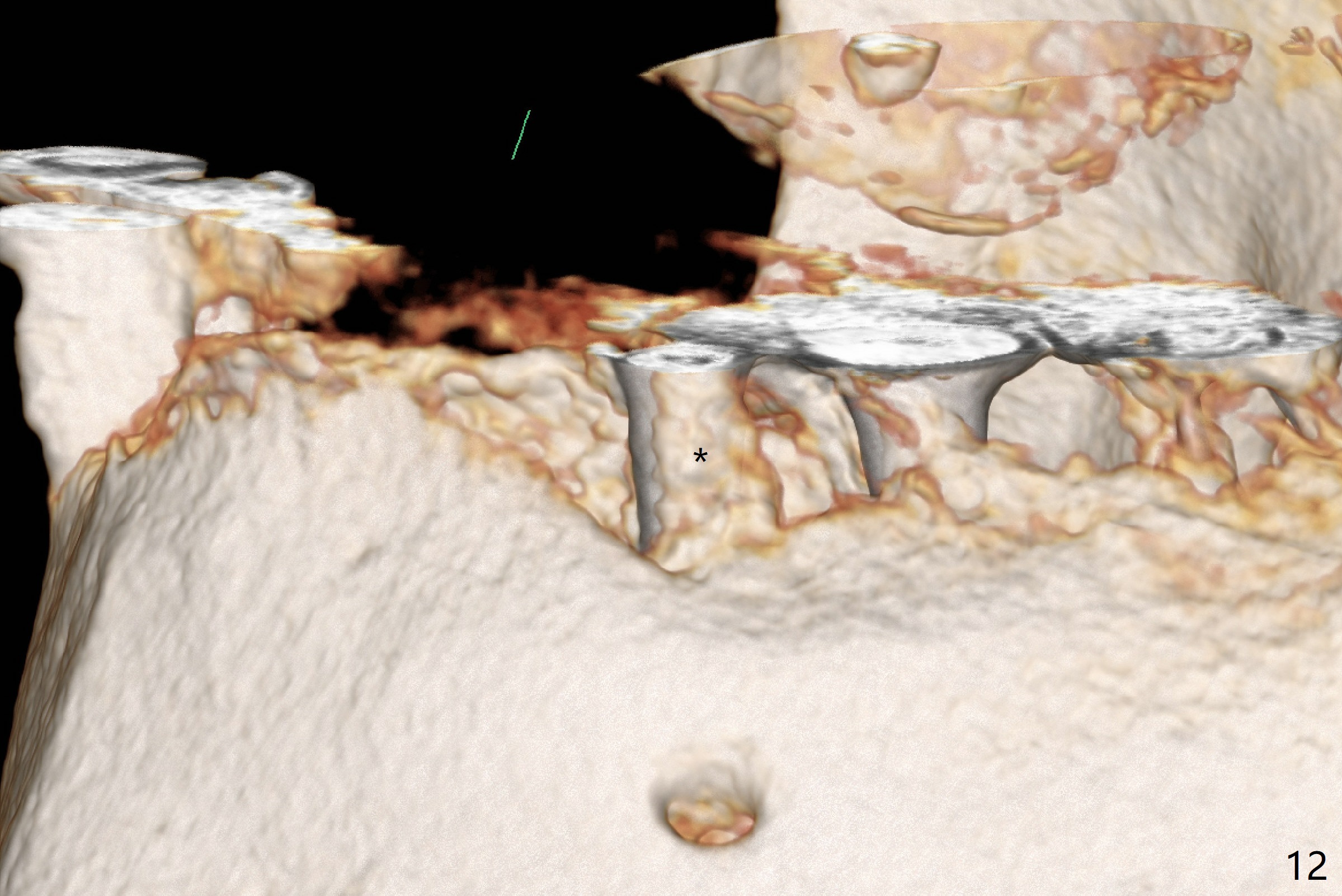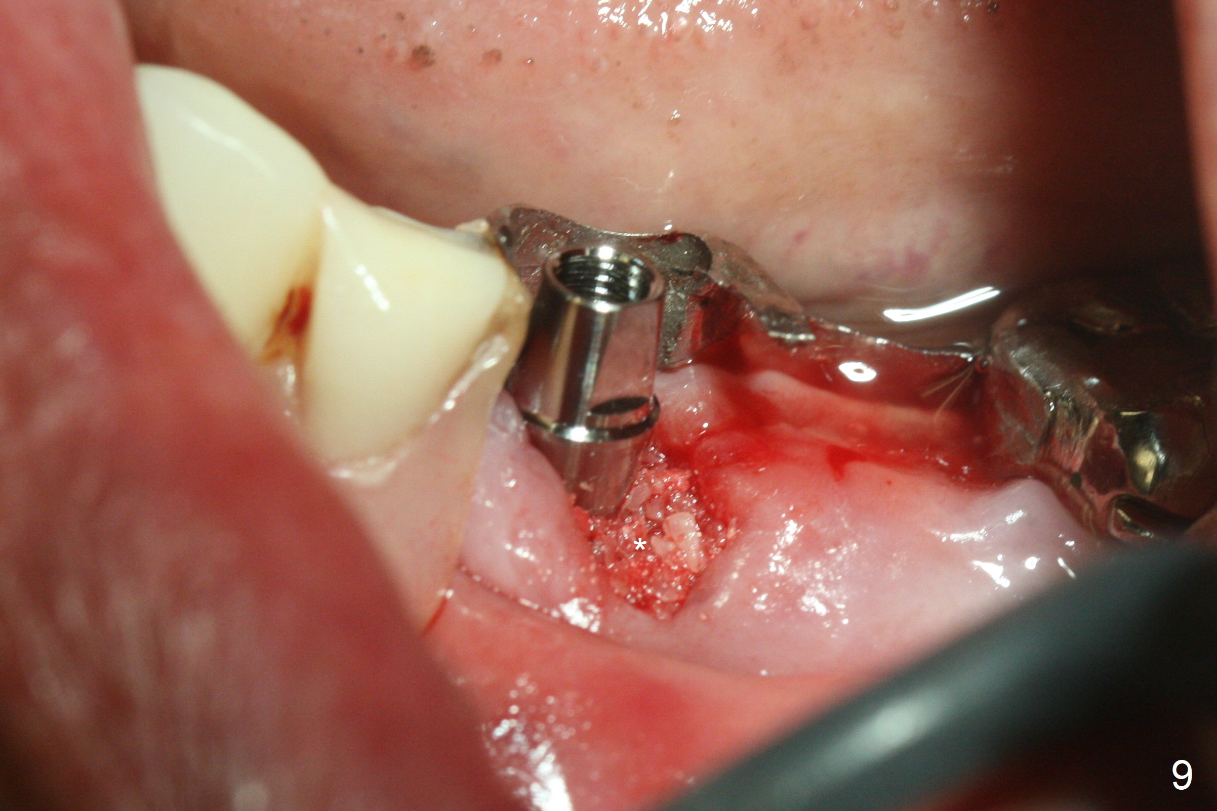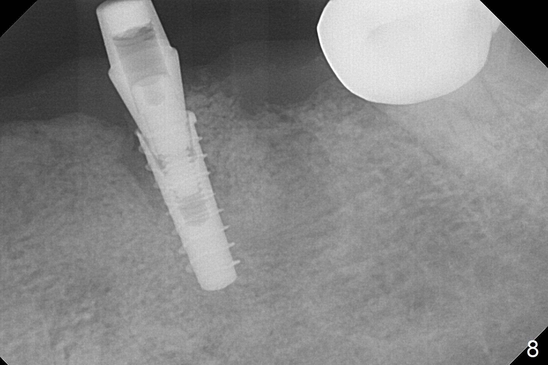 After removal of the pontic at #19 and retainer at #20 (Fig.1) and of vertically fractured root, the buccal plate is found to be defective (Fig.2 *). An implant will be placed as lingual as possible. Since the apex of the affected tooth is coronal to the Mental Loop (Fig.3 red dashed line), an osteotomy (Fig.4 yellow arrow) to be established in the mesial slope (blue dashed line) after extraction (black area) appears to be safer than that along the long axis of the tooth. The initial osteotomy is accomplished by free hand (Fig.5), but when the lower RPD is inserted, the superior end of the 1.5 mm pilot drill is distal (Fig.6). When the trajectory is corrected using the RPD as a surgical guide at the same depth (17 mm gingival level), brisk hemorrhage is from the osteotomy without severe pain. After hemostasis is achieved by packing the socket with Osteogen plug and bone graft and packing bone graft into the osteotomy, 3.3 mm Magic Drill is used for 14 mm. A 4x11 mm IBS implant is placed with 60 Ncm (Fig.7). The implant is then placed deeper, followed by placement of a 4.5x4(3) mm abutment and further bone graft (Fig.8). Finally the implant/abutment complex is apparently in an acceptable mesiodistal position with a large buccal gap which has been filled by bone graft (Fig.9 *). In fact the Mental Loop seems to have been not violated in the procedure (Fig.10). X-ray is taken 3 and 6 months postop. Bone graft (Fig.11,12 (CBCT) *) appears to remain over the buccal (B) surface of the implant coronally 13 months postop (7 months post cementation). The gingiva at #19 and 20 is apparently healthy 8 months post cementation except mild recession at #20 (Fig.13).