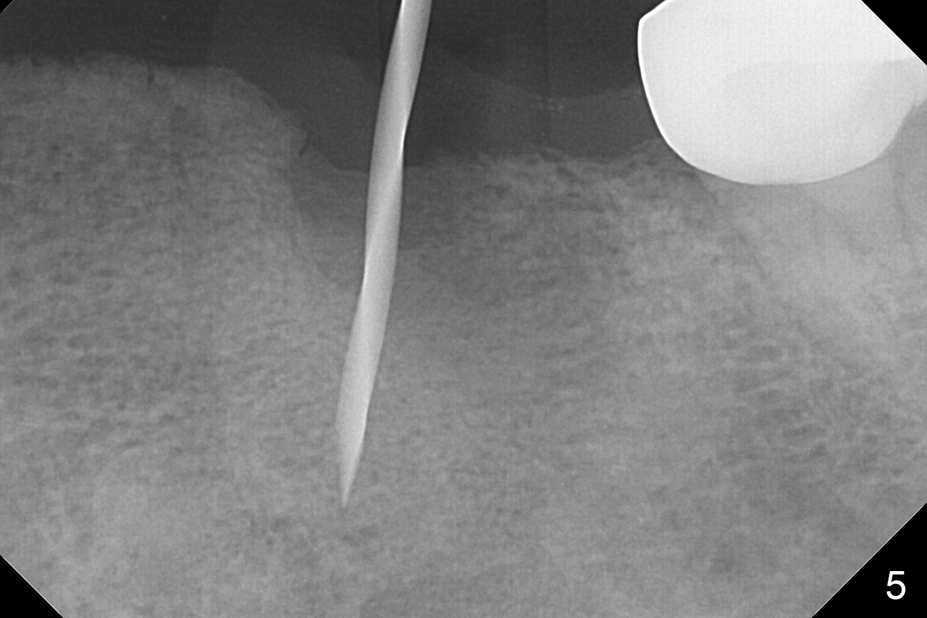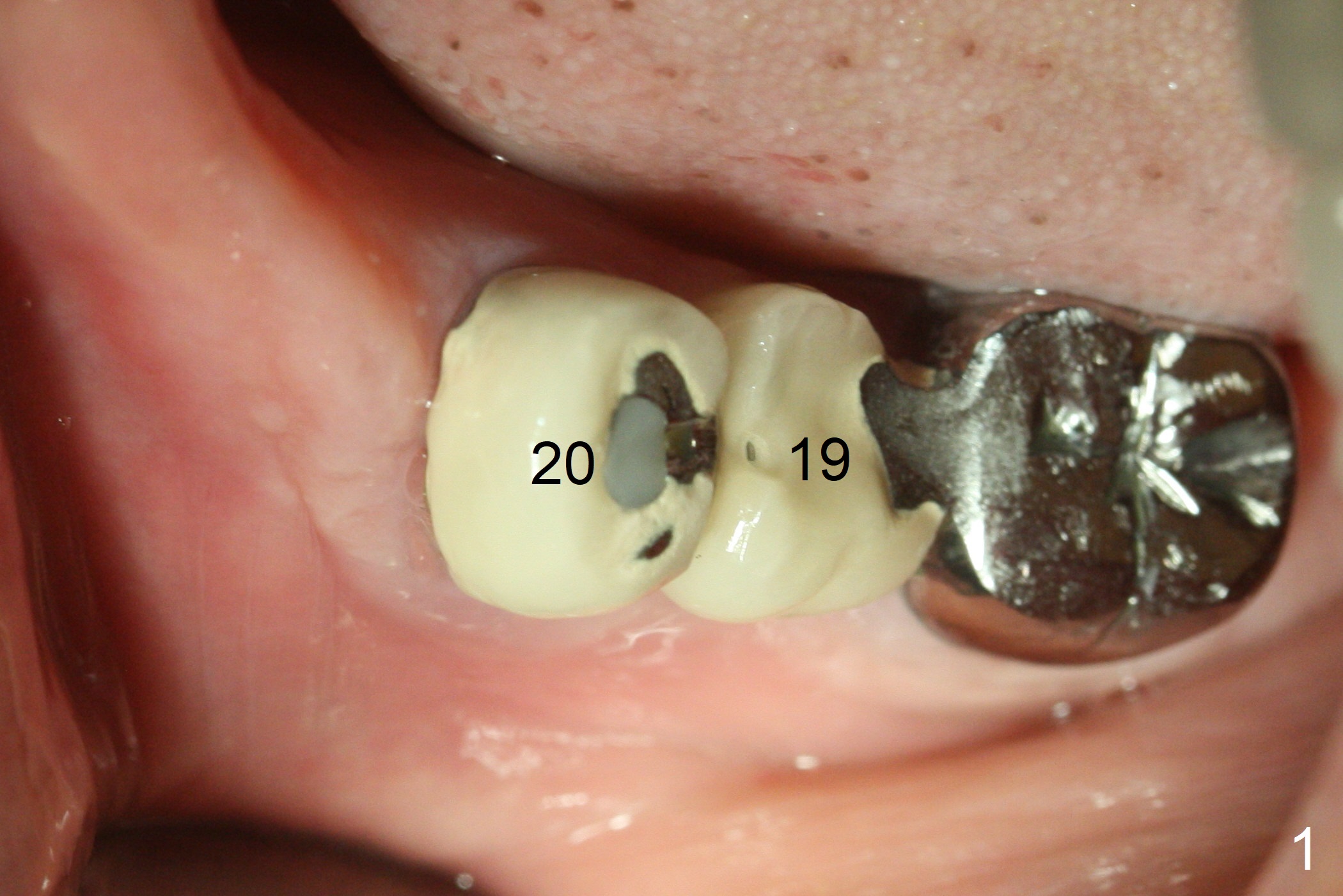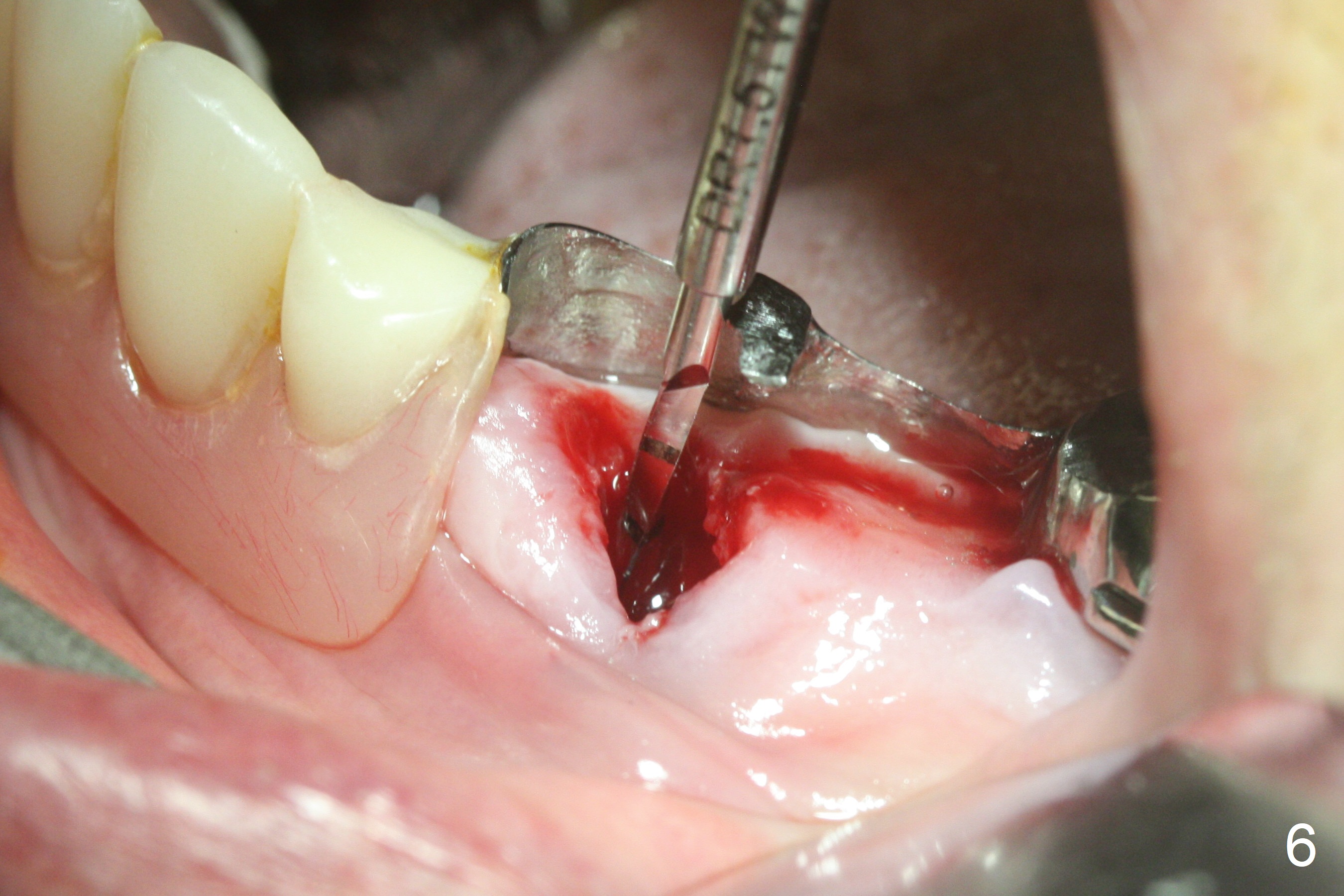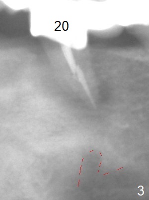 After removal of the pontic at #19 and retainer at #20 (Fig.1) and of vertically fractured root, the buccal plate is found to be defective (Fig.2 *). An implant will be placed as lingual as possible. Since the apex of the affected tooth is coronal to the Mental Loop (Fig.3 red dashed line), an osteotomy (Fig.4 yellow arrow) to be established in the mesial slope (blue dashed line) after extraction (black area) appears to be safer than that along the long axis of the tooth. The initial osteotomy is accomplished by free hand (Fig.5), but when the lower RPD is inserted, the superior end of the 1.5 mm pilot drill is distal (Fig.6). When the trajectory is corrected using the RPD as a surgical guide at the same depth (17 mm gingival level), brisk hemorrhage is from the osteotomy without severe pain. After hemostasis is achieved by packing the socket with Osteogen plug and bone graft and packing bone graft into the osteotomy, 3.3 mm Magic Drill is used for 14 mm. A 4x11 mm IBS implant is placed with 60 Ncm (Fig.7). The implant is then placed deeper, followed by placement of a 4.5x4(3) mm abutment and further bone graft (Fig.8). Finally the implant/abutment complex is apparently in an acceptable mesiodistal position with a large buccal gap which has been filled by bone graft (Fig.9 *). In fact the Mental Loop seems to have been not violated in the procedure (Fig.10). X-ray is taken 3 and 6 months postop. Bone graft (Fig.11,12 (CBCT) *) appears to remain over the buccal (B) surface of the implant coronally 13 months postop (7 months post cementation). The gingiva at #19 and 20 is apparently healthy 8 months post cementation except mild recession at #20 (Fig.13).
