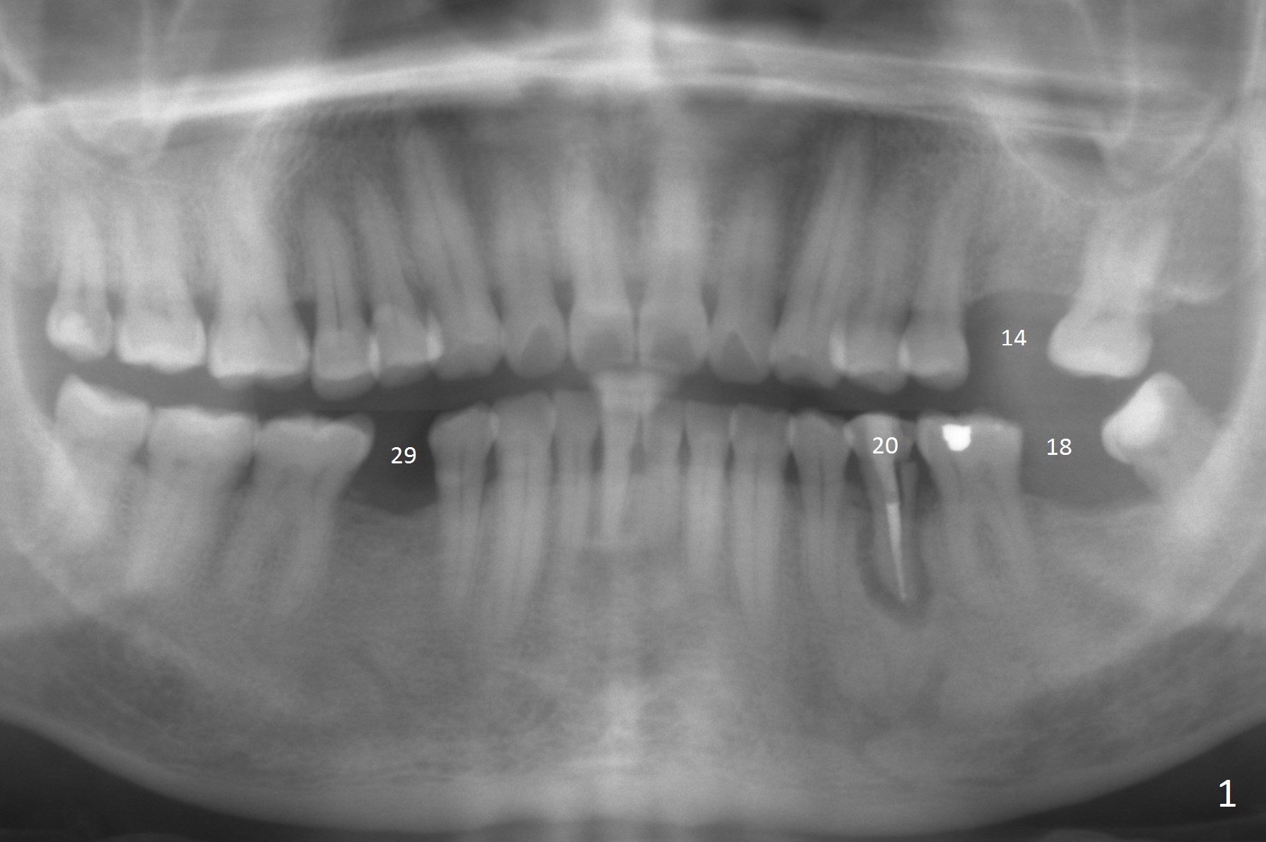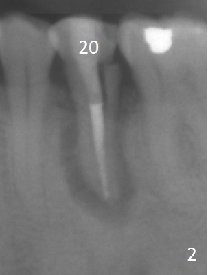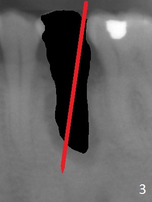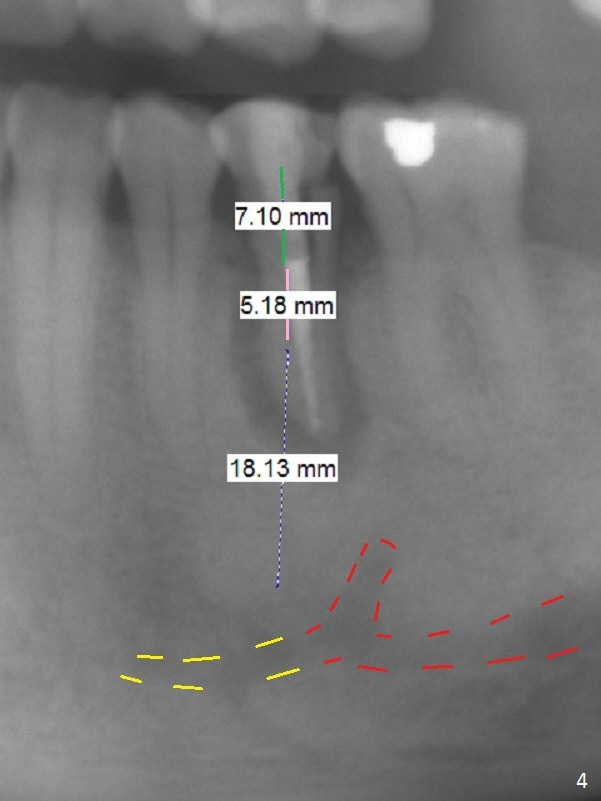 A 53-year-old man (probably bruxer, long roots) has 3 missing teeth (Fig.1 #14,18,29) and 1 fractured tooth (Fig.2 #20). The fractue is associated with deep buccal pockets. The buccal plate is most likely defective. After extraction (Metronidazole), start osteotomy lingual and mesial (Fig.3 red long arrow) to reduce damage to the Mental Loop (Fig.4 red dashed line). Damage to the Incisive Canal (yellow dashed line, the continuum of the Inferior Alveolar Canal after giving off the Mental Loop) is less significant. Since the defect is long, use the longest implant and place it deep. A long abutment (7 mm, green) with 5 mm cuff (pink) is required. To have sufficient buccal gap for bone graft and probably membrane, the smallest two-piece implant is necessary (3.8 mm).