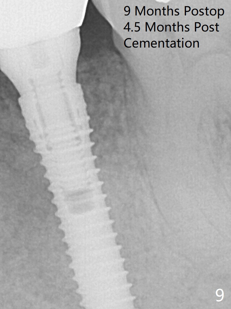 It appears that a 3.8x18 mm implant is not placed deep enough. Following 3-4 more turns of the implant and placement of a 5.5x4(3) mm abutment (Fig.5 A), allograft is placed (*). The bone around the implant appears to have regenerated 4 months postop (Fig.7). Bone density appears to continue increasing 9 months postop (i.e., 4.5 months post cementation, Fig.9).