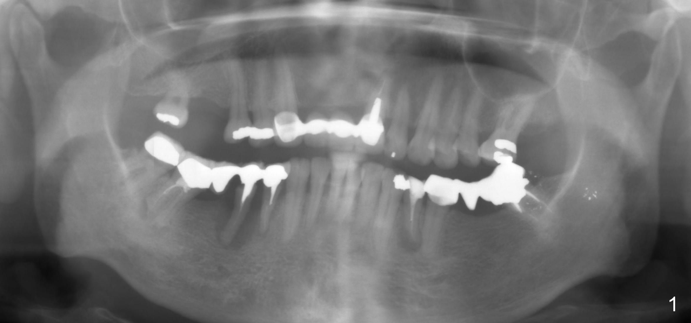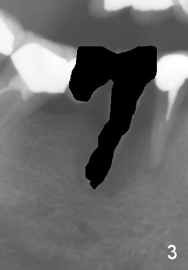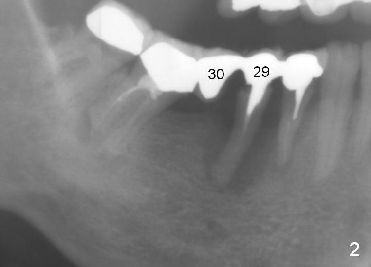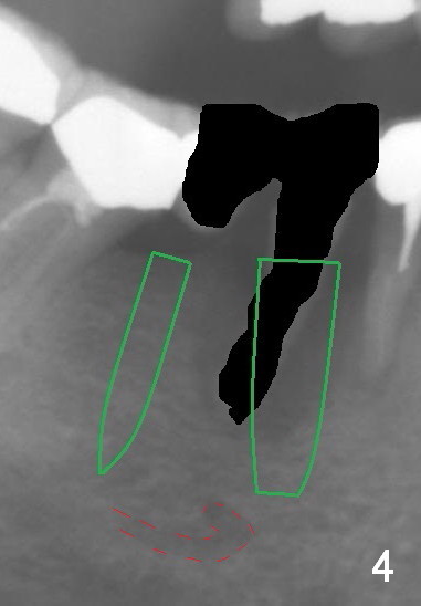 A 50-year-old lady (ZC) has poor dentition (Fig.1). The buccal gingiva of the tooth #29 is erythematous and edematous with deep pockets and severe bone resorption (Fig.2). Two units of the 5-unit bridge is going to be removed (Fig.3). A large implant is to be placed at the site of #29 (socket treated with Metronidazole), while a small one (probably 1-piece) at #30 (narrow mesiodistal space, Fig.4 green outlines). Be care of the mental loop (red dashed line). In fact, the patient wants to have #3 implant placed first.