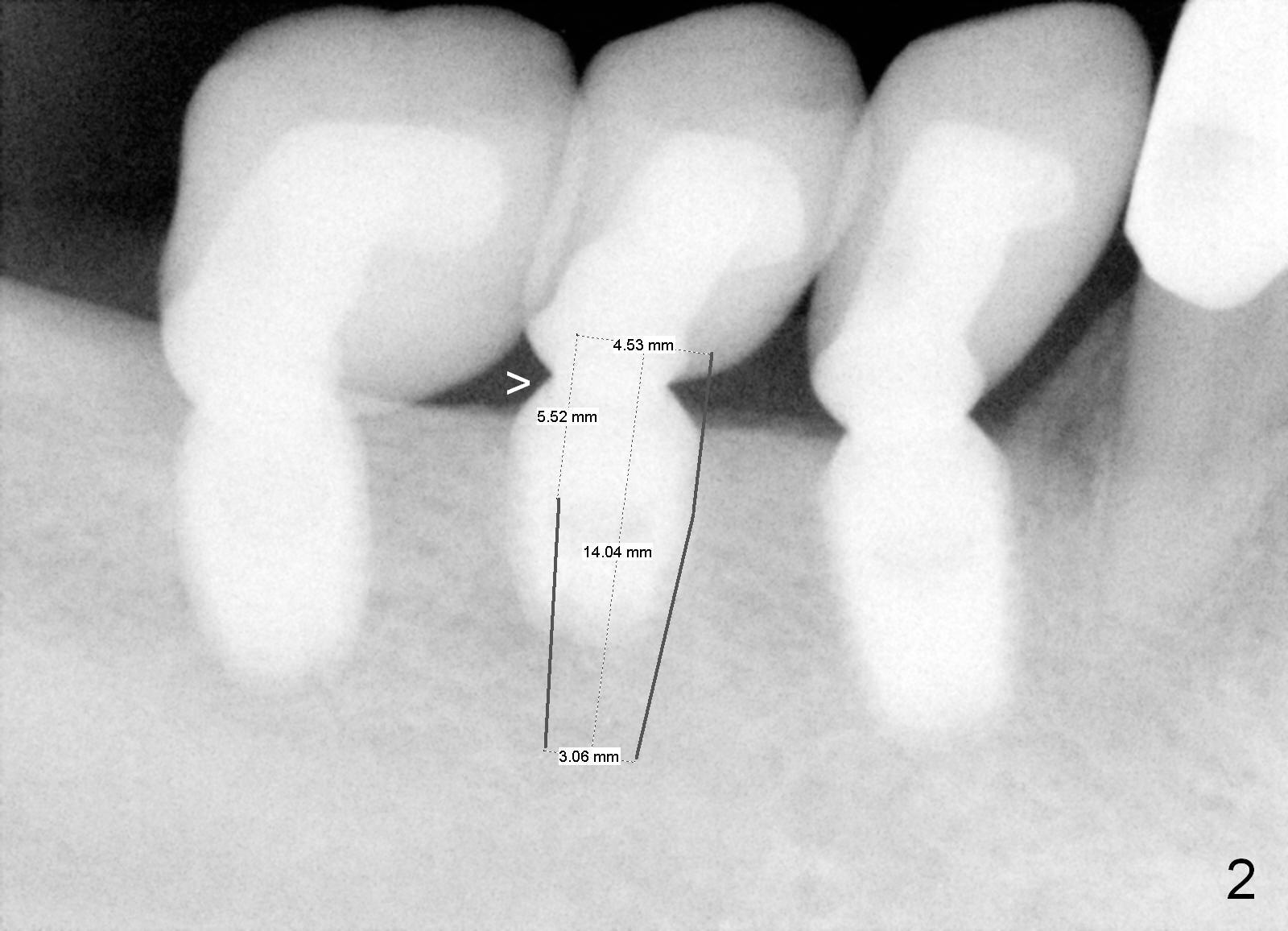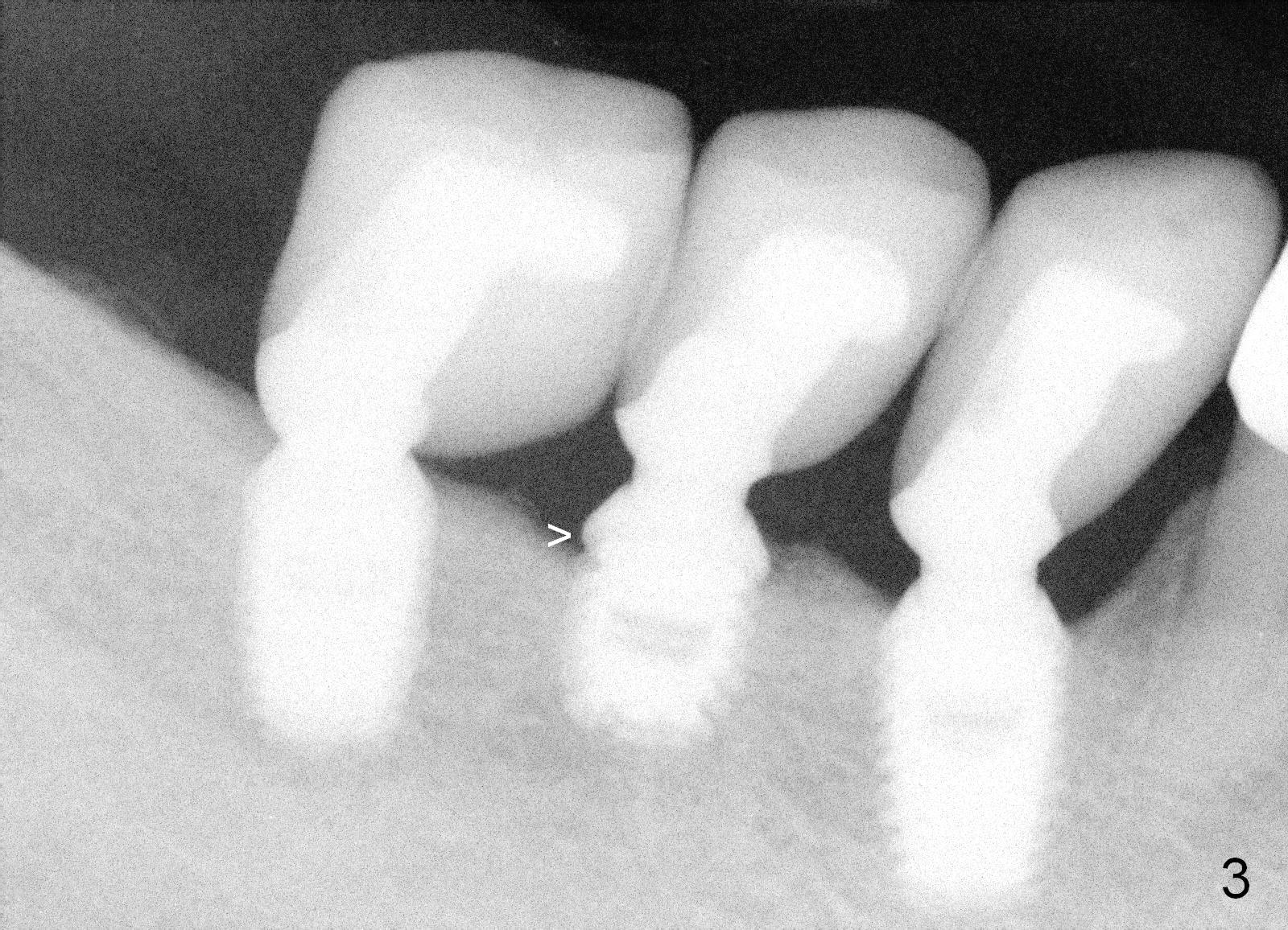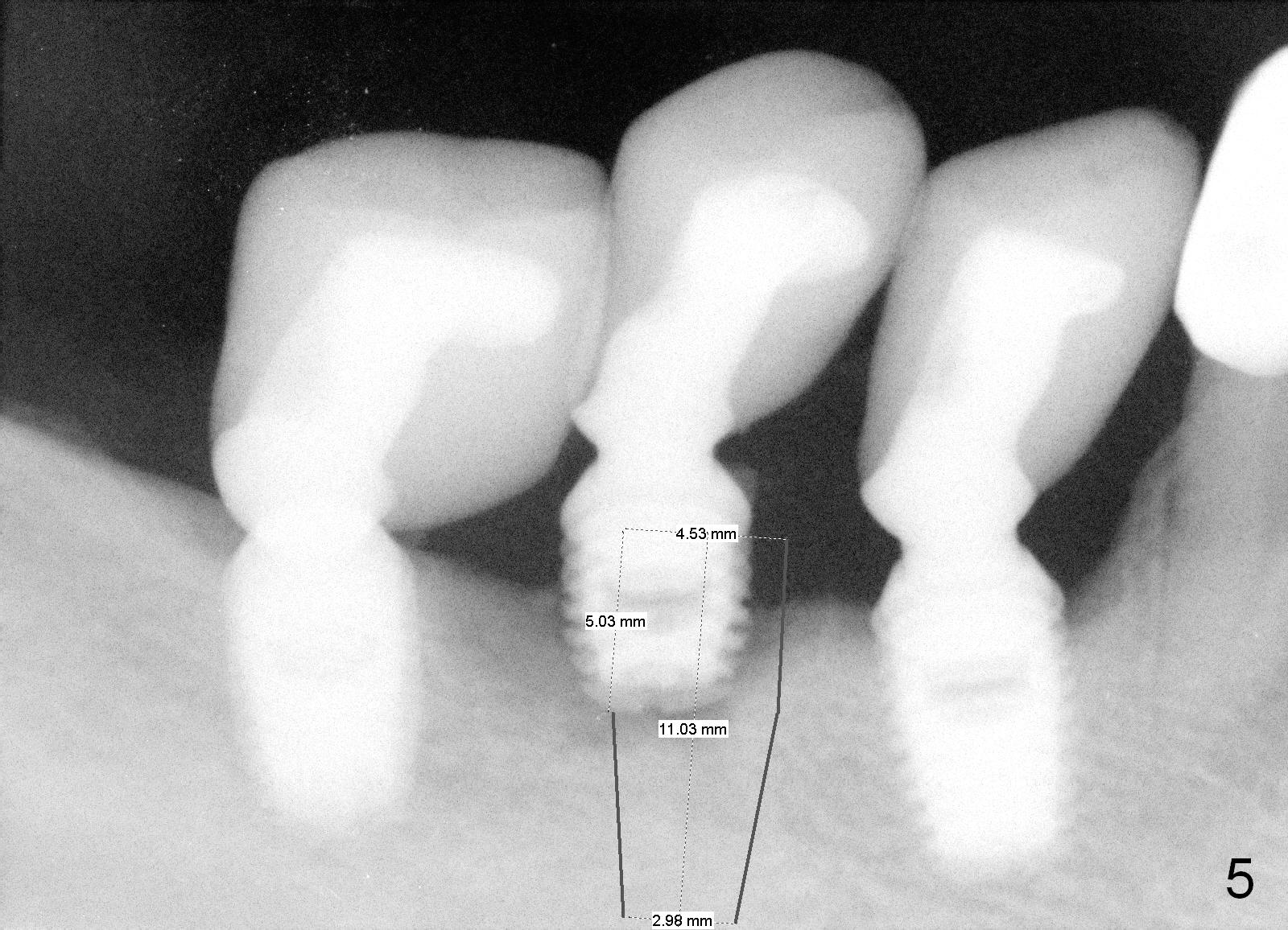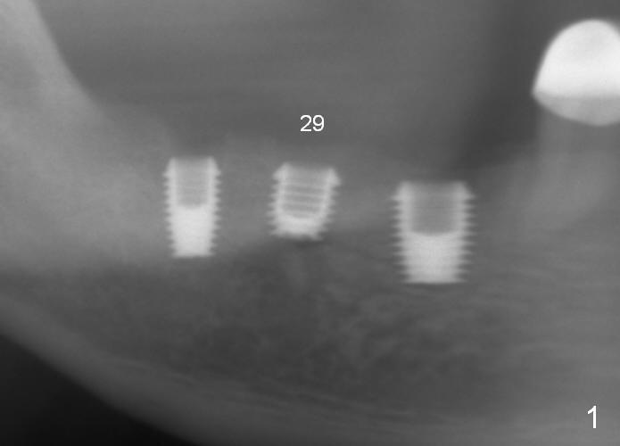 A 48-year-old man had 3 implants placed at #28-30 nearly 10 years ago (Fig.1). The implant at #29 is 4.5x6 mm because of proximity to the Mental Foramen. Bone shows gradual resorption around the implant at #29 two and 5 years postop (Fig. 2,3 >). It became loose when he accidentally bit on a piece of bone (Fig.4). A 4.5x11 (Fig.4) or 14 (Fig.2) mm tissue-level implant will be placed after Metronidazole treatment. CT will be taken tomorrow before surgery to further confirm the bone height. Since the previous implant was placed distally, the new one should be placed more mesially.